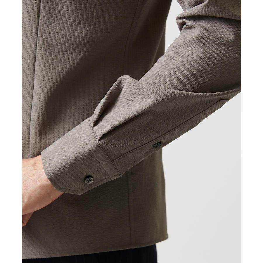 ・台襟には微光沢のトリミングテープをさりげなく配色し、ノータイスタイルでも映える首元のアクセントに。