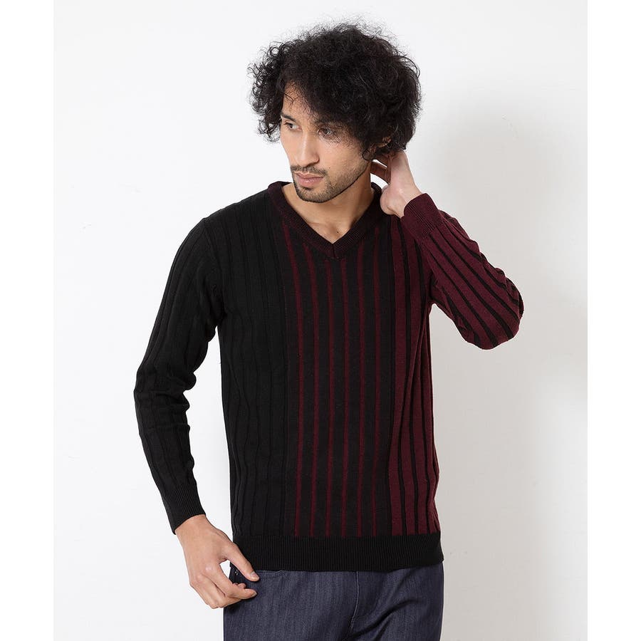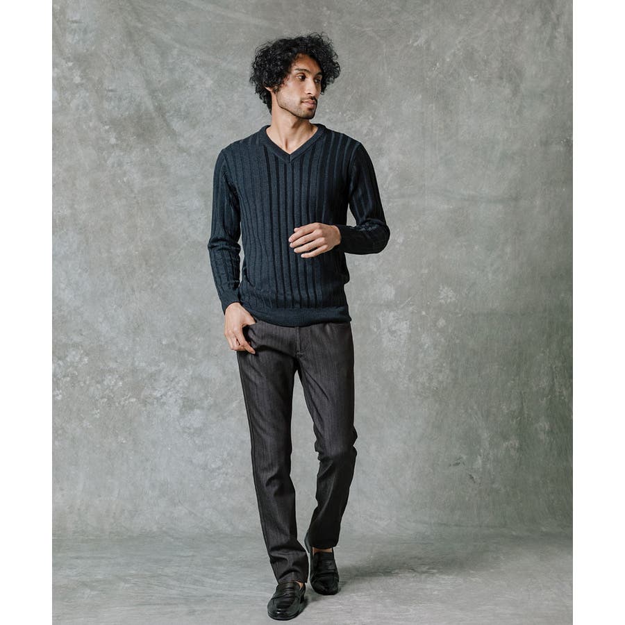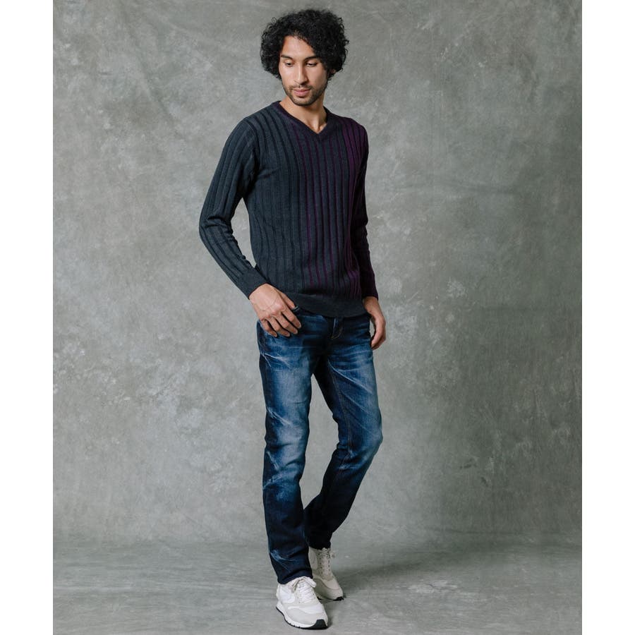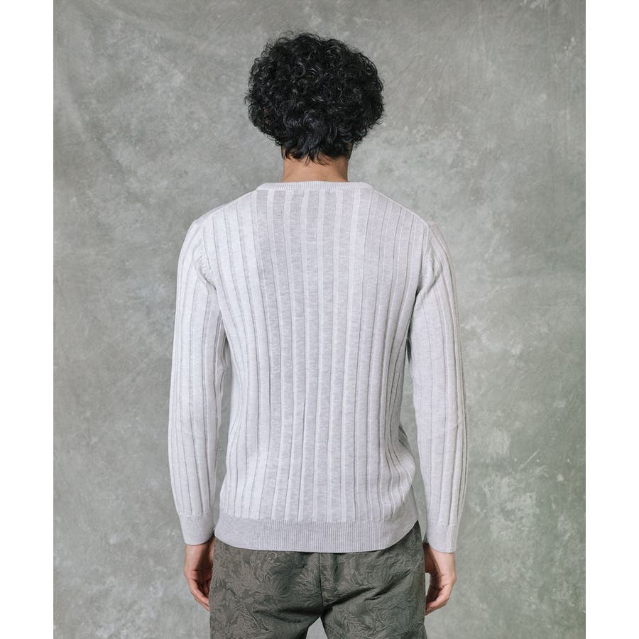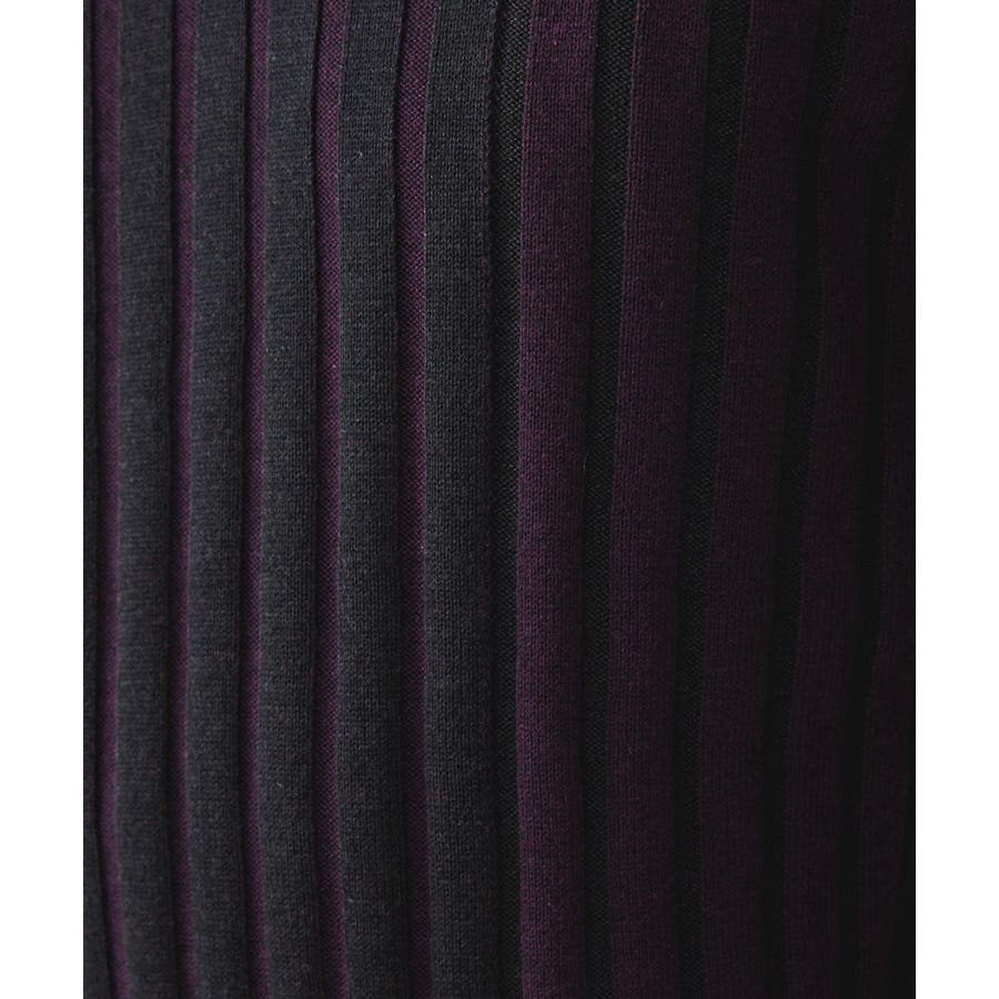 さらにリブの配色を切り替えるためにインターシャ編みいう柄を編むときに使う技術を使い、配色なしのワイドリブ組織に移り変わるテクニカルな拘りセーター
