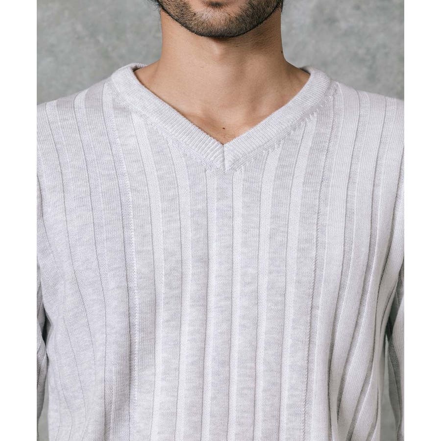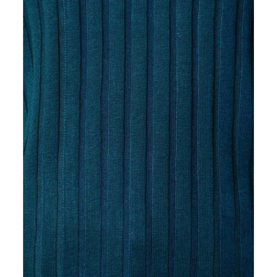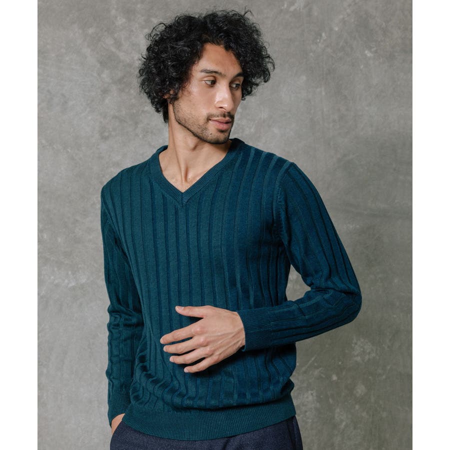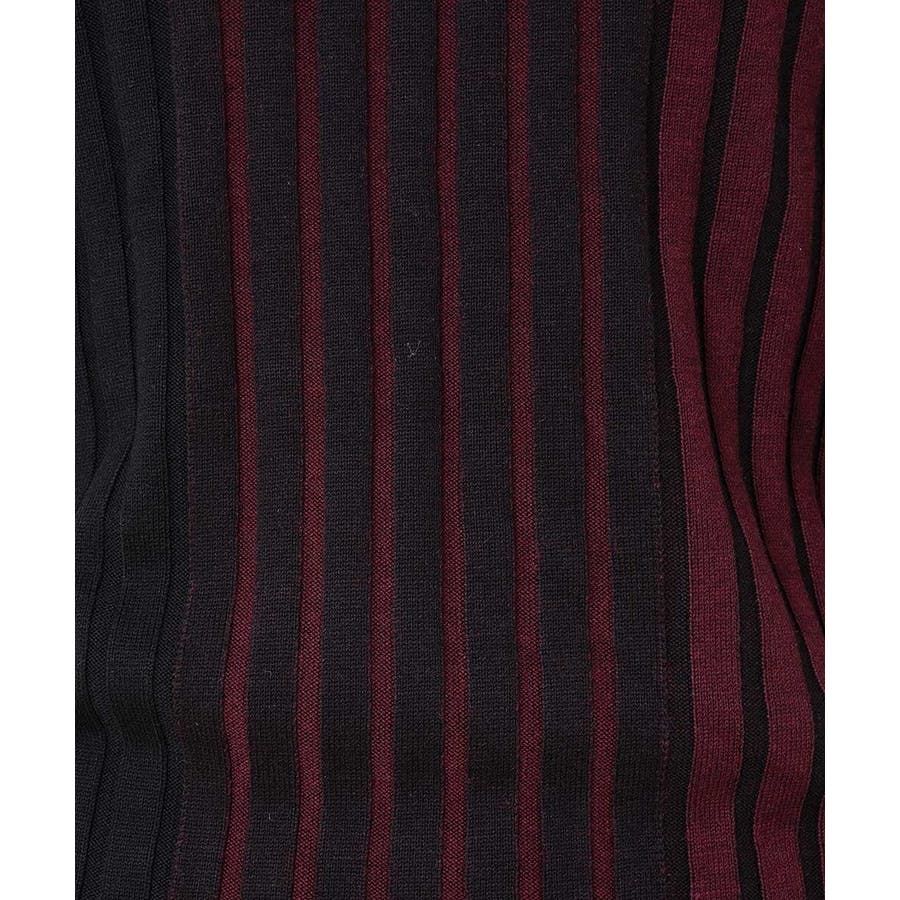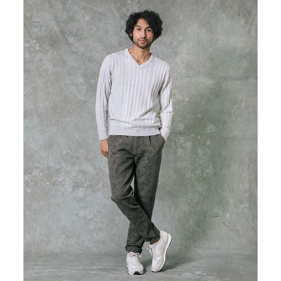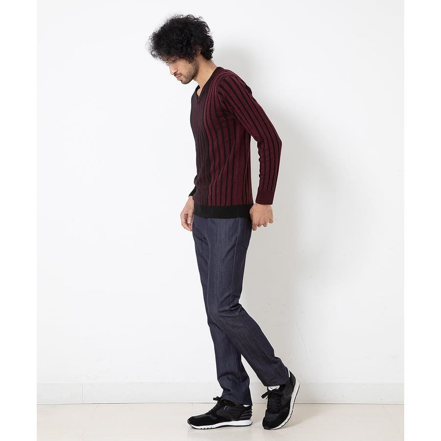 さらにリブの配色を切り替えるためにインターシャ編みいう柄を編むときに使う技術を使い、配色なしのワイドリブ組織に移り変わるテクニカルな拘りセーター