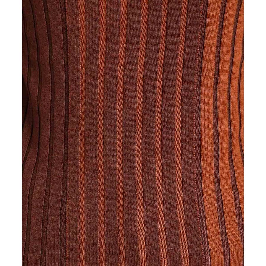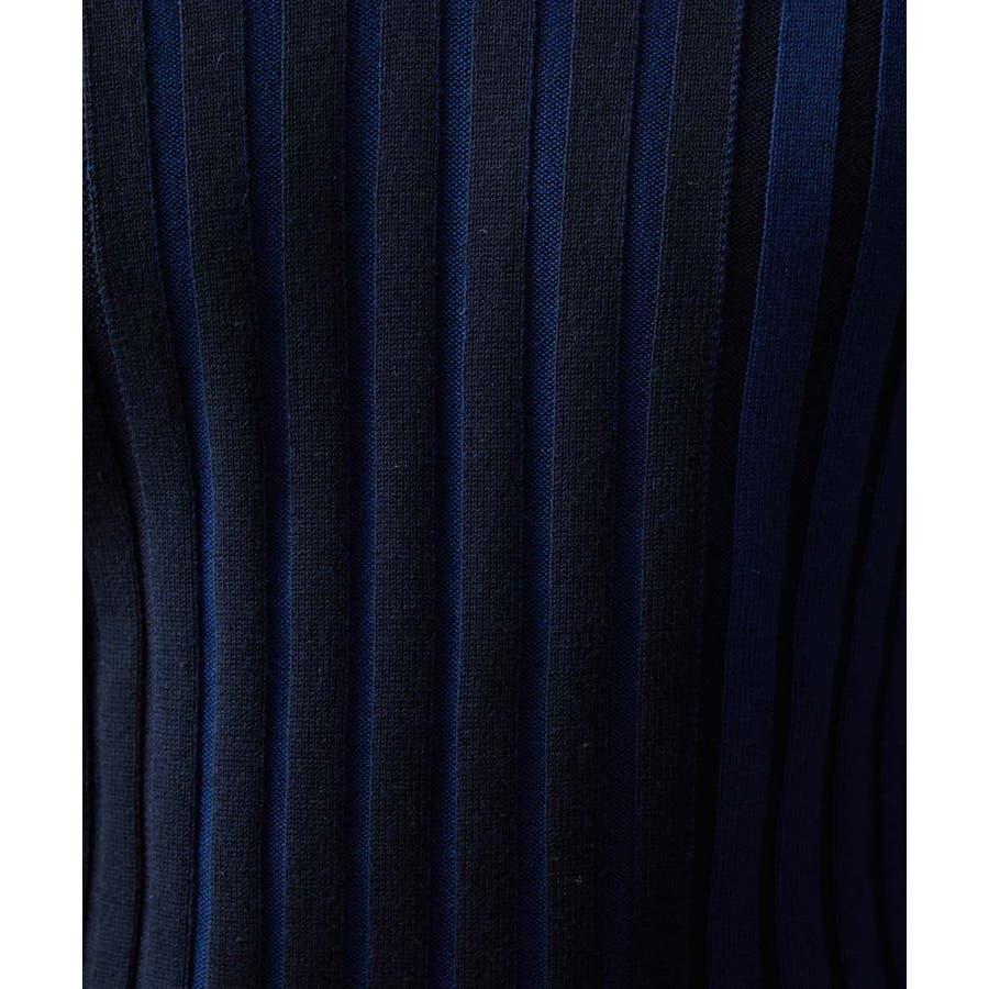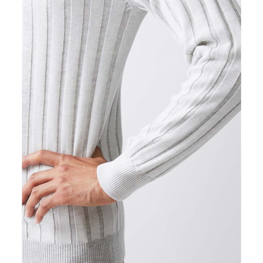 ・さらにリブの配色を切り替えるためにインターシャ編みいう柄を編むときに使う技術を使い、配色なしのワイドリブ組織に移り変わるテクニカルな拘りのセーター