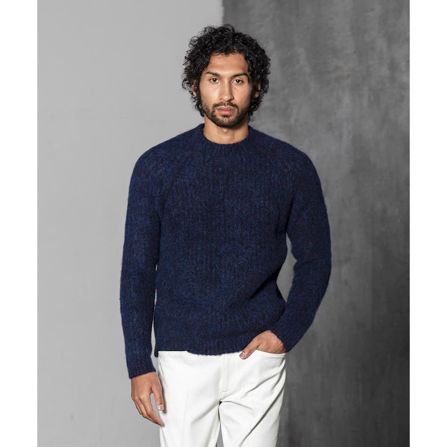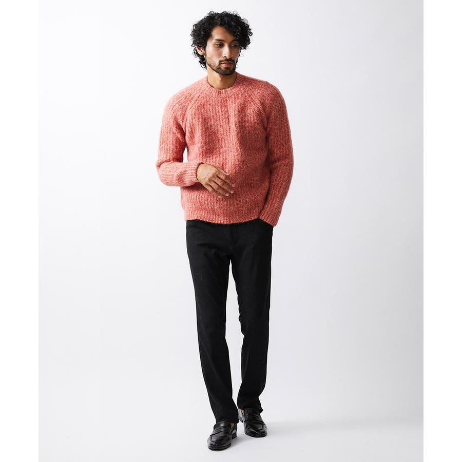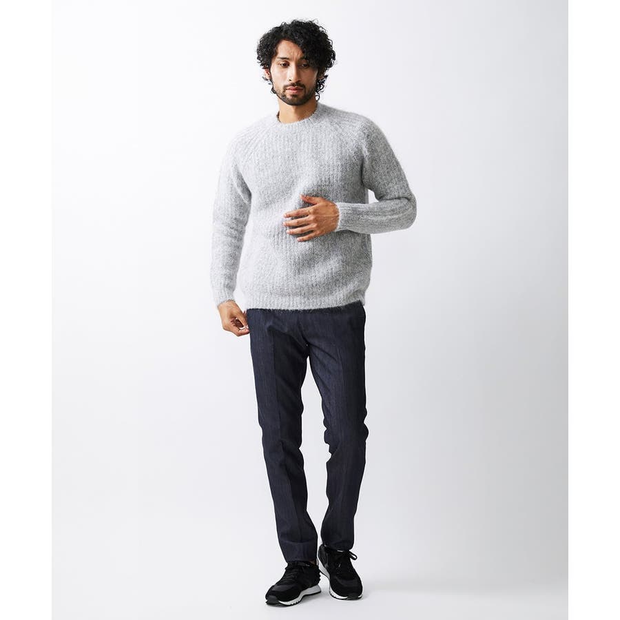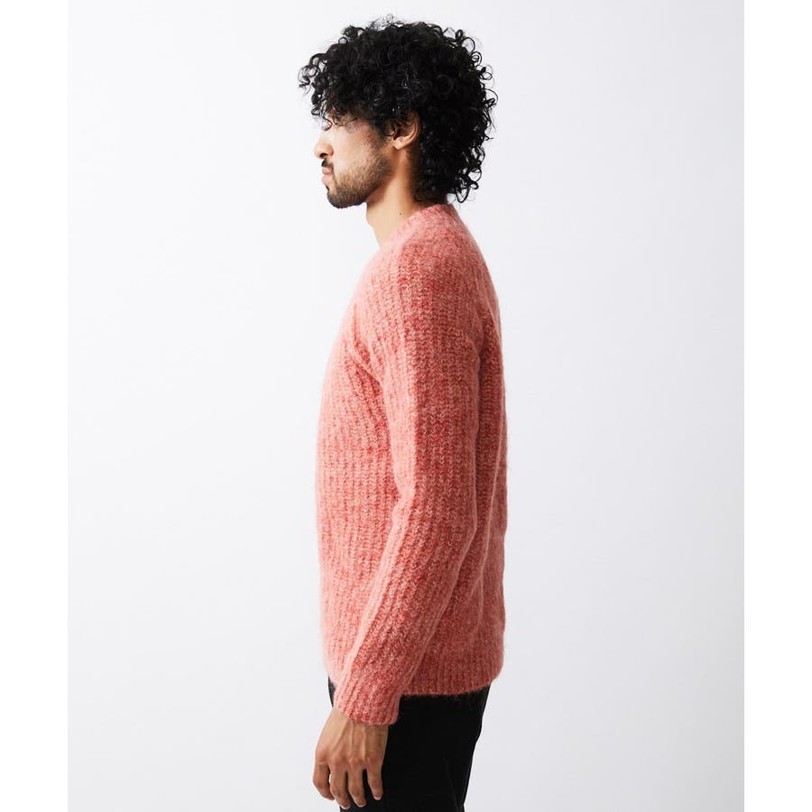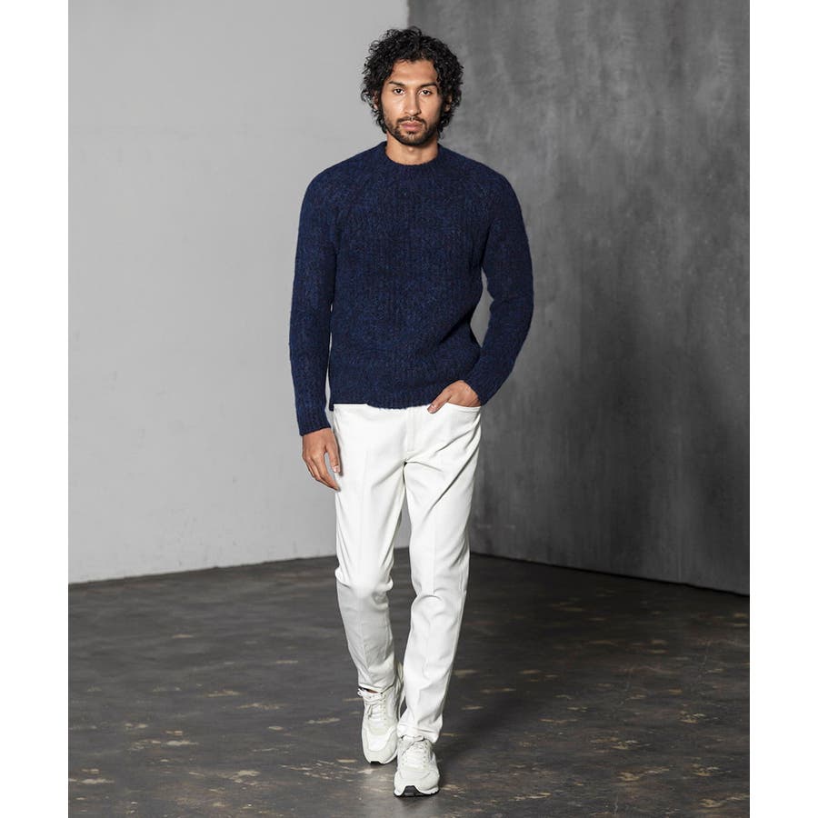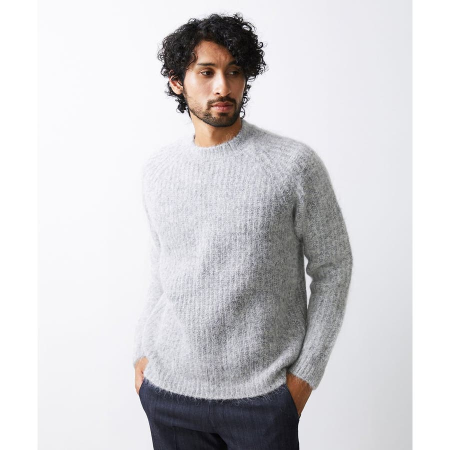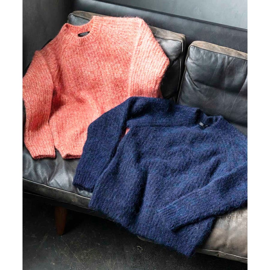 ・3Gで編み上げた温かみあるクルーニット。ローゲージの2色引き揃えで肉感の出た片畦組織