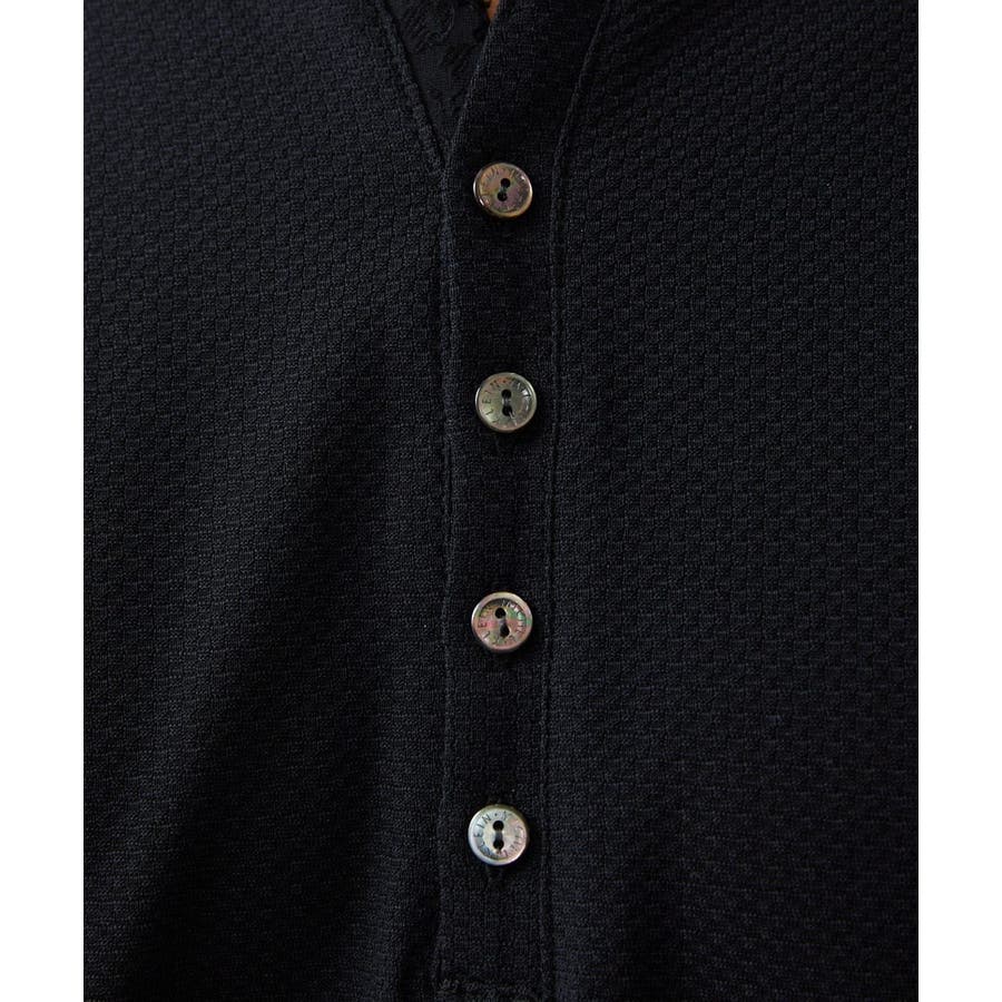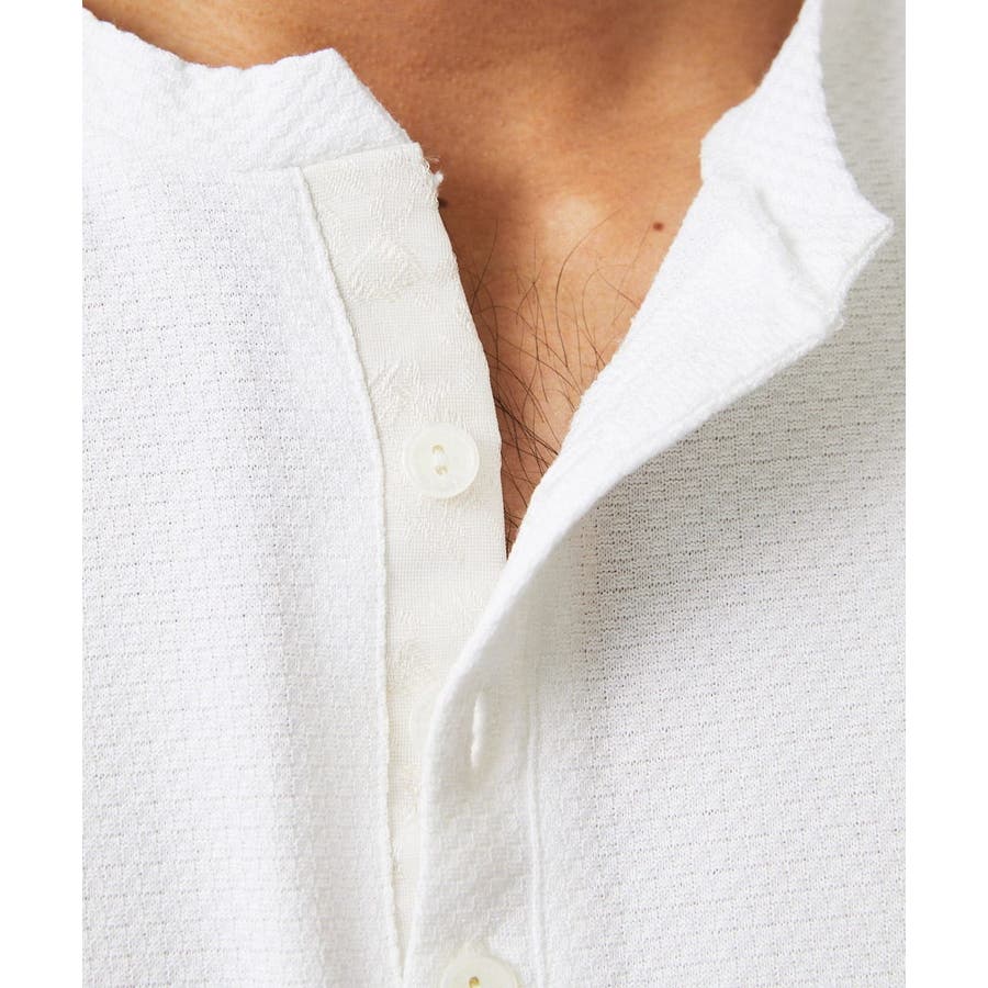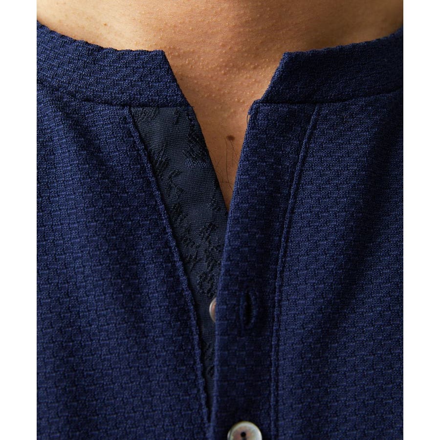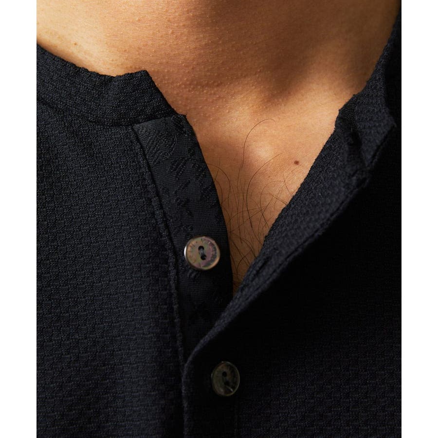 ・首元をすっきりと見せる、開きの深いヘンリーネックデザイン。