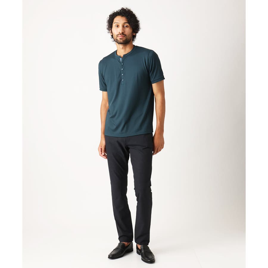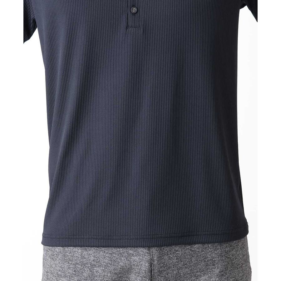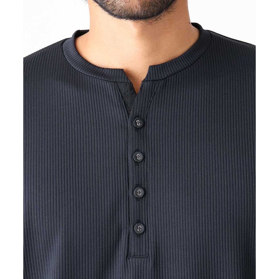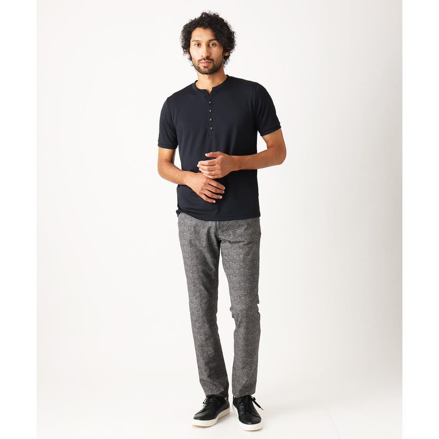 ・ヘンリーネック下前織柄と包み釦を配置したアイキャッチディテール