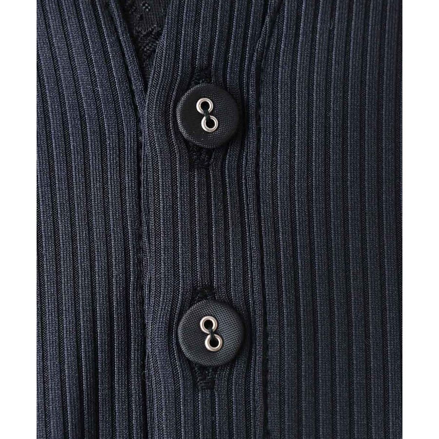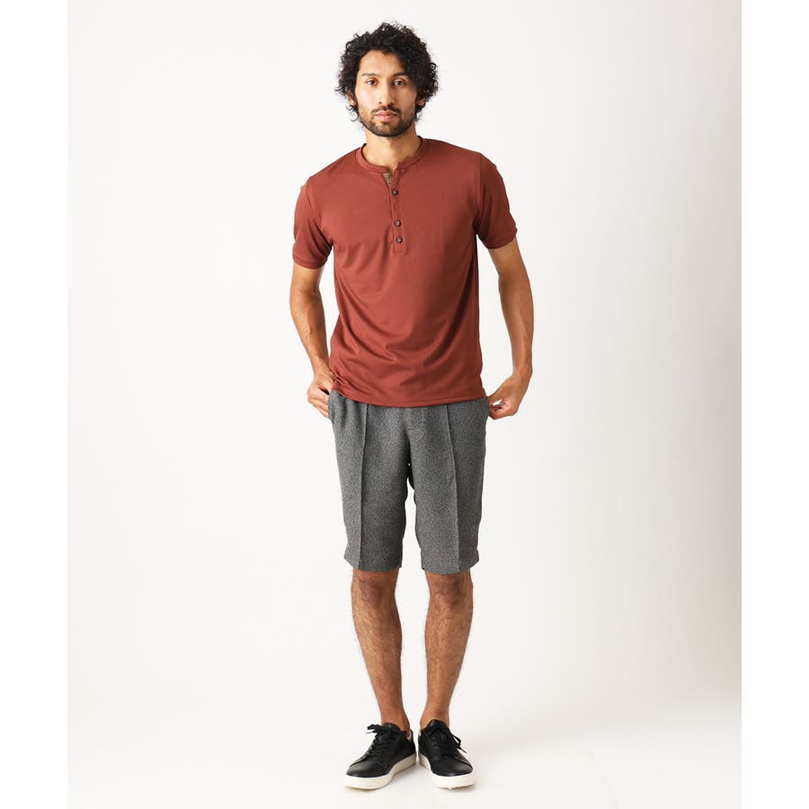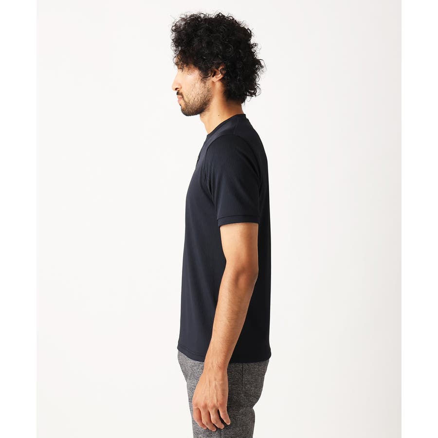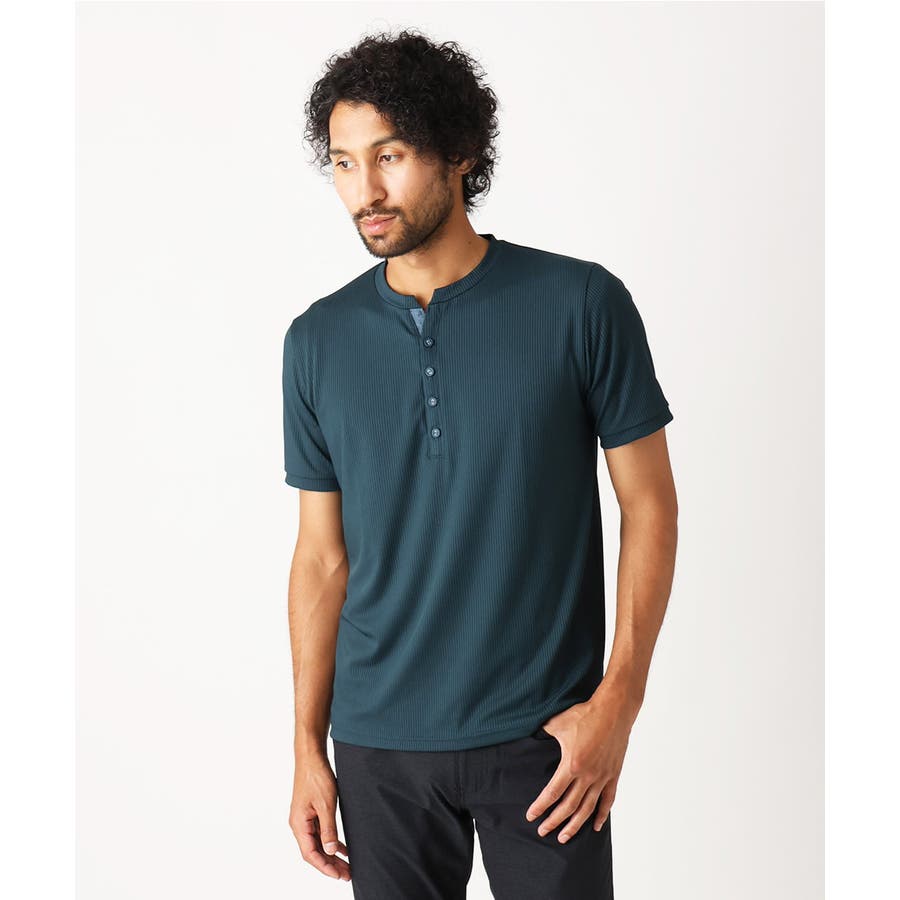 ・ヘンリーネック下前織柄と包み釦を配置したアイキャッチディテール