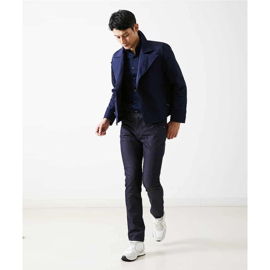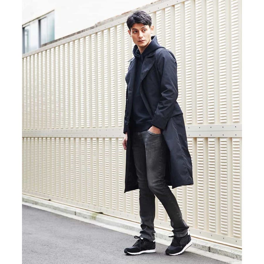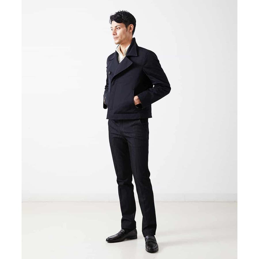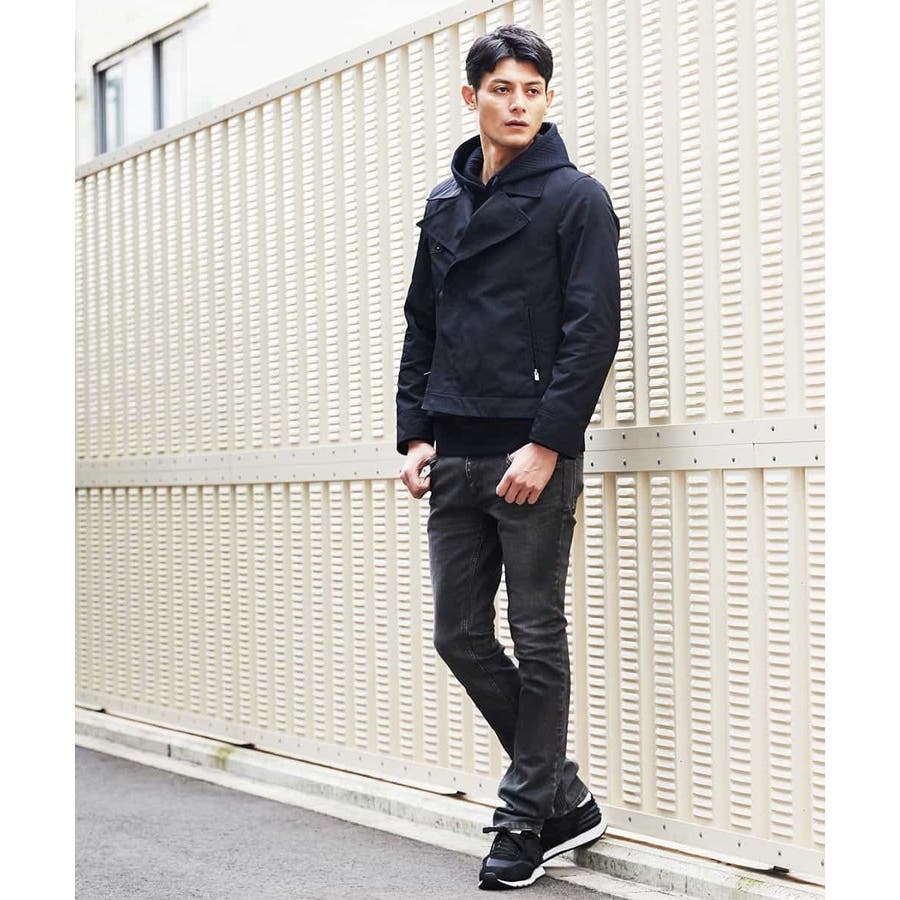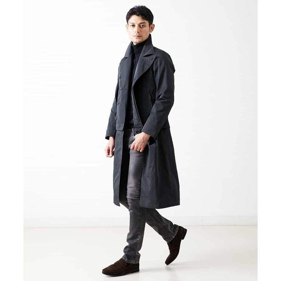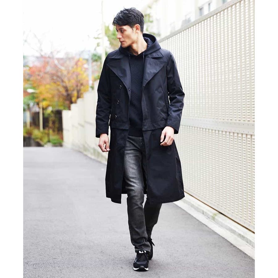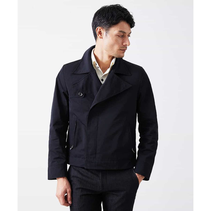 ・比翼仕立てで釦を見せない、ミニマムモードなダブルブレストコート