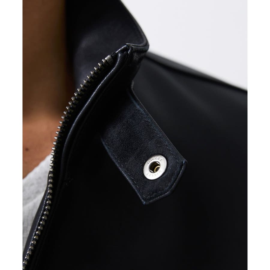 ・衿元を華やかに魅せる、襟高のスタンドカラーデザインのシングルライダースブルゾン
