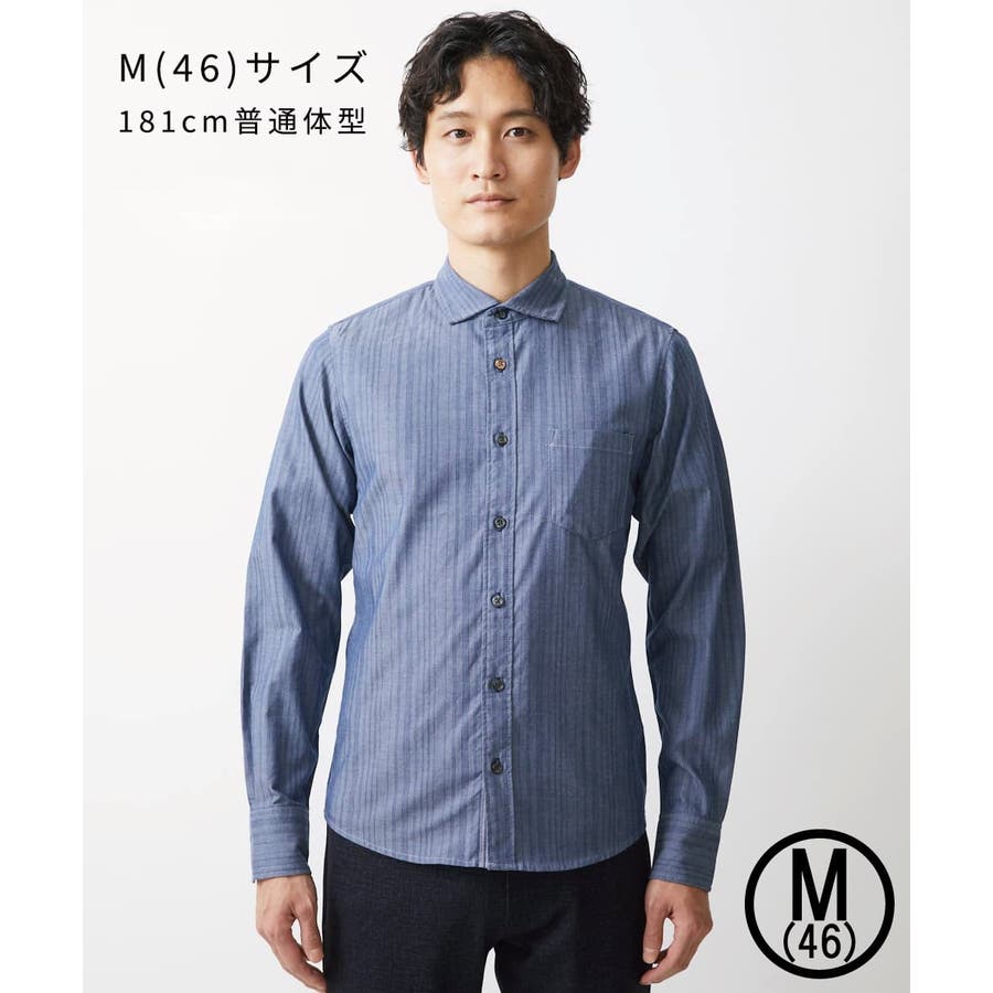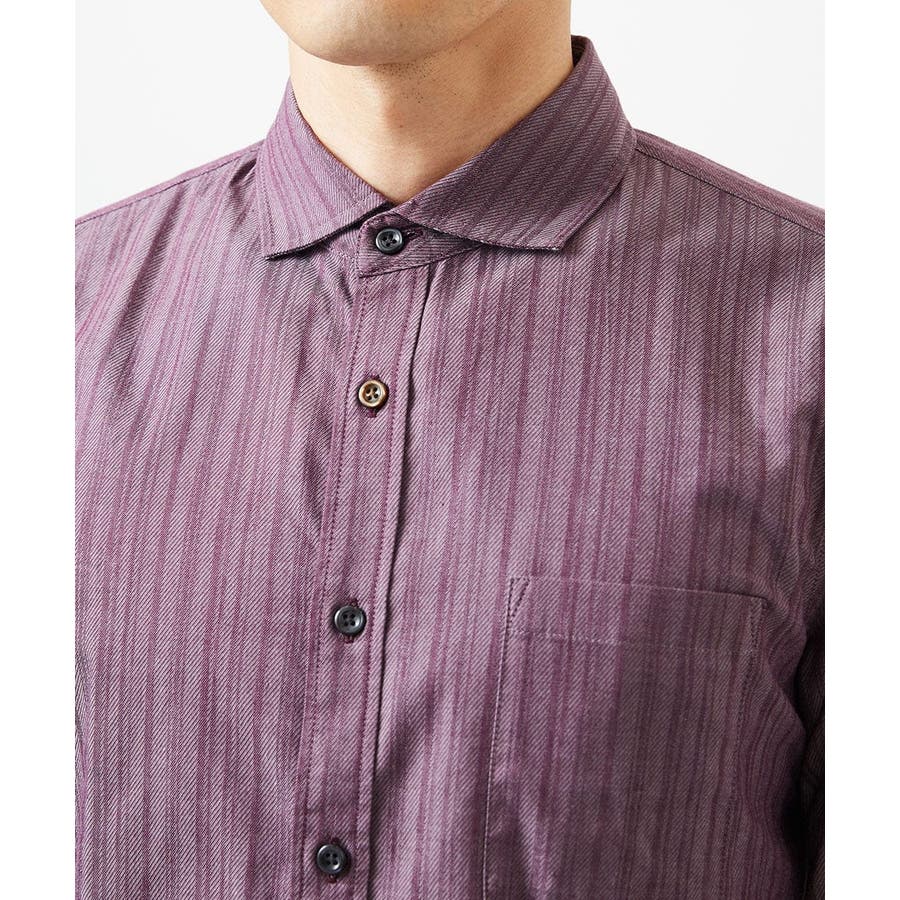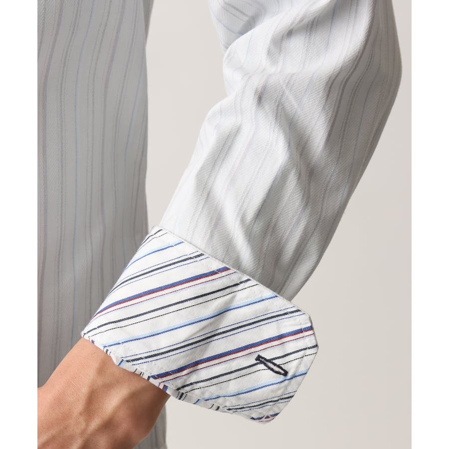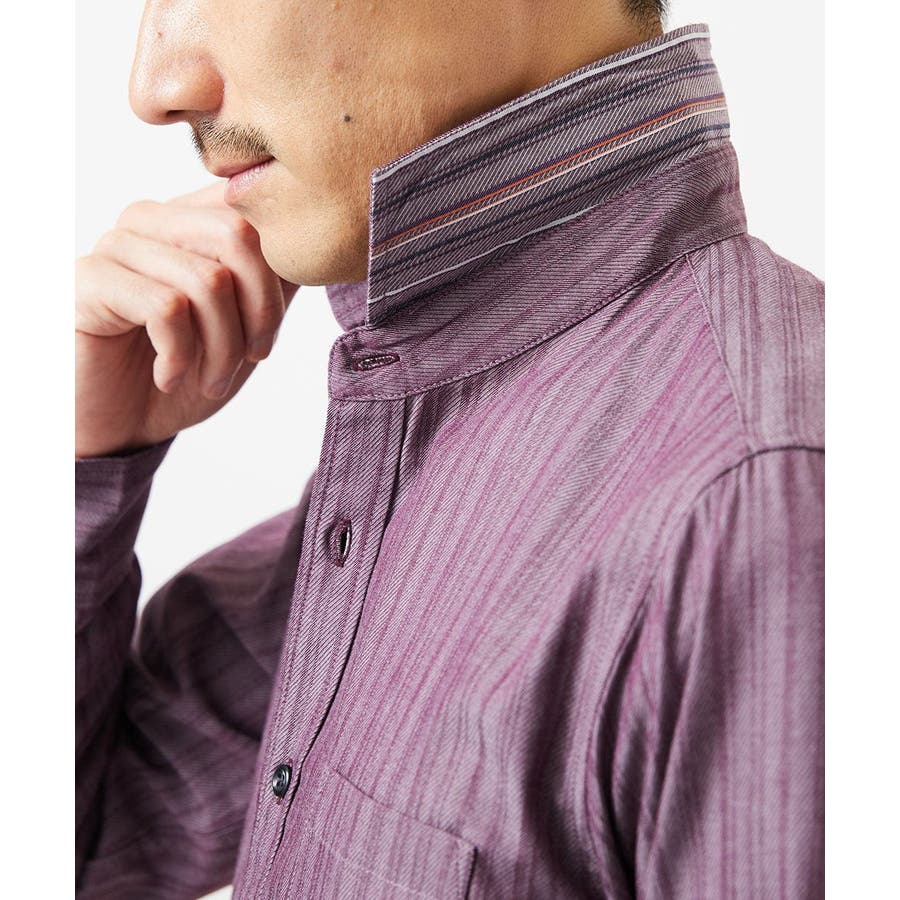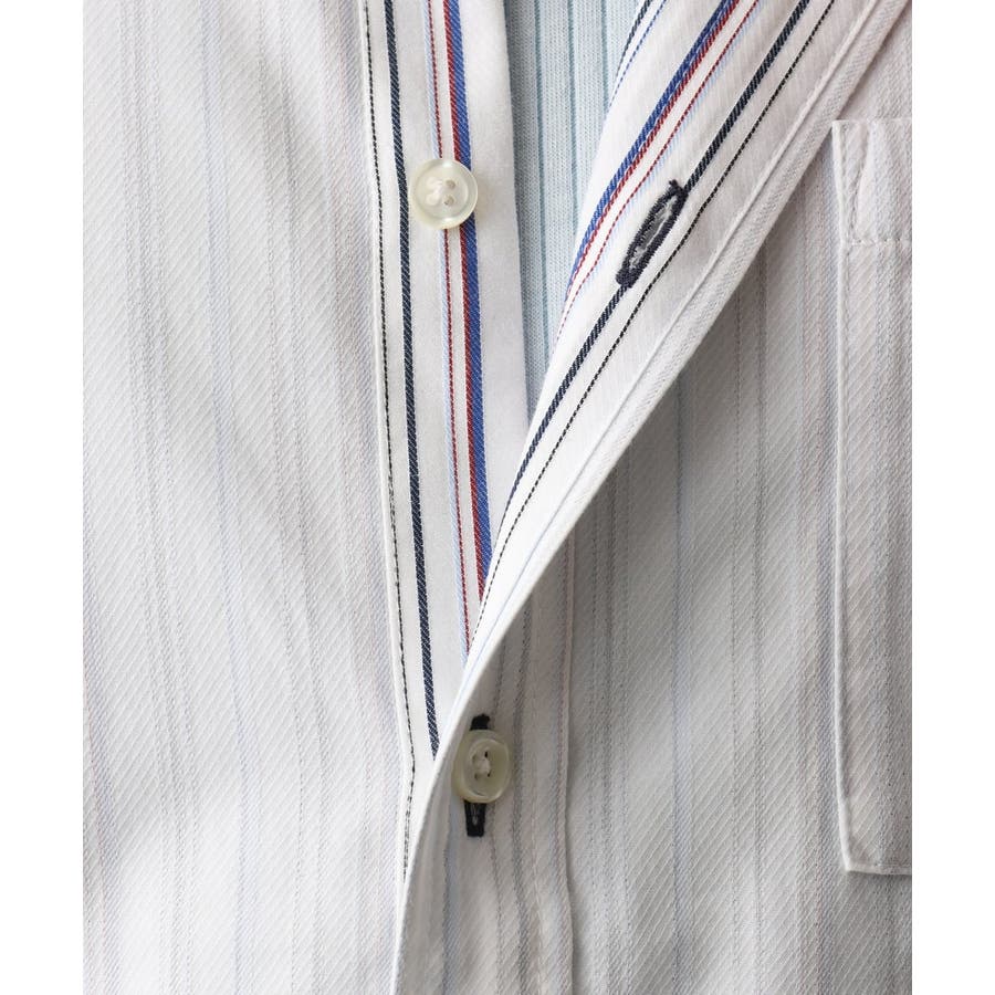 表面はシンプルな無地感覚ながら、裏面にはストライプ柄がさりげなく施されていて、さりげないアクセントが他のシャツにはない魅力を引き立てます。