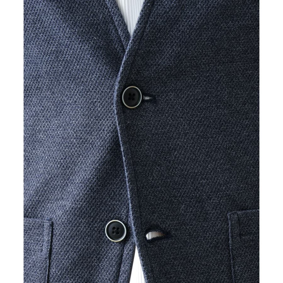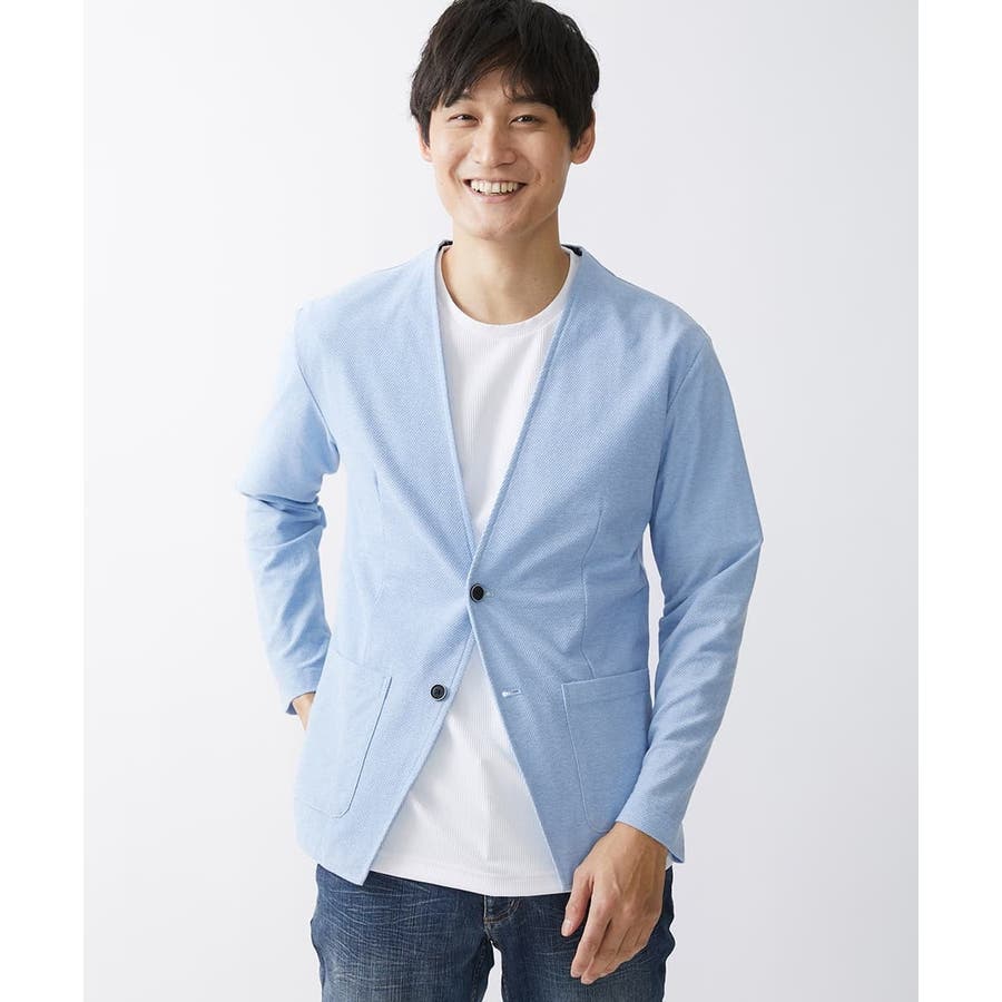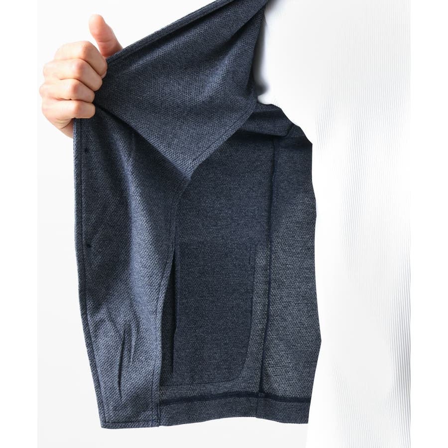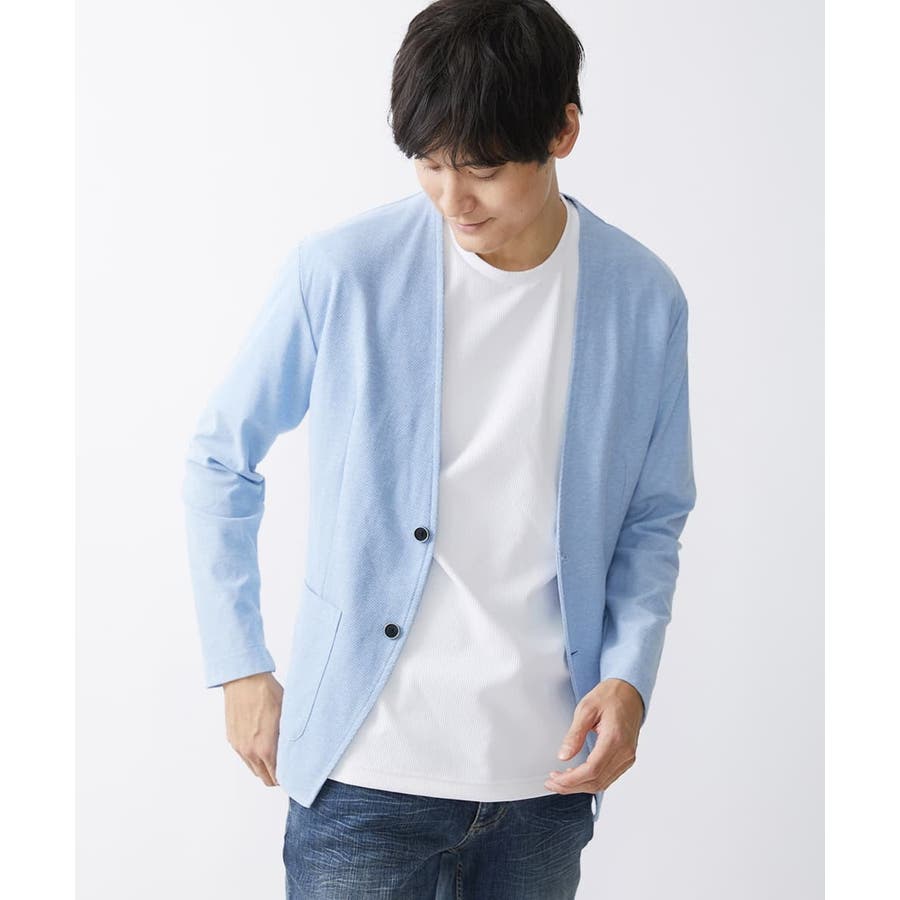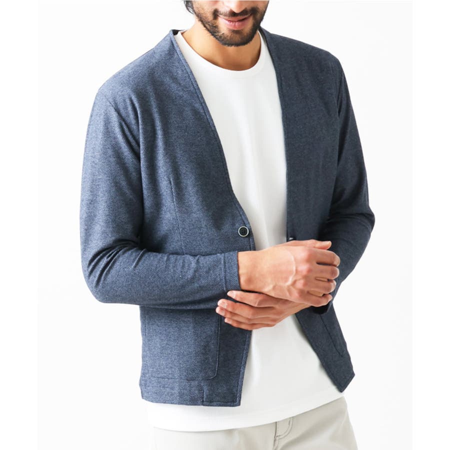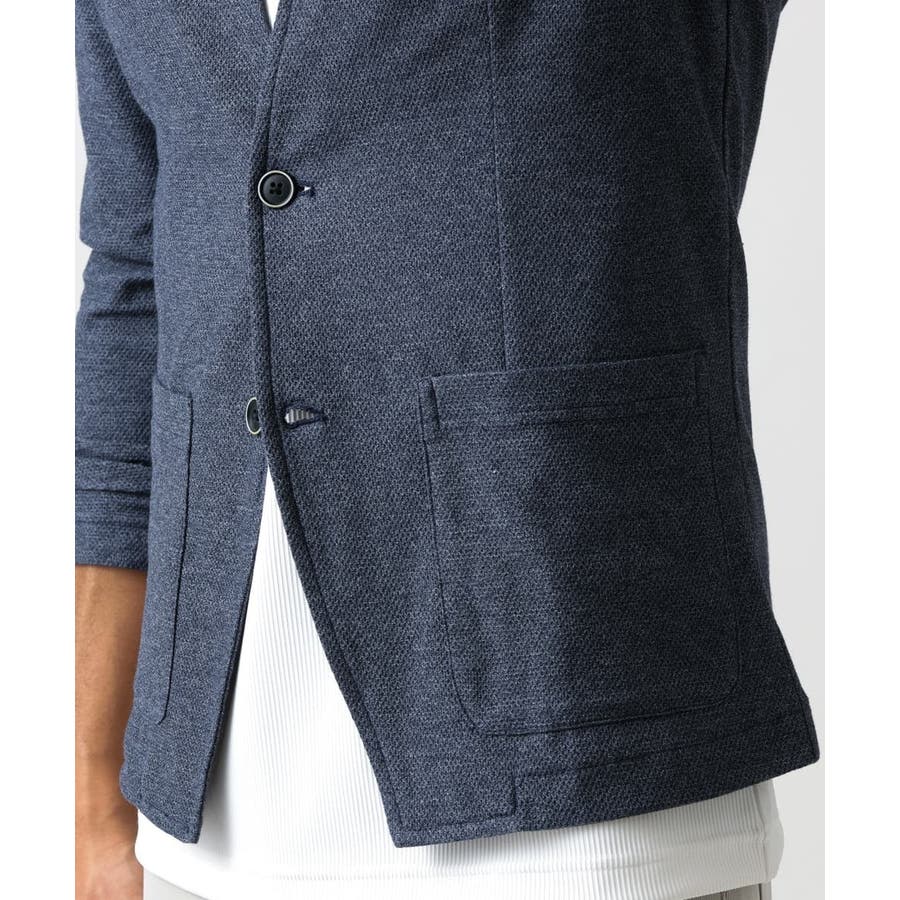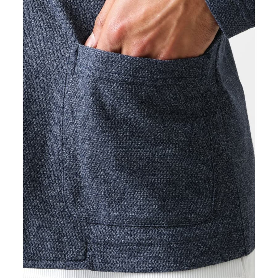 <素材> ・コットン/ポリエステル糸を使用した薄手のジャージ素材。 ・ハニカム(ハチの巣)の形状面を表面に使用し、立体的な表情で涼しげな印象です。 ・染め分けによるシャンブレー感が特徴です。 <デザイン、機能> ・衿元がスッキリしたノーカラーのカーディガンタイプのジャケット羽織りデザイン。 ・前後身頃にダーツをとり、立体的なシルエットにこだわりました。 ・腰ポケットはカジュアルな印象のパッチポケットを採用。 ・ジャージ素材なので気温によって袖のロールアップも可能。 ・背当てにはストライプ柄のシャツ生地を使用しアクセントにしました。 <生地感> ・裏地⇒なし・生地厚さ⇒ふつう ・伸縮性⇒あり