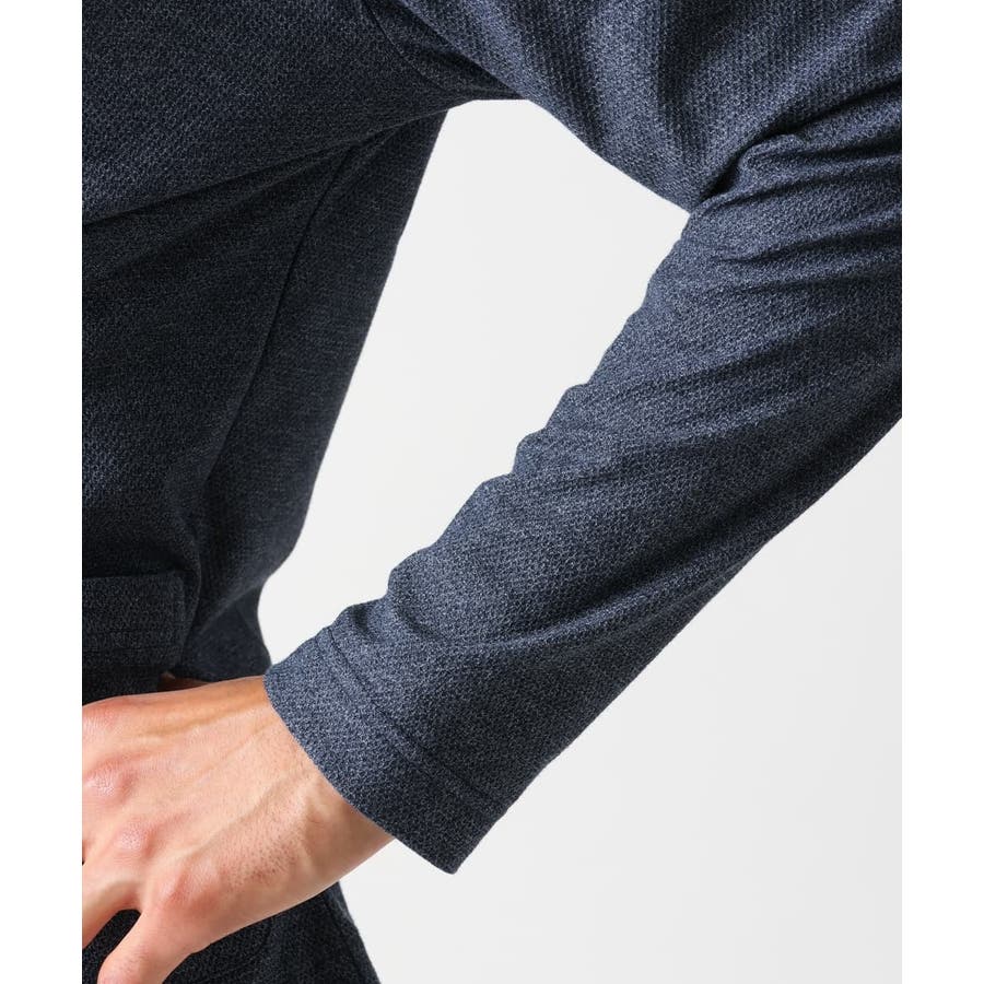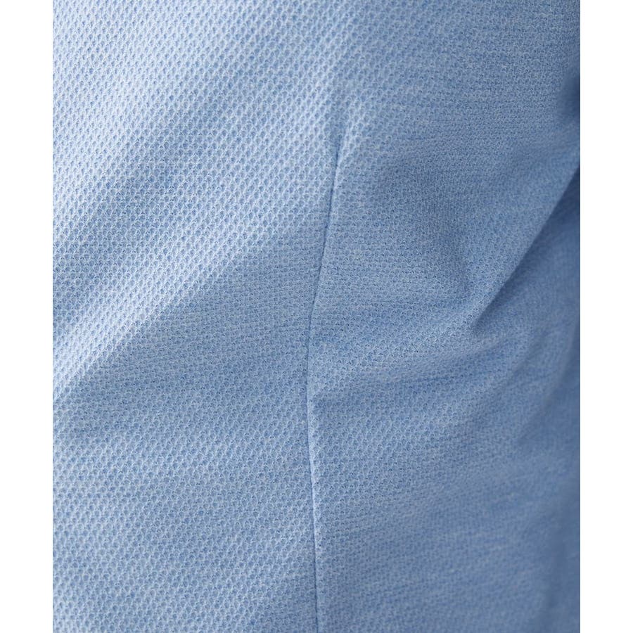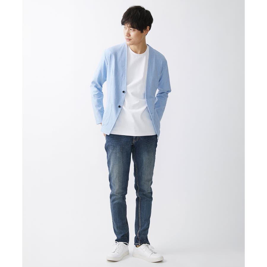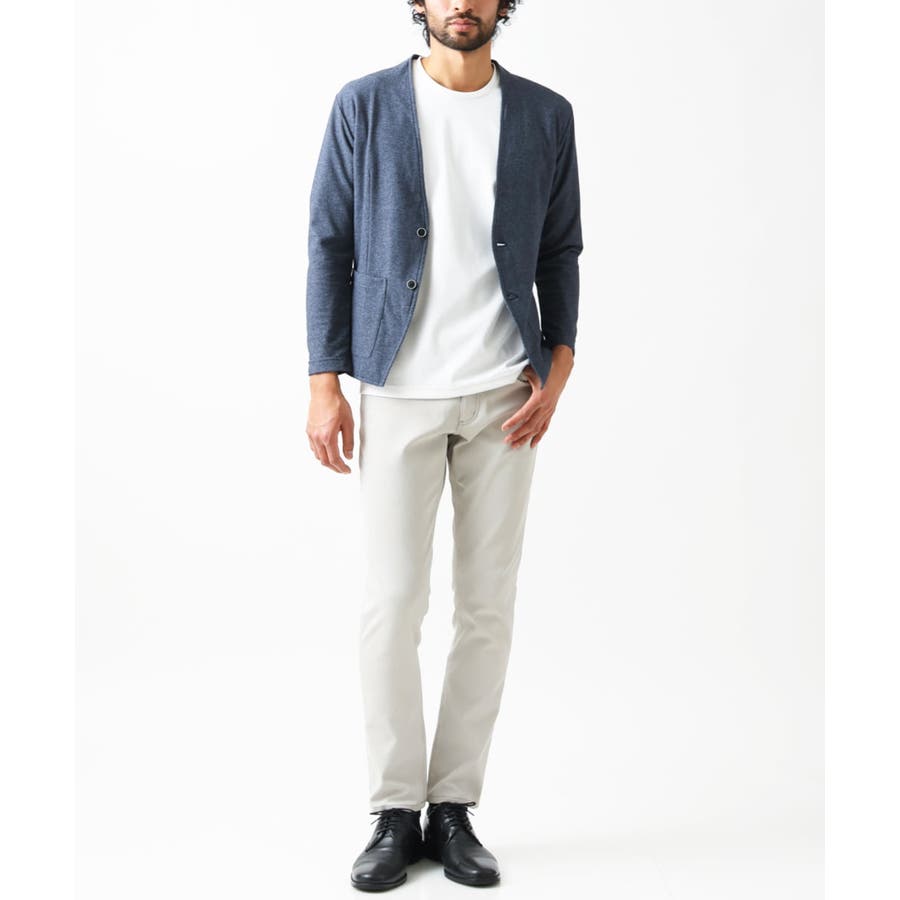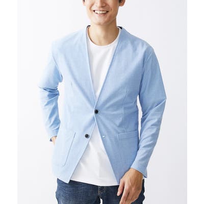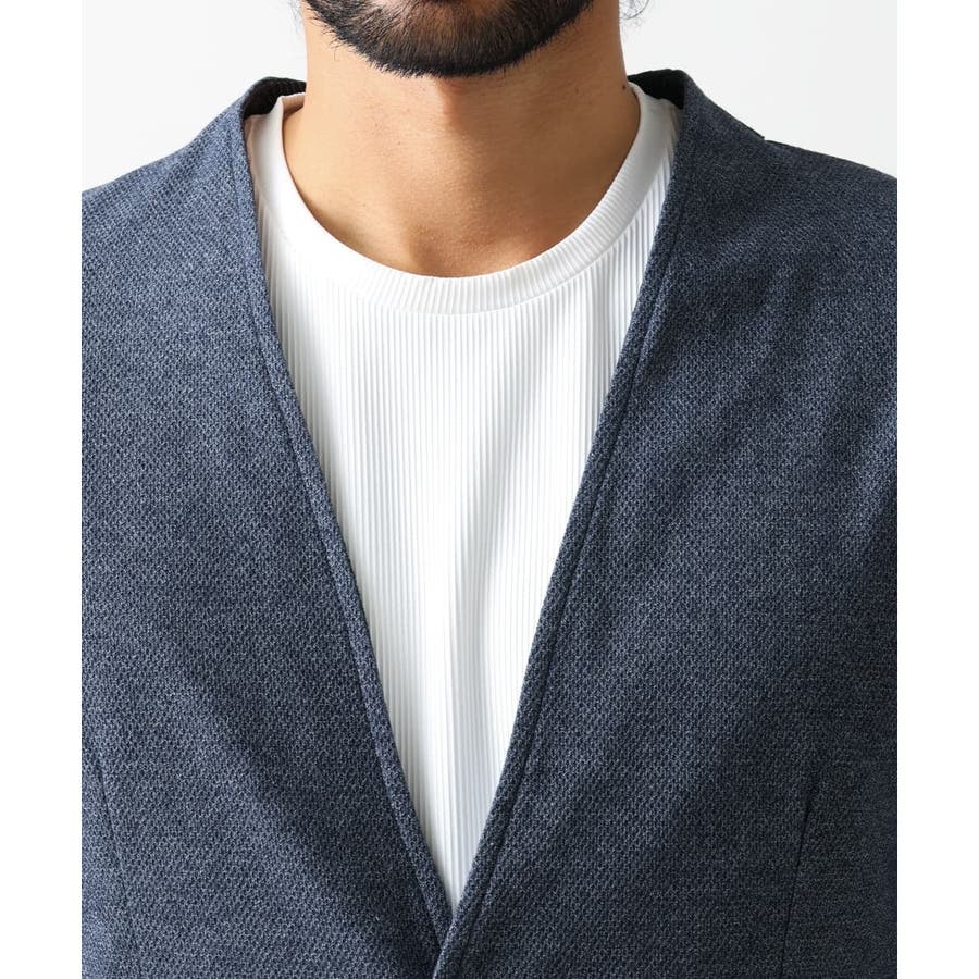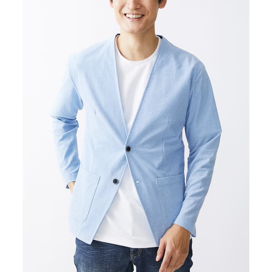 <素材> ・コットン/ポリエステル糸を使用した薄手のジャージ素材。 ・ハニカム(ハチの巣)の形状面を表面に使用し、立体的な表情で涼しげな印象です。 ・染め分けによるシャンブレー感が特徴です。 <デザイン、機能> ・衿元がスッキリしたノーカラーのカーディガンタイプのジャケット羽織りデザイン。 ・前後身頃にダーツをとり、立体的なシルエットにこだわりました。 ・腰ポケットはカジュアルな印象のパッチポケットを採用。 ・ジャージ素材なので気温によって袖のロールアップも可能。 ・背当てにはストライプ柄のシャツ生地を使用しアクセントにしました。 <生地感> ・裏地⇒なし・生地厚さ⇒ふつう ・伸縮性⇒あり