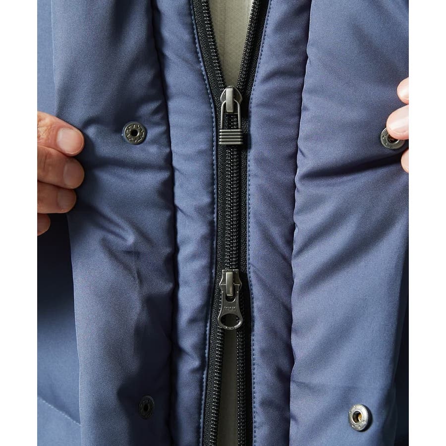 ⇒防寒性を求められる「前後身頃」・「外袖」・「衿」・「フード」にはダウンを使用し、軽さと保温性をしっかり確保。一方で、動きの多い「脇」・「前立て」・「内袖」・「フード前端」には軽量な中綿を配置することで、着心地の軽さや動きやすさにも配慮し、防寒と機動性、両立を追求した設計です。