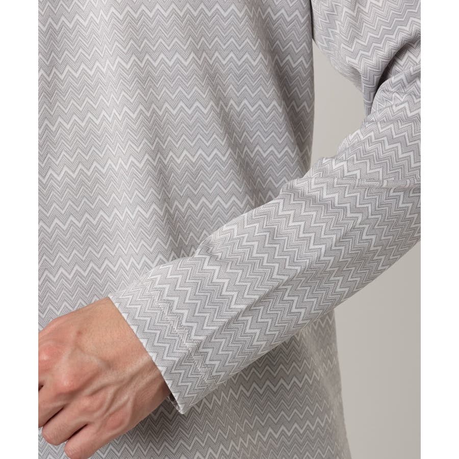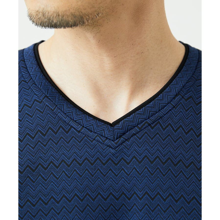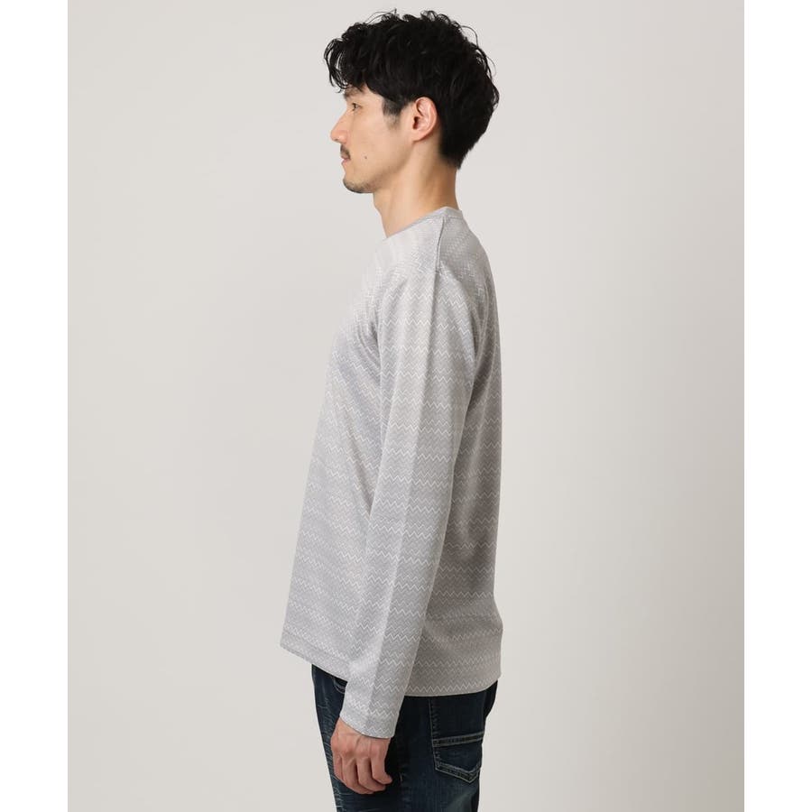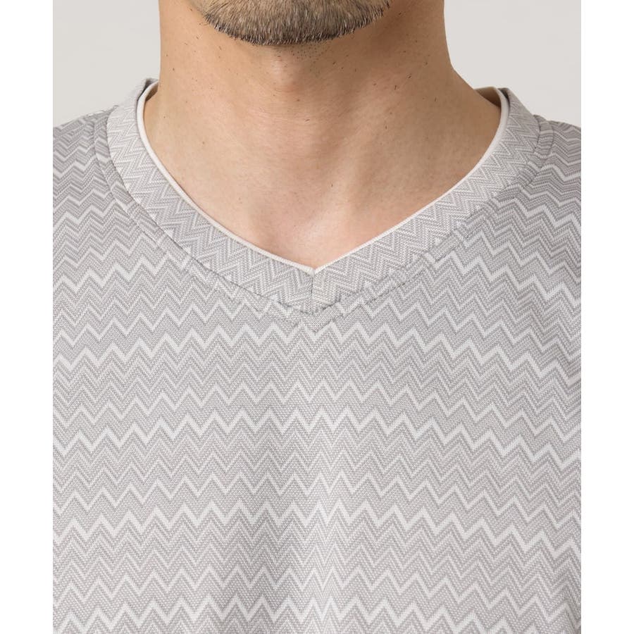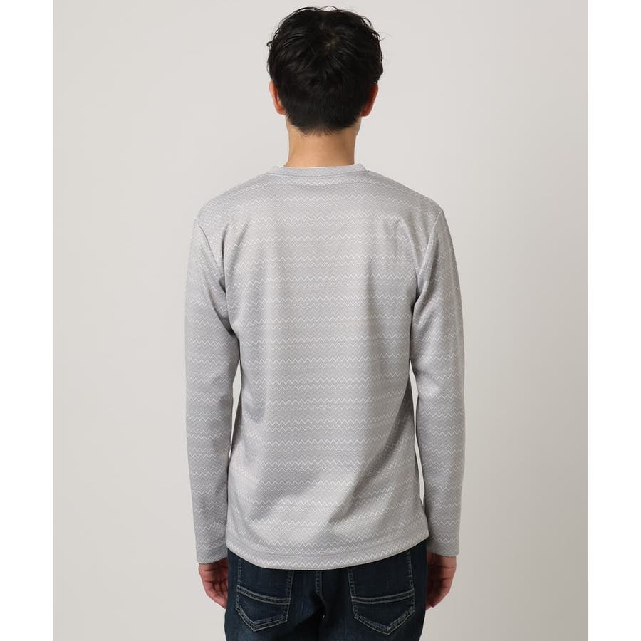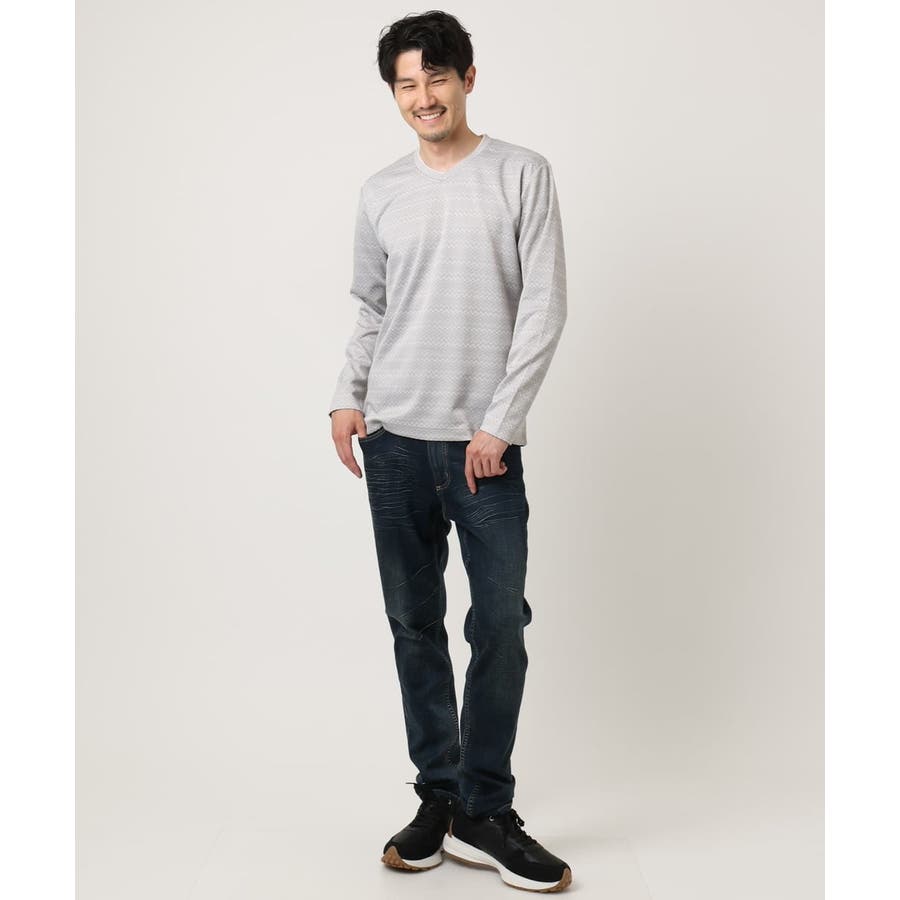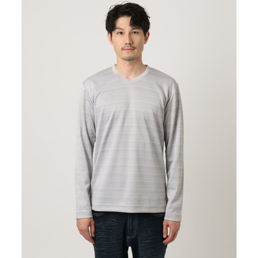 ≪素材≫ ・さらっとした心地よい肌触りのポリエステル素材で、季節を問わず快適に着ていただけます。 ・プリントではなく、編み模様によって柄が表現されているのが特徴です。 ・インナーに合わせやすい、ハイゲージ素材です。 ・ハイゲージ:細い糸を使って目の詰まった編み方をした生地です。 ≪デザイン≫ ・首元がすっきりとしたVネックデザインの長袖Tシャツです。程よい開きで顔まわりをシャープに見せ、シンプルながら上品な印象を与えます。 ・衿は別布を使用したレイヤード仕様になっており、立体感が生まれています。 ・1枚で存在感のあるデザインですが、シンプルなボトムスとも好相性で、コーディネートに悩まず着こなせます。 ≪生地感≫ ・透け感⇒無し ・生地の厚さ⇒普通 ・伸縮性⇒有り