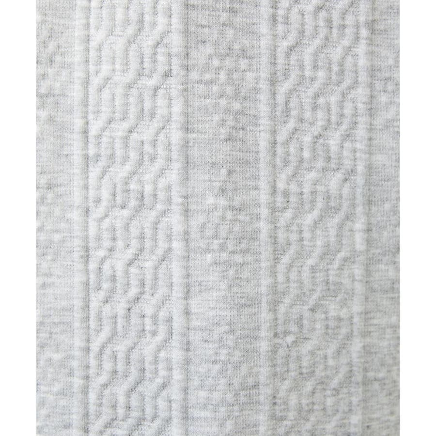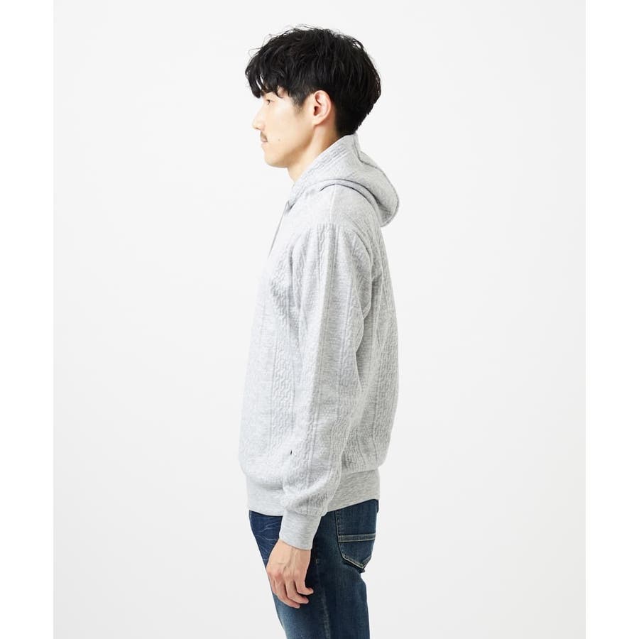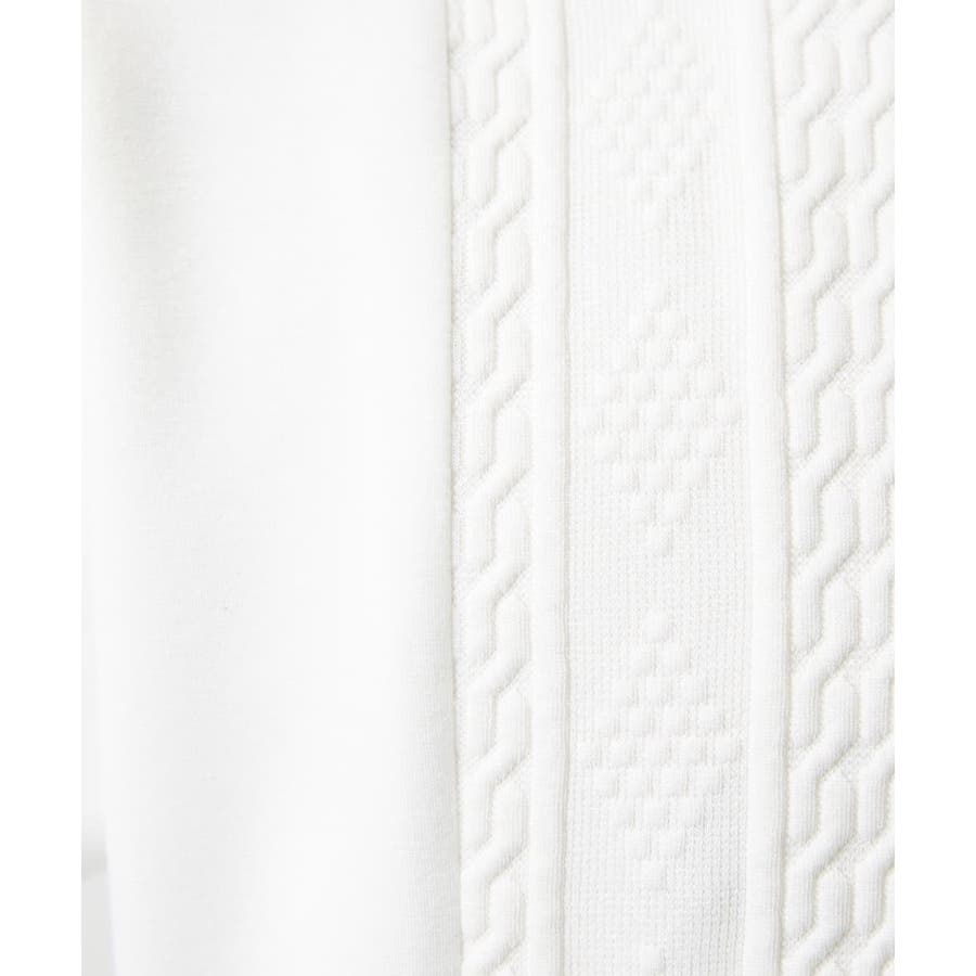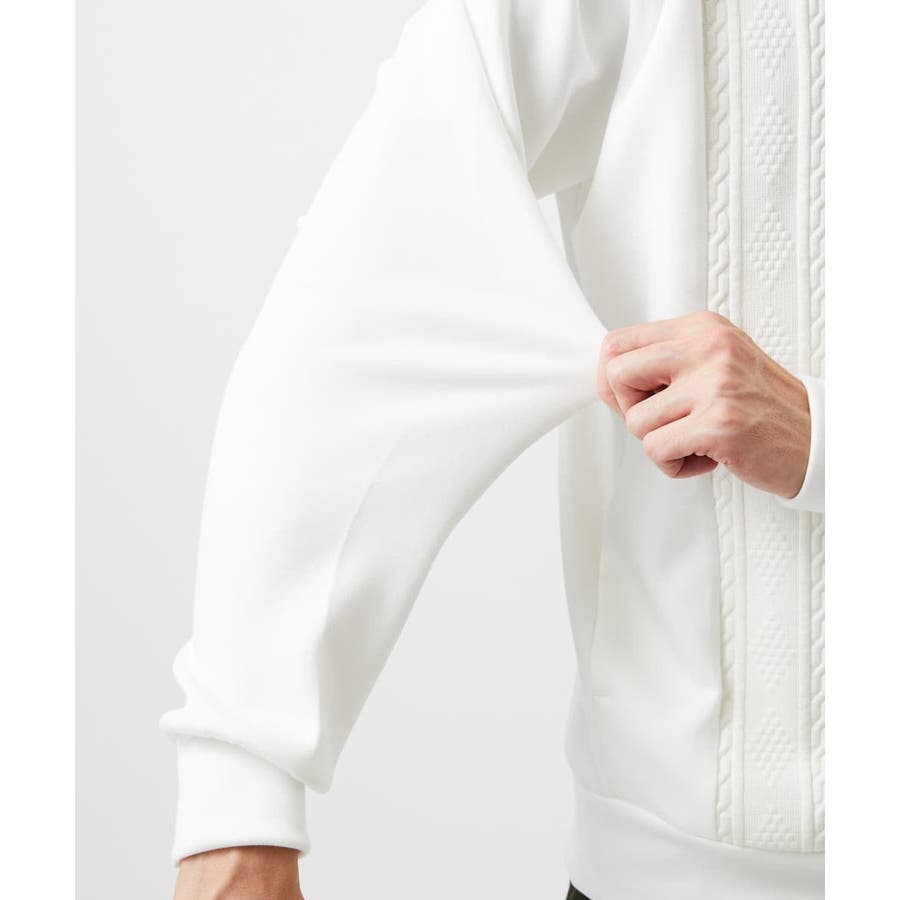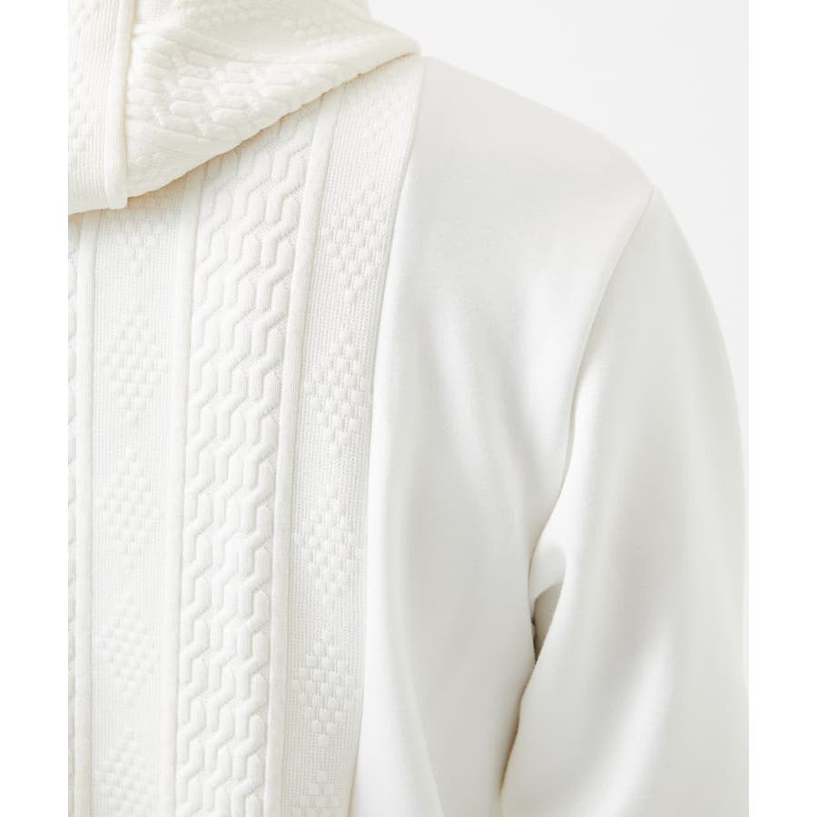 ・身頃の左側切替部分と左袖に、立体感のあるケーブル柄のフクレジャカード素材を使用。