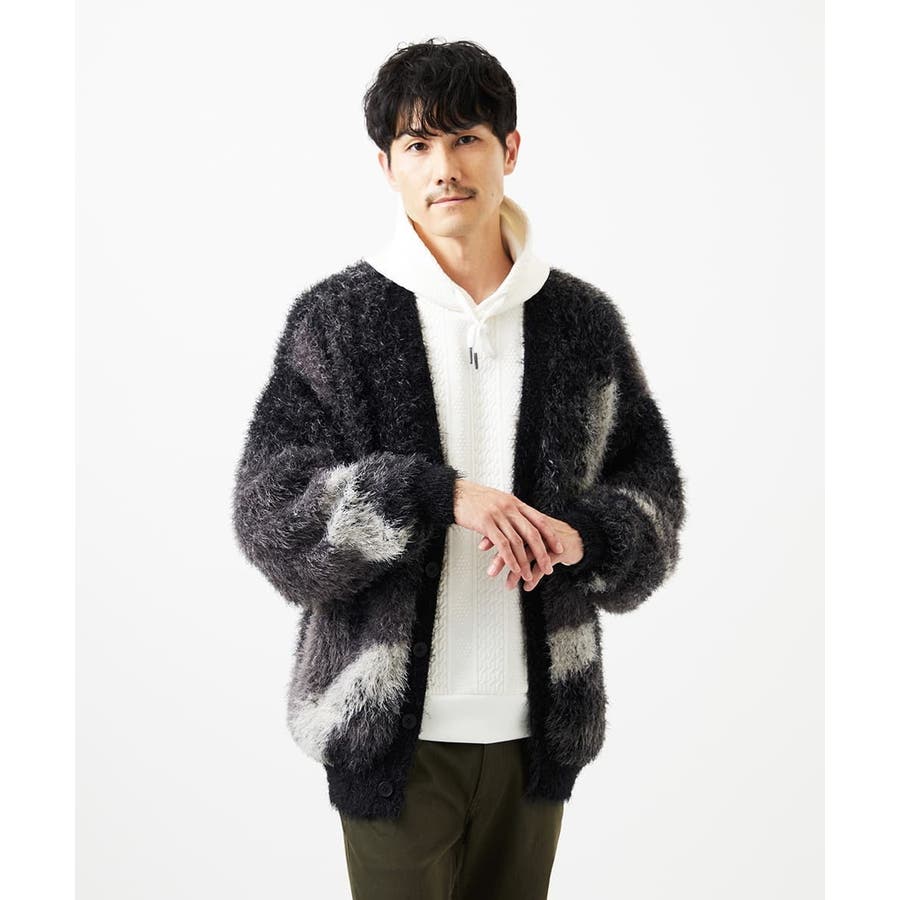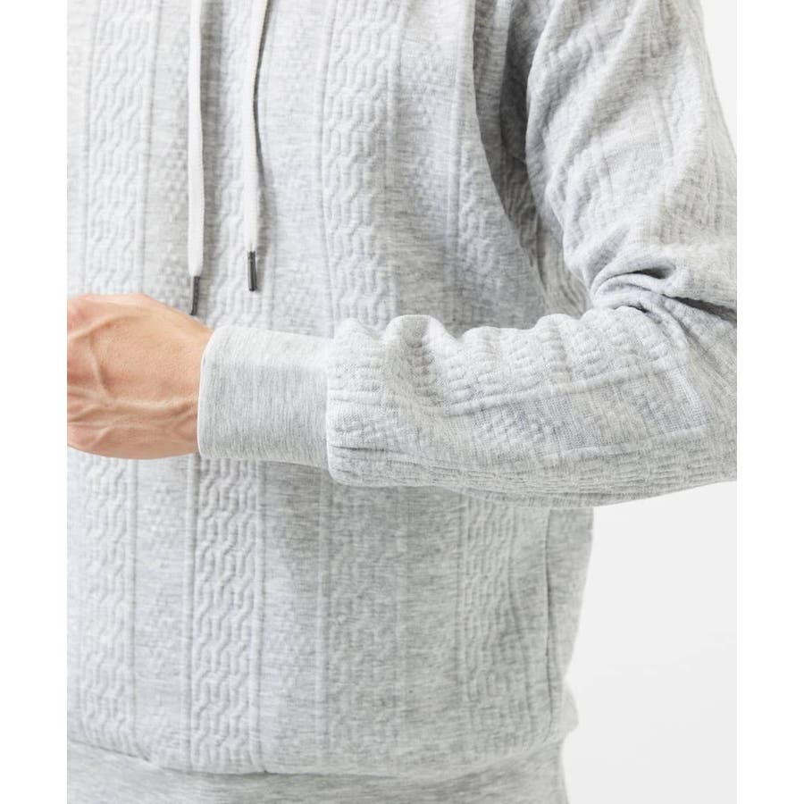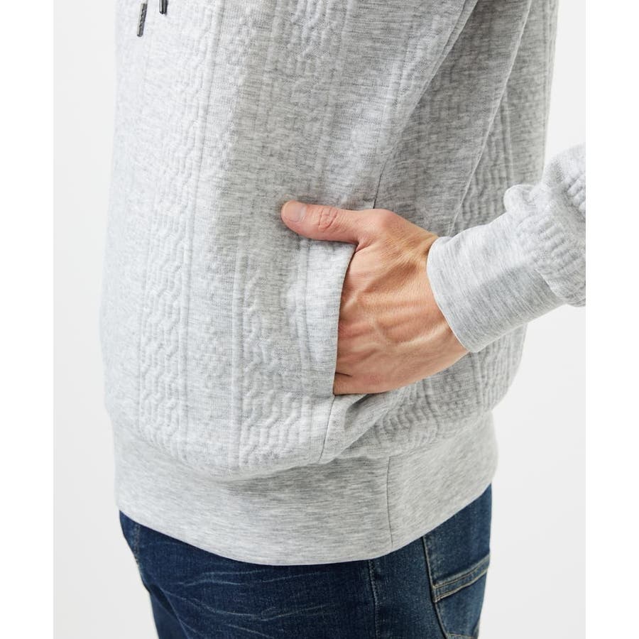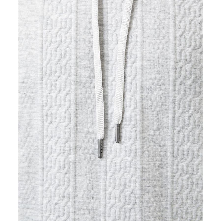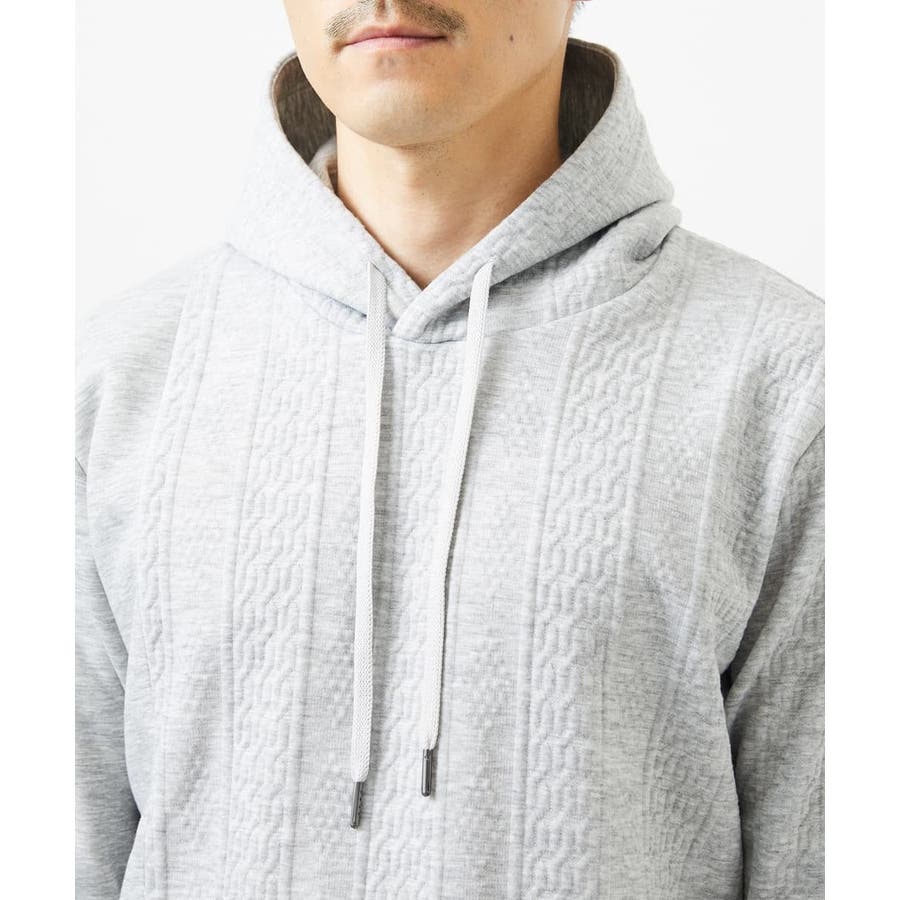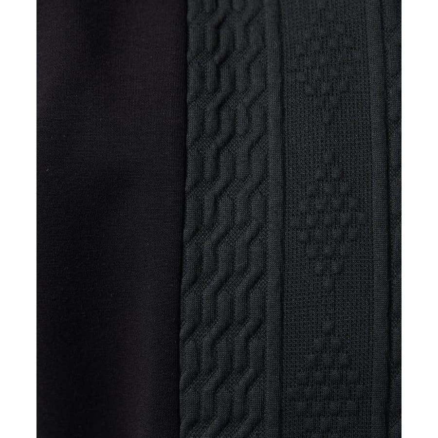 ・身頃の左側切替部分と左袖に、立体感のあるケーブル柄のフクレジャカード素材を使用。