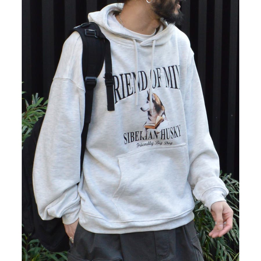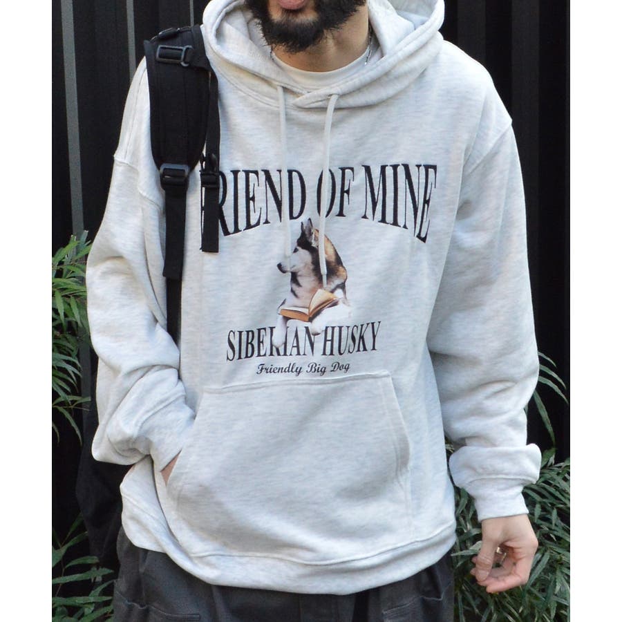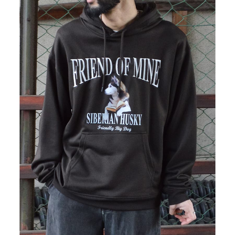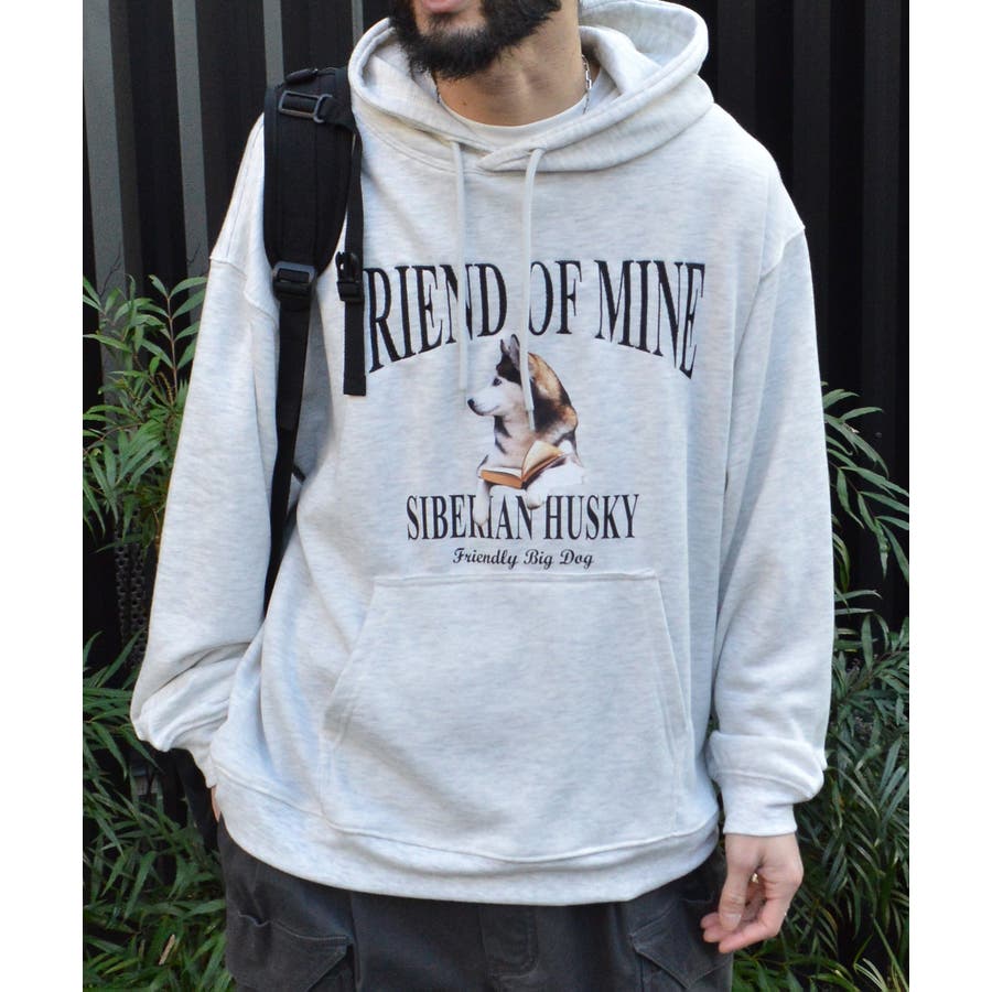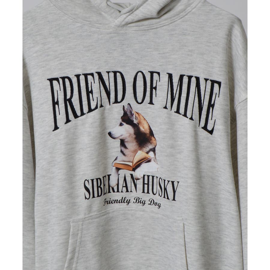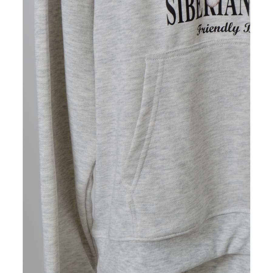 ハスキー犬プリント裏毛プルパーカー