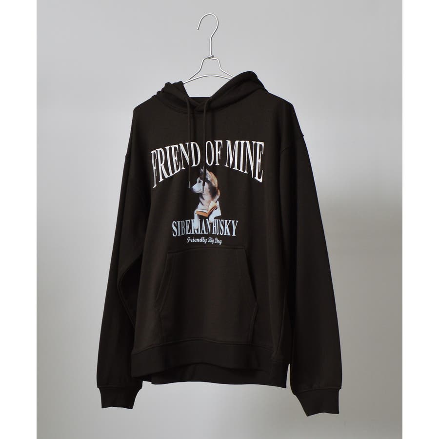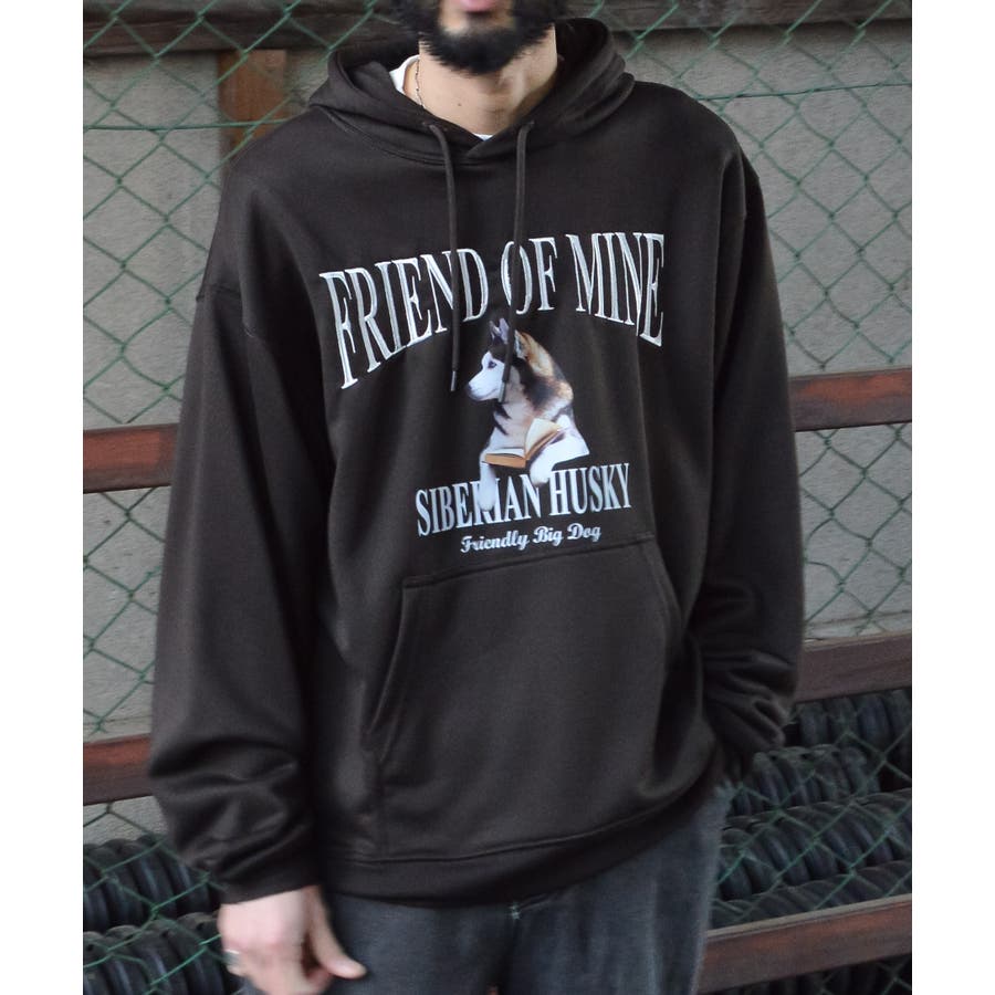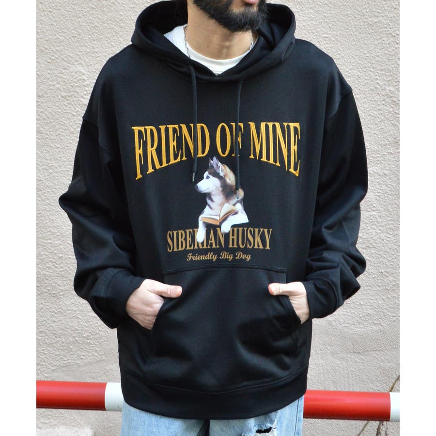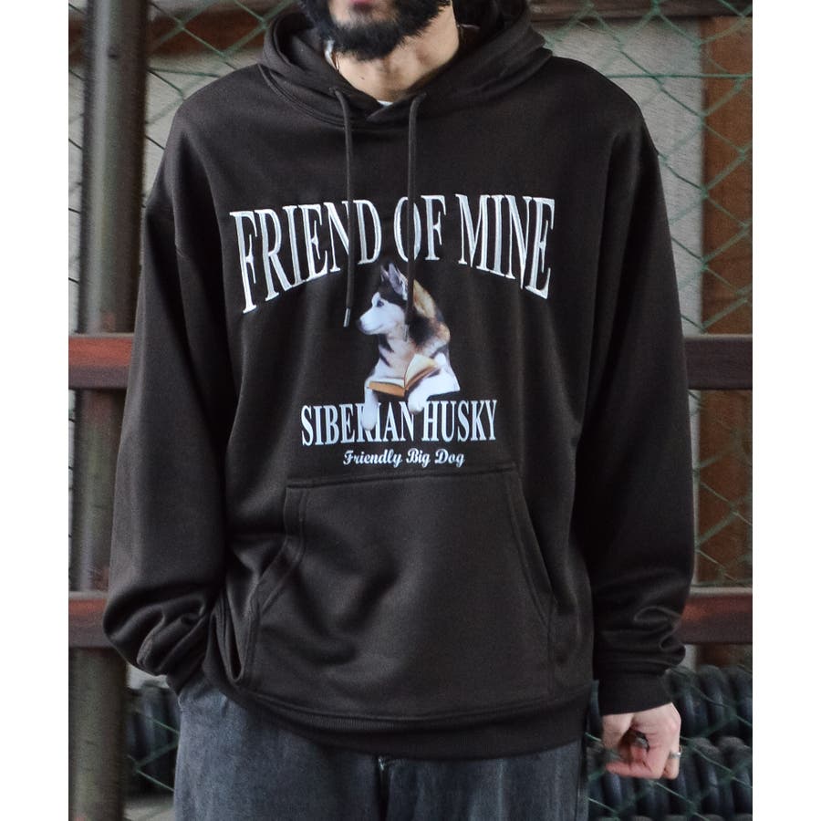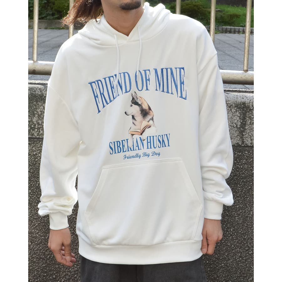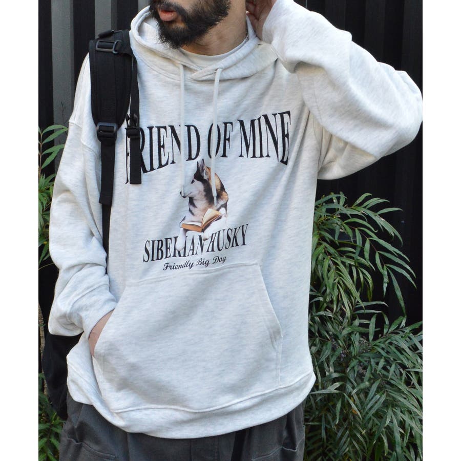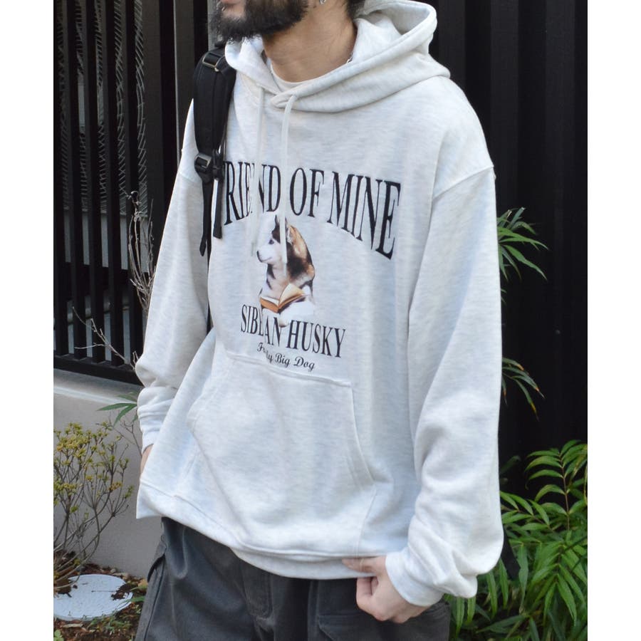 ハスキー犬プリント裏毛プルパーカー