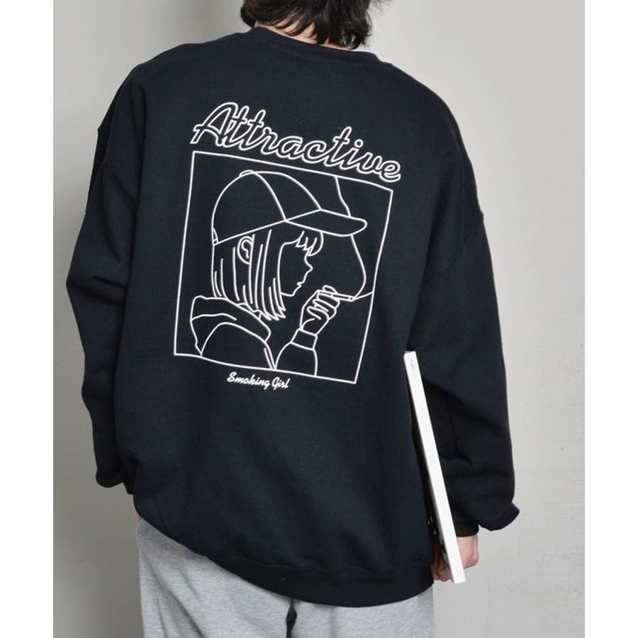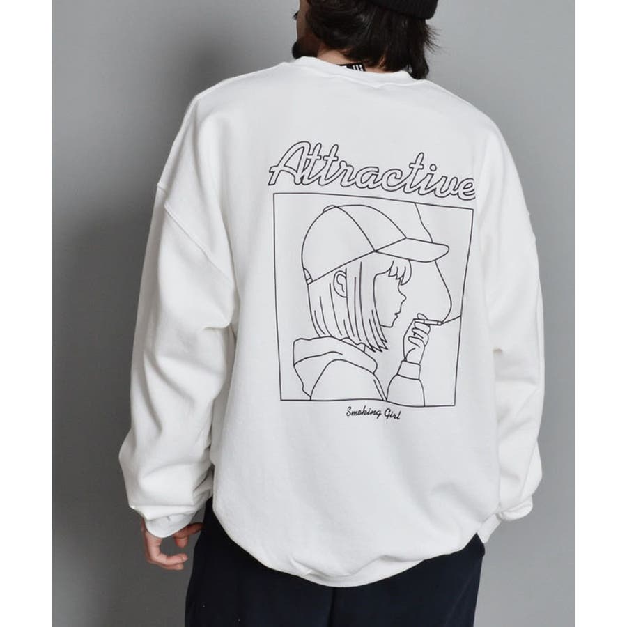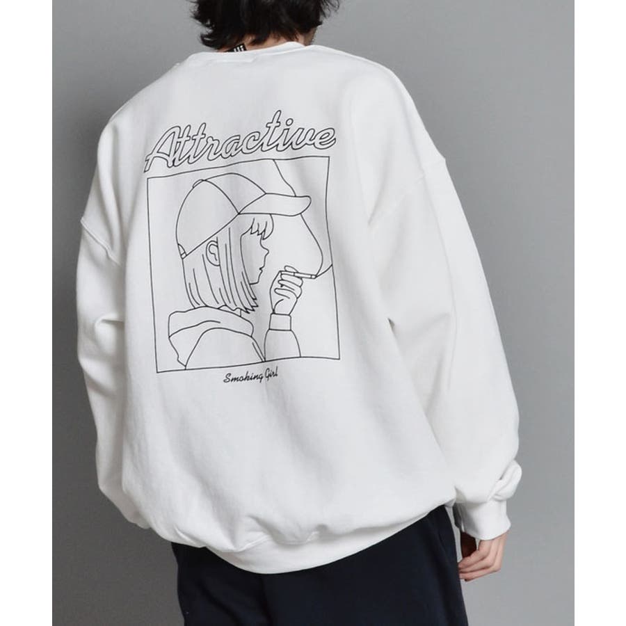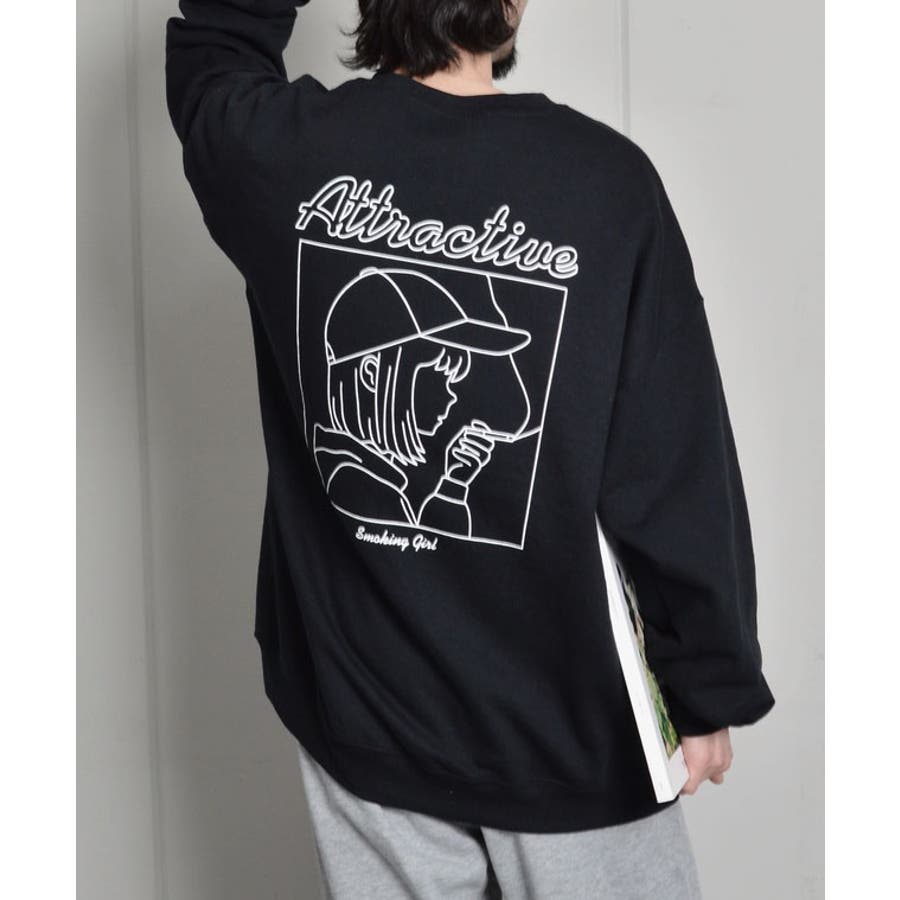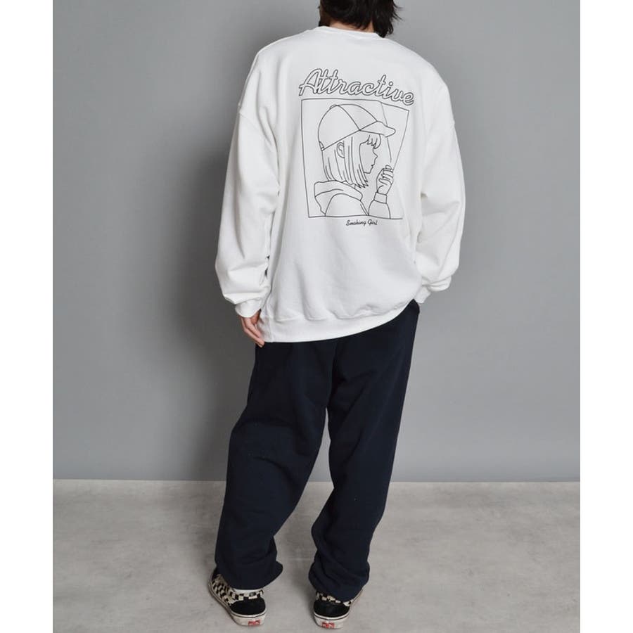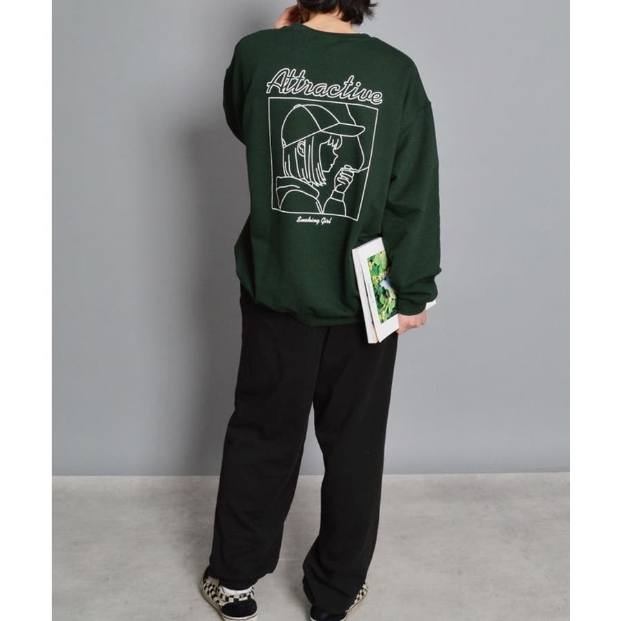 ・トレンドの線画イラストをバックプリントしたビッグシルエットトレーナー。