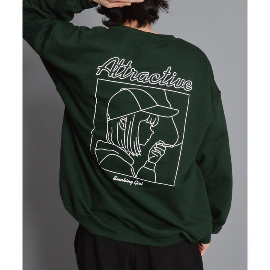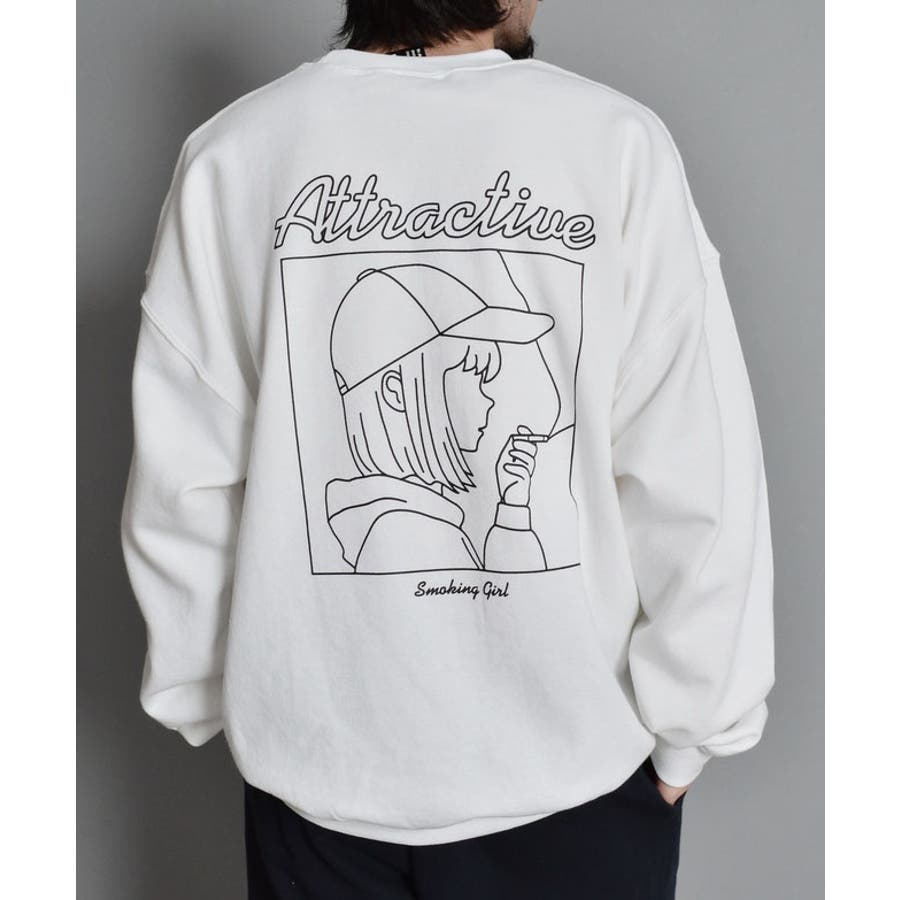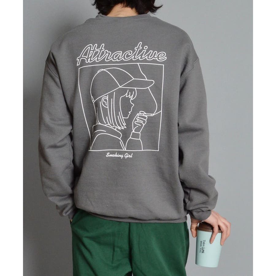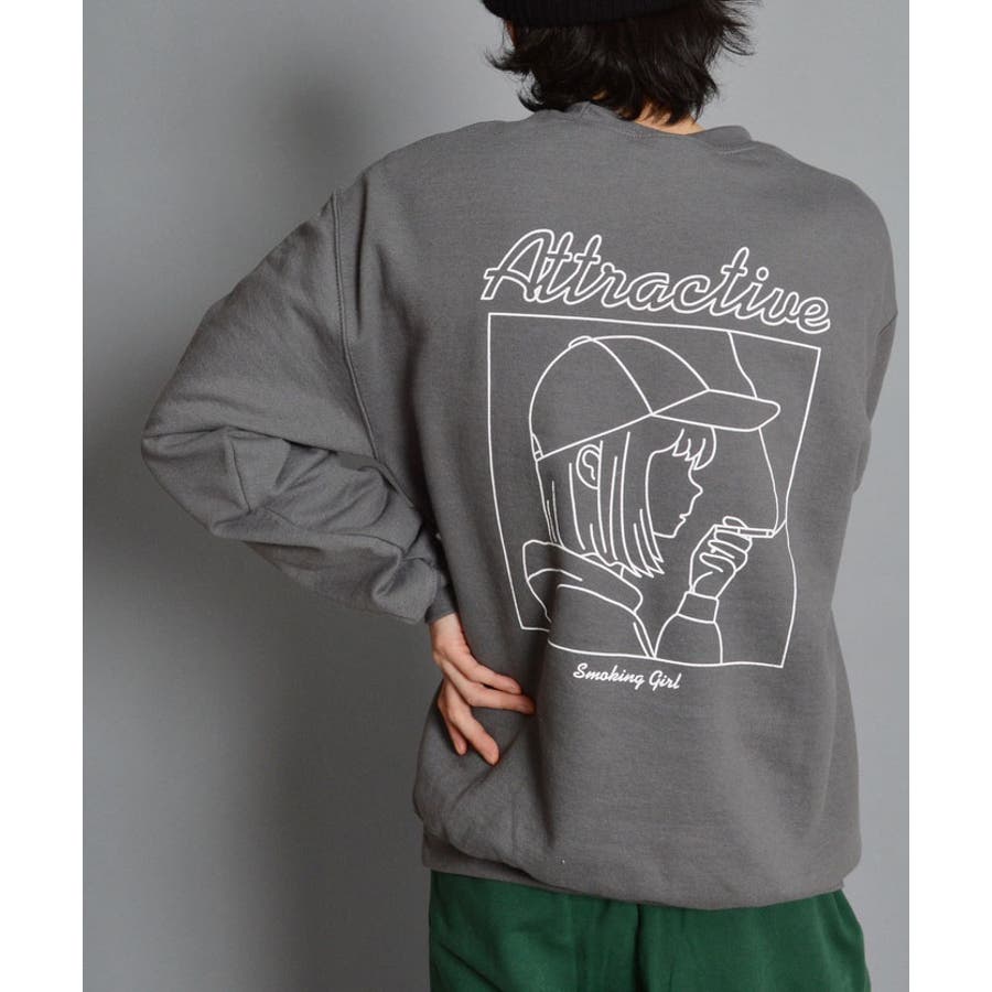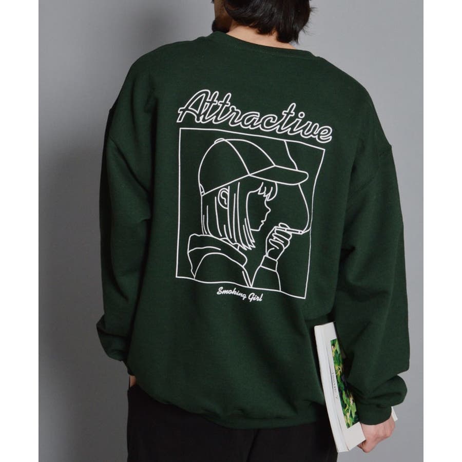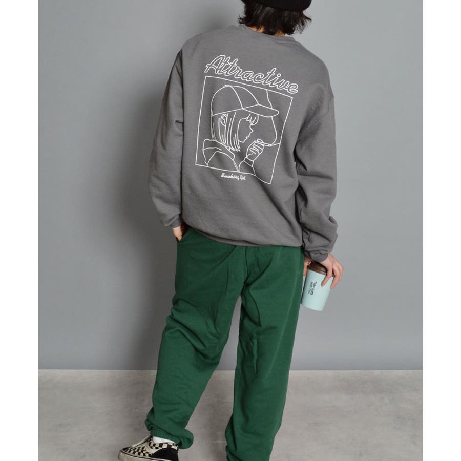 ・トレンドの線画イラストをバックプリントしたビッグシルエットトレーナー。