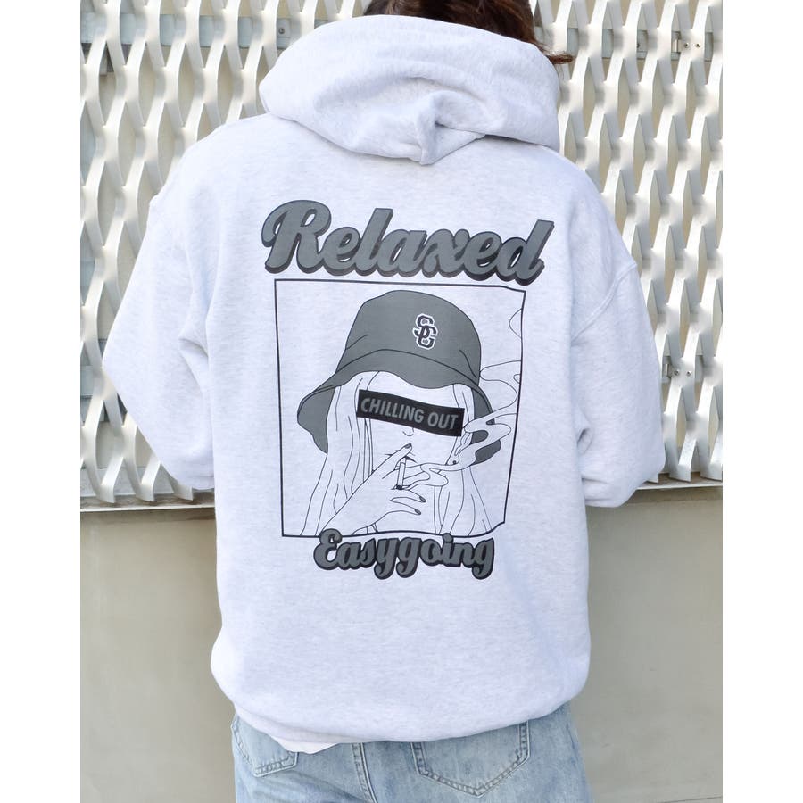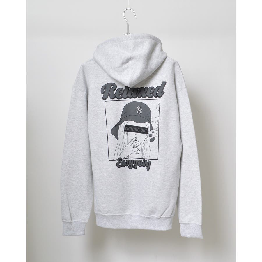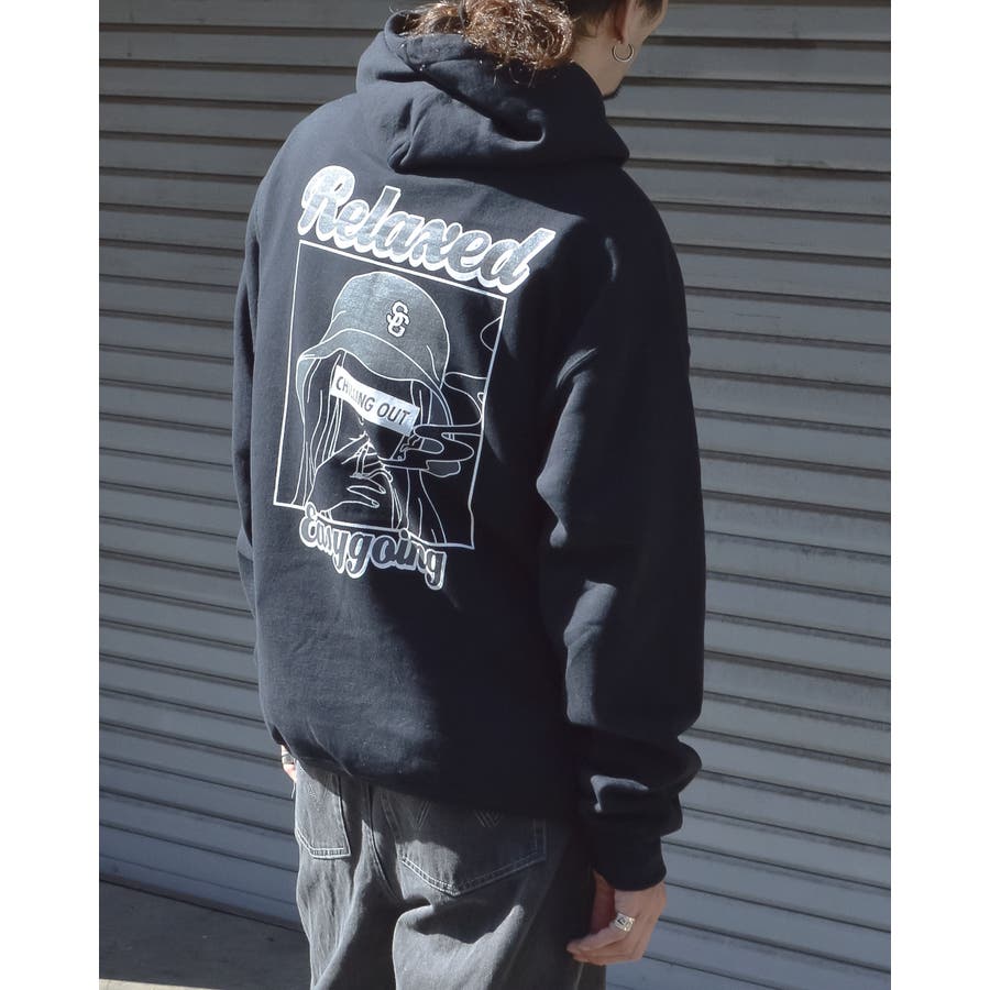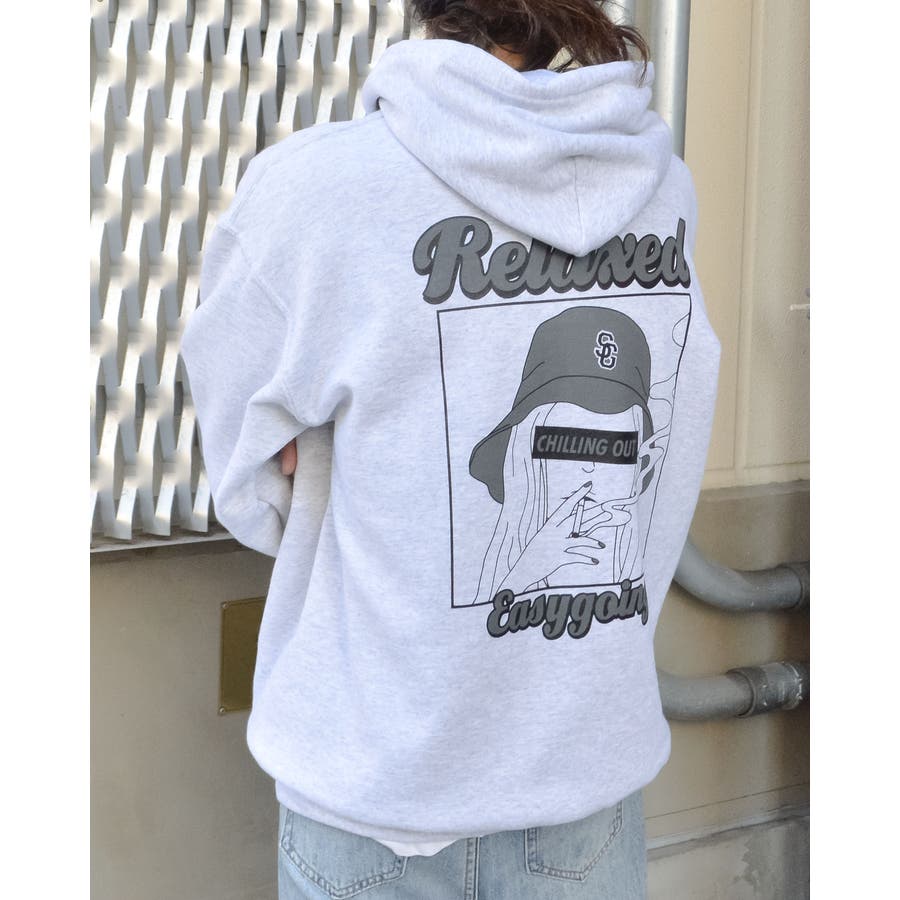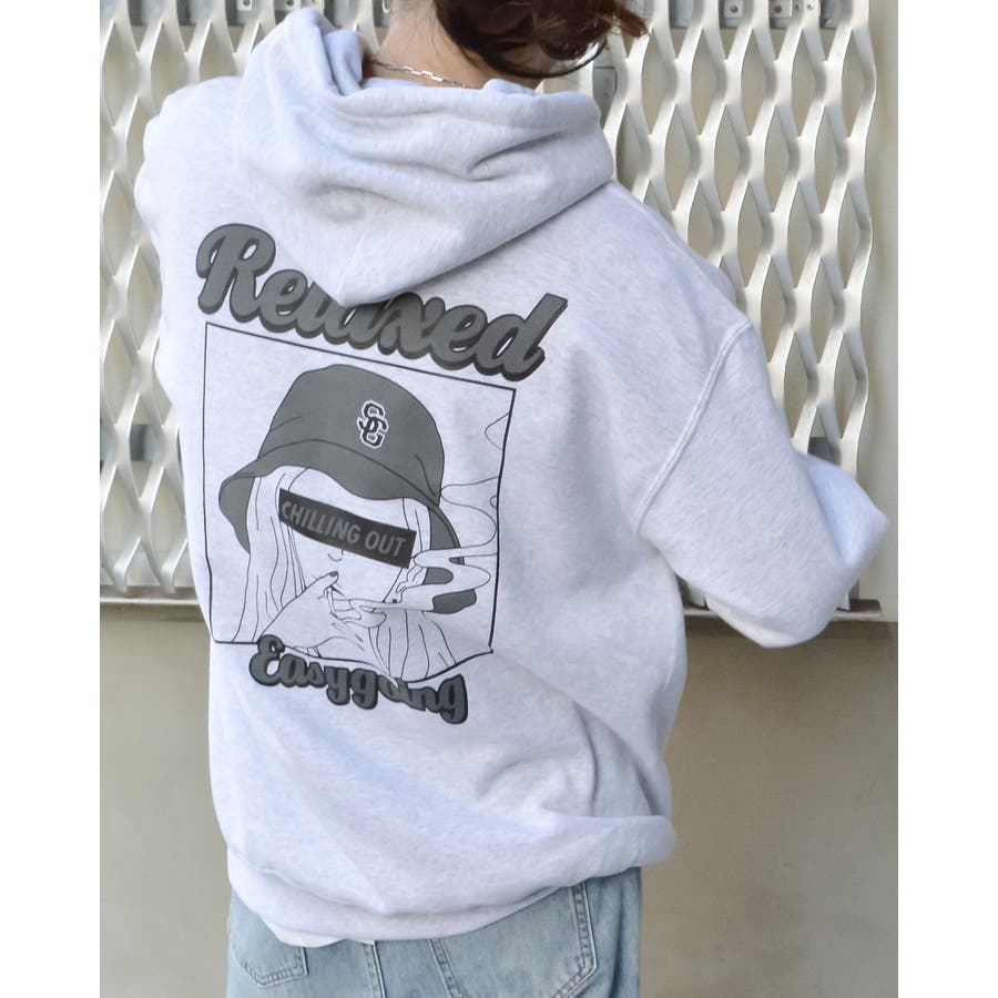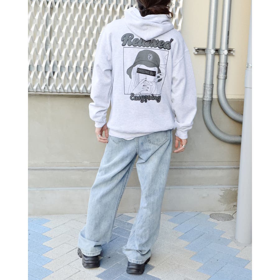 ・大人気の線画イラストをバックにプリントしたビッグシルエットフーディー。