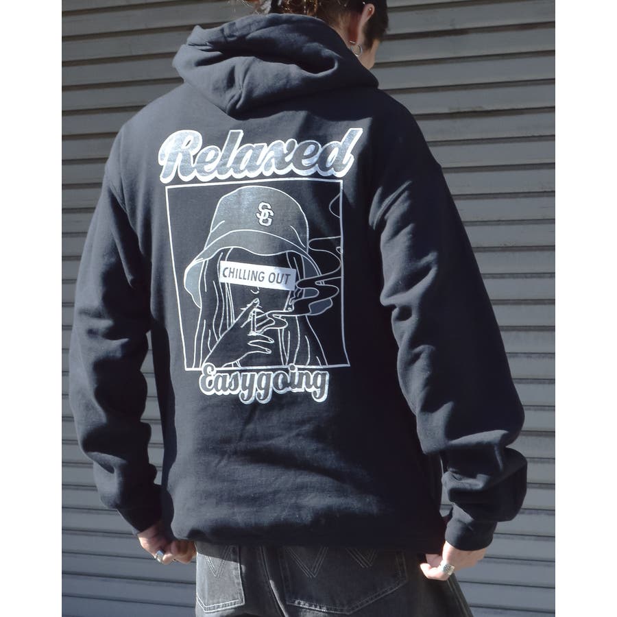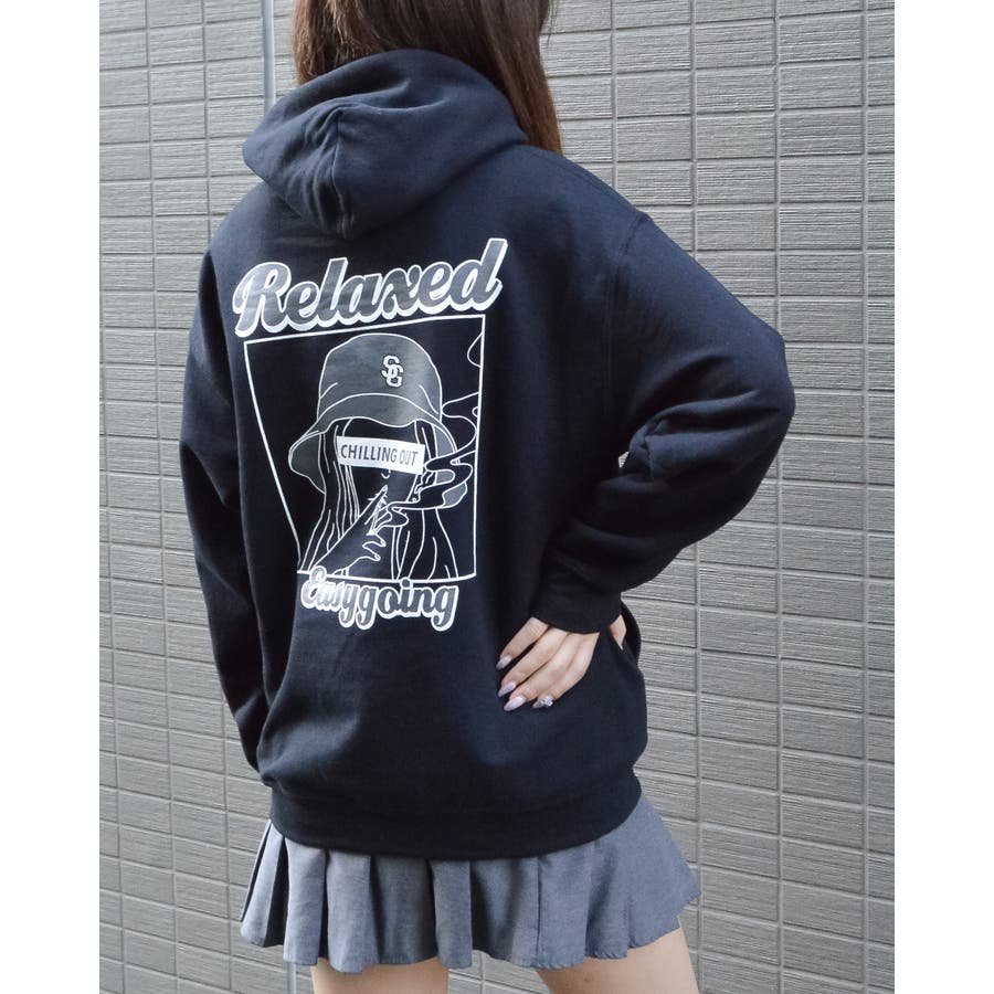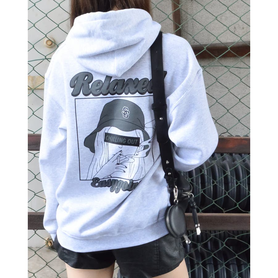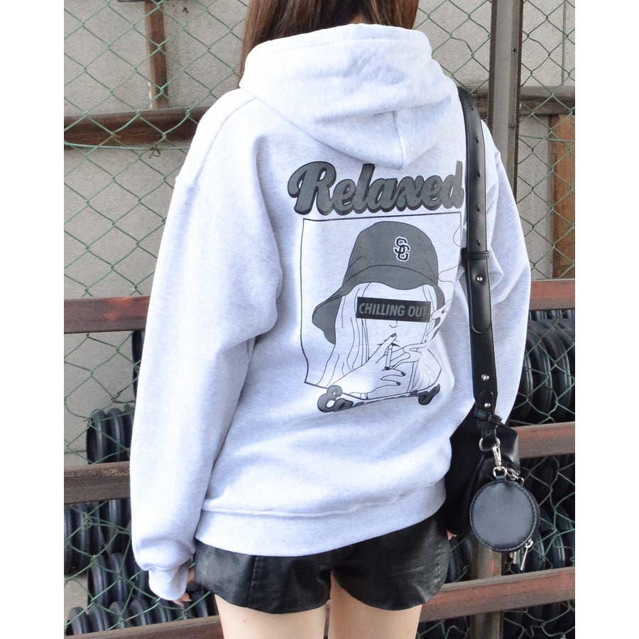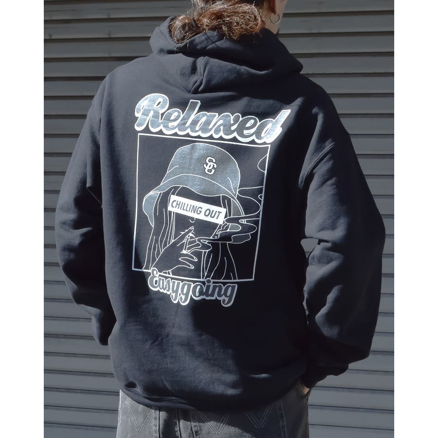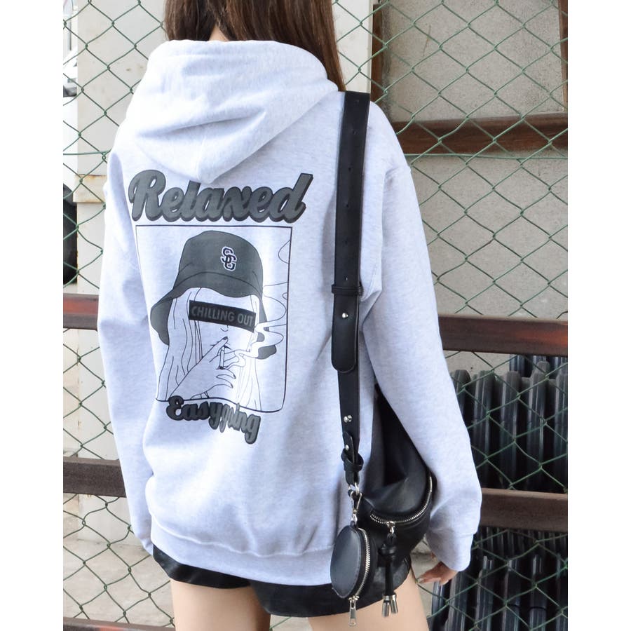 ・大人気の線画イラストをバックにプリントしたビッグシルエットフーディー。