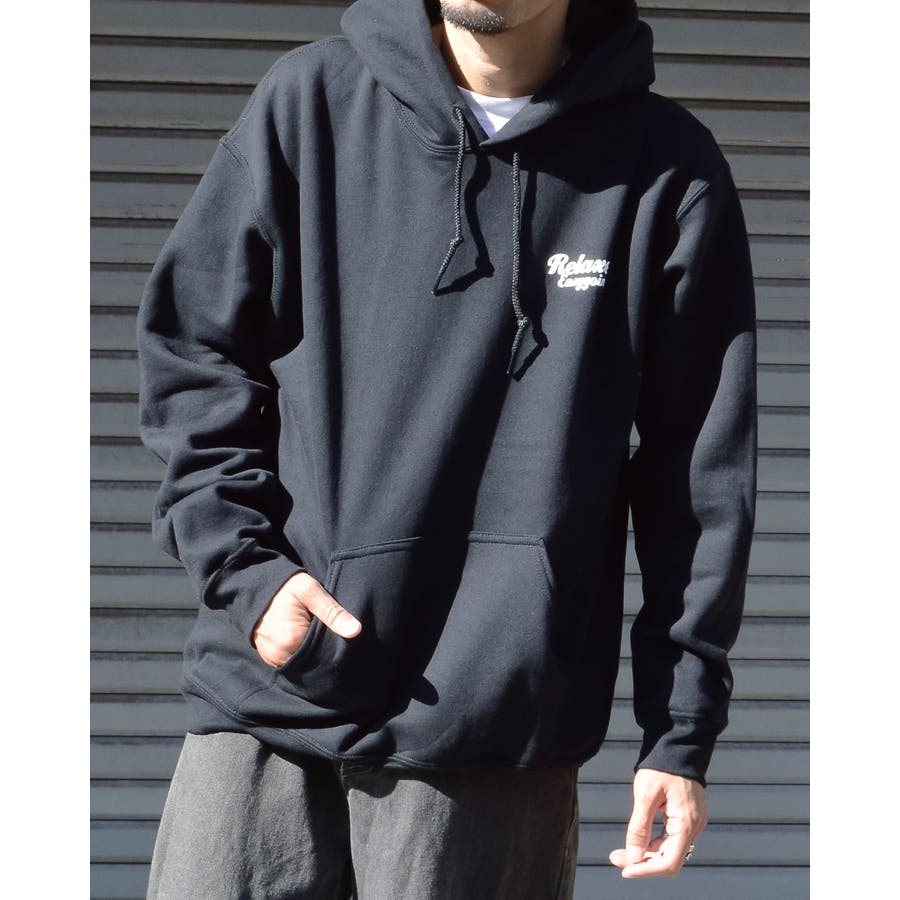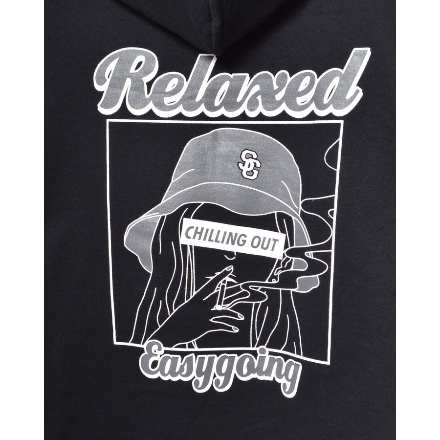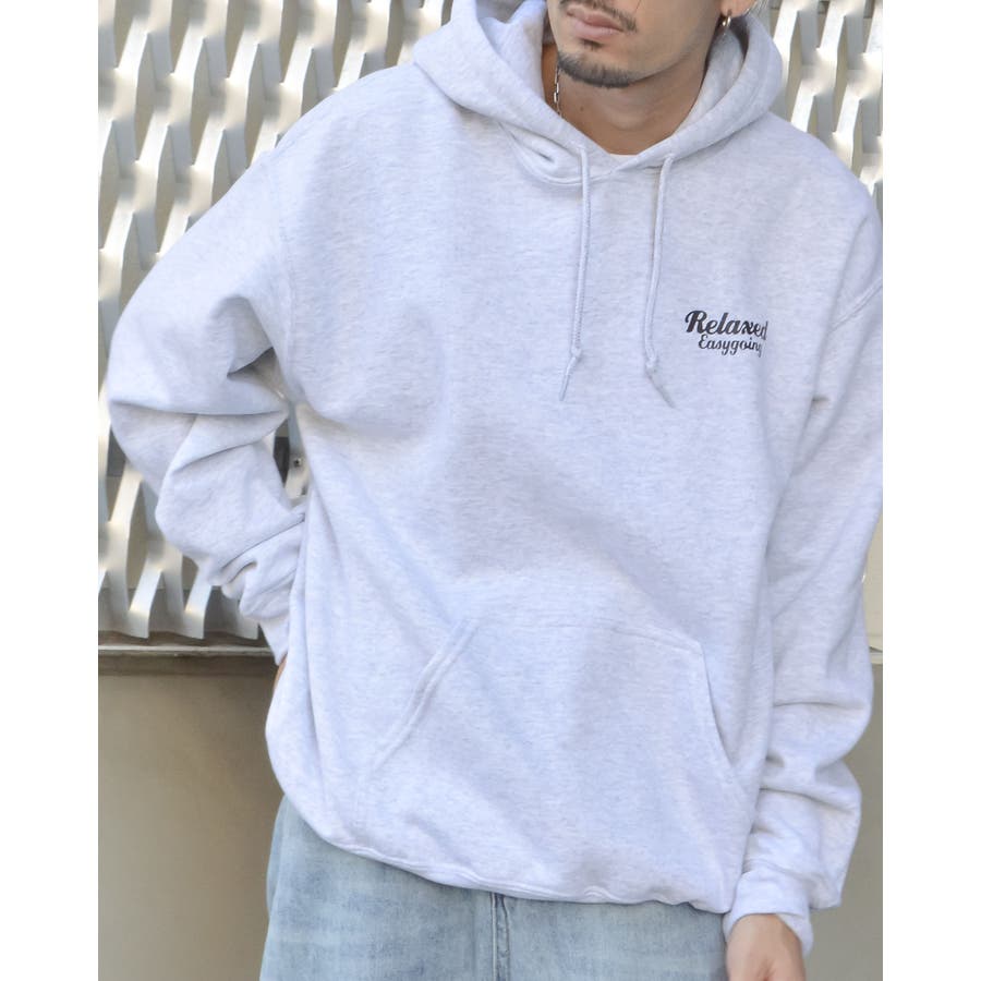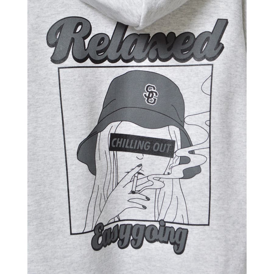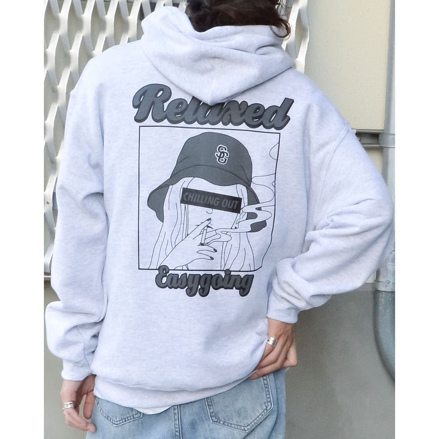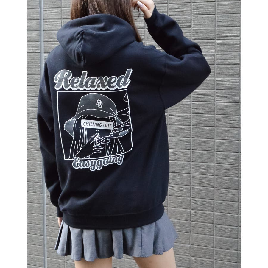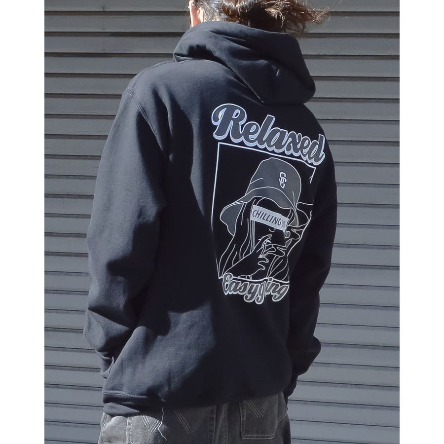 ・大人気の線画イラストをバックにプリントしたビッグシルエットフーディー。