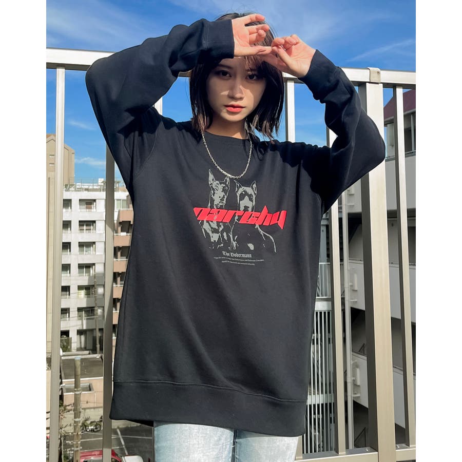 【迫力あるドーベルマンとロゴプリントが力強く、目を惹くスウェット】