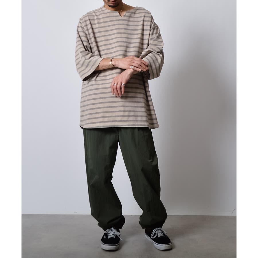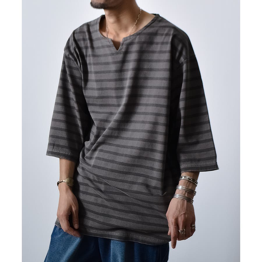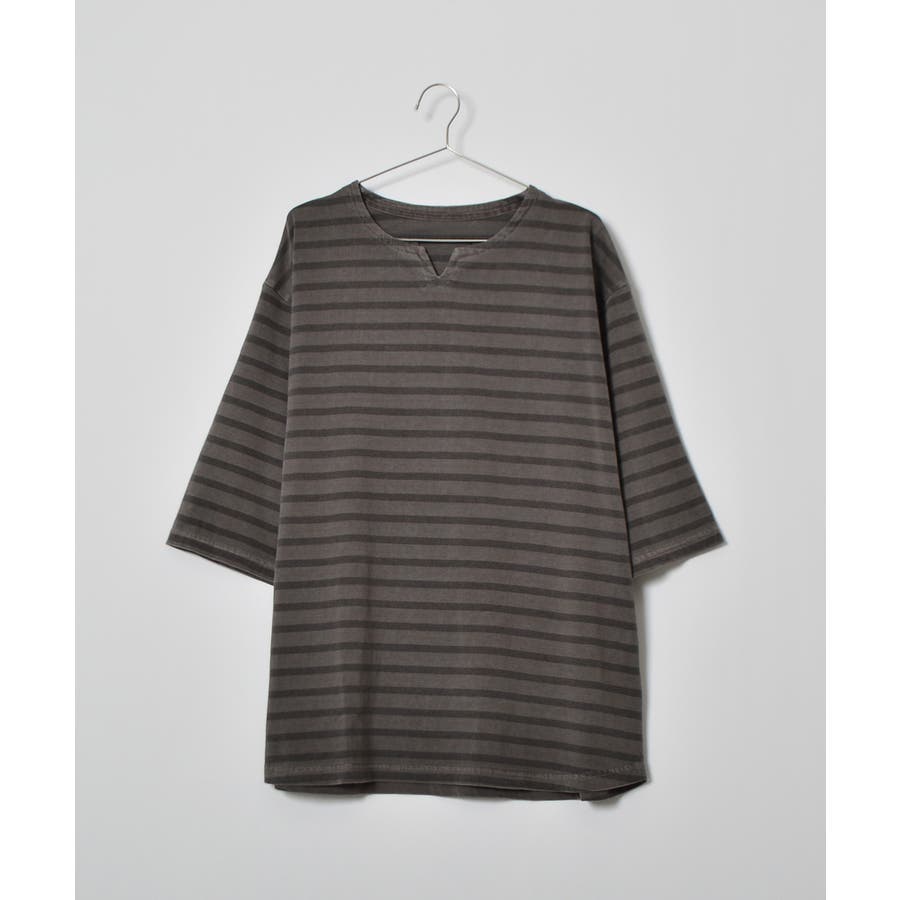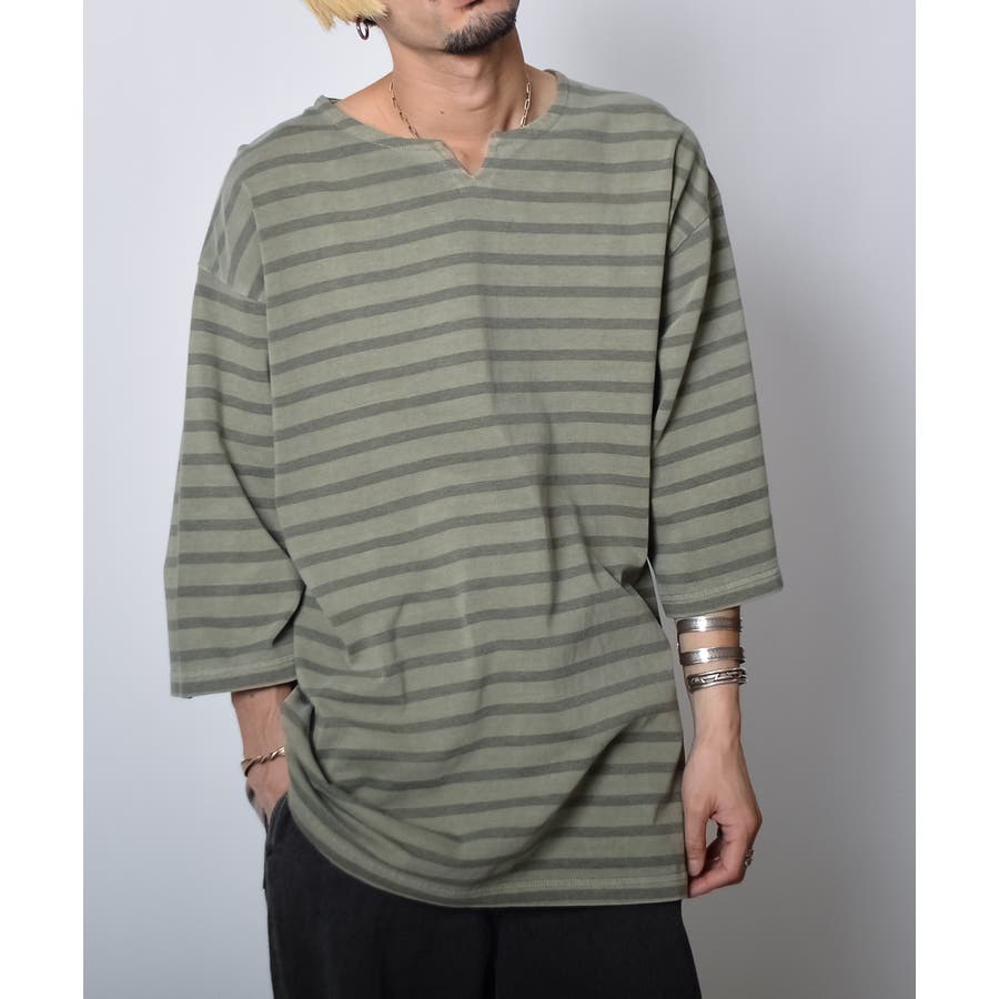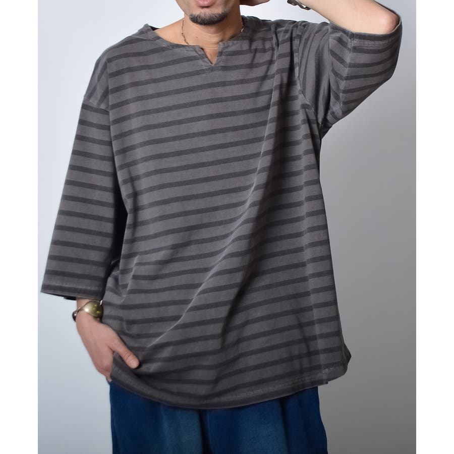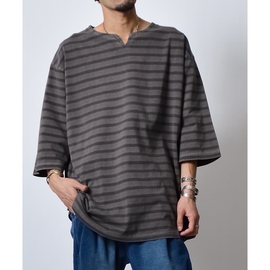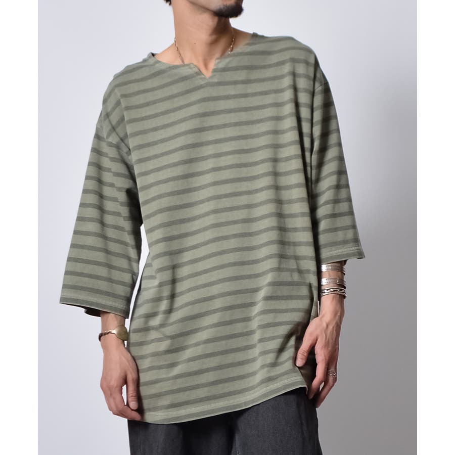 ピグメントオーバーダイ ボーダー キーネックTシャツ