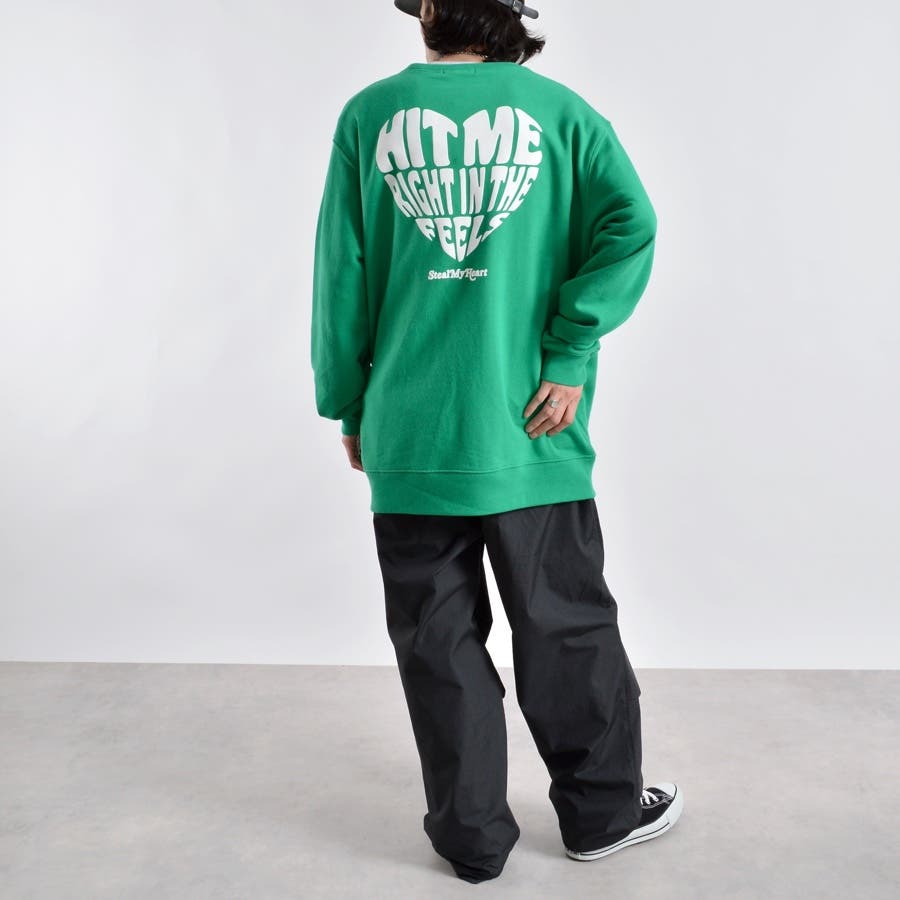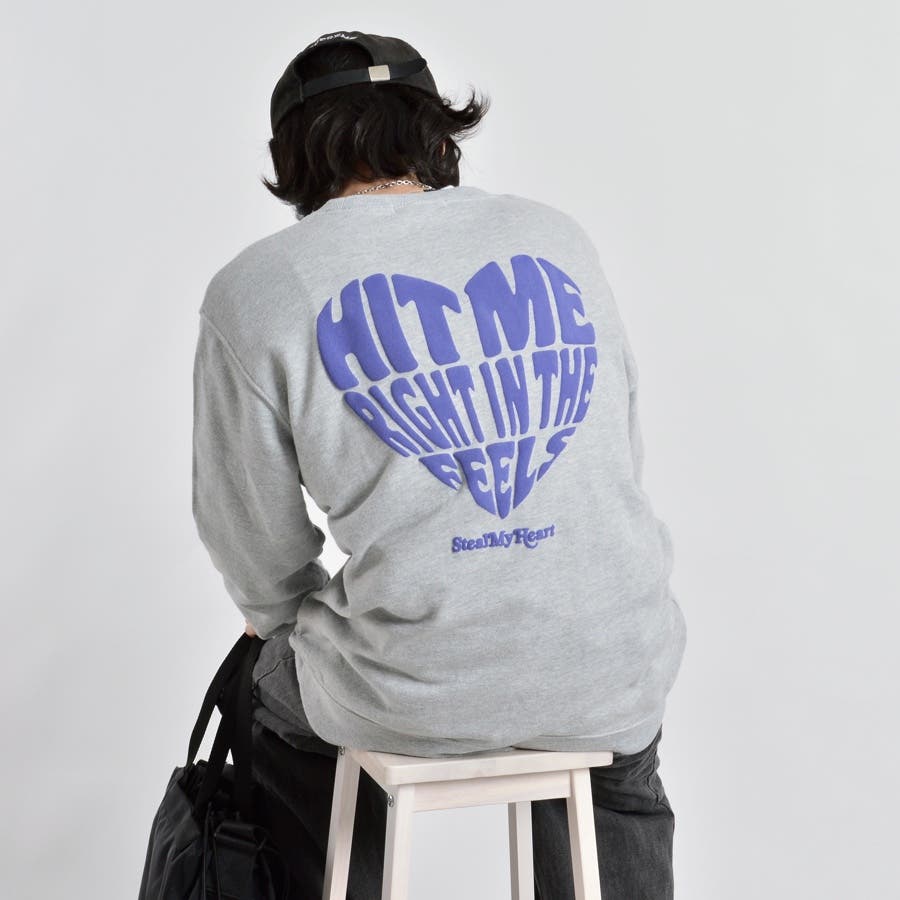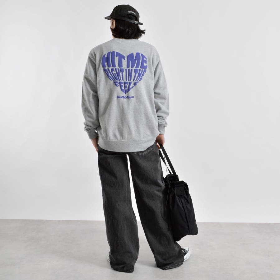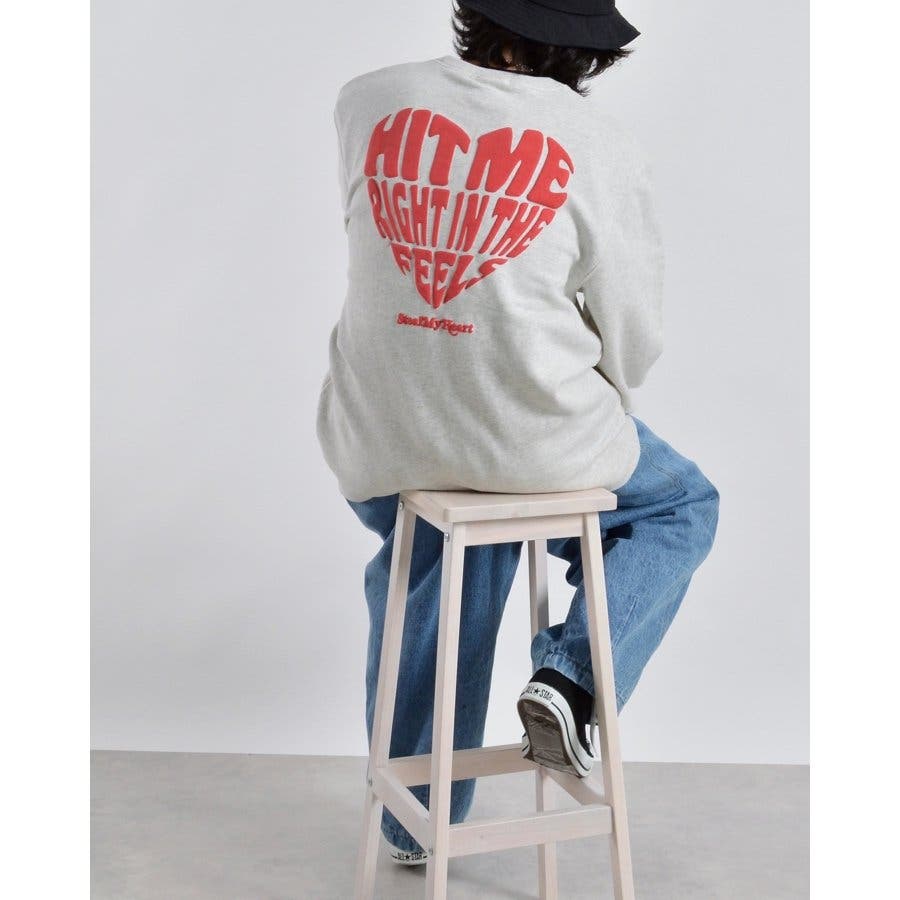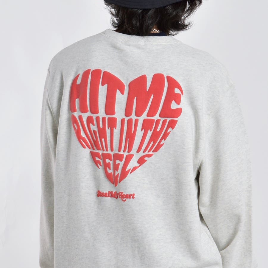 ・ハート型のオリジナルグラフィックプリントをバックに大きく配したクルーネックスウェット。