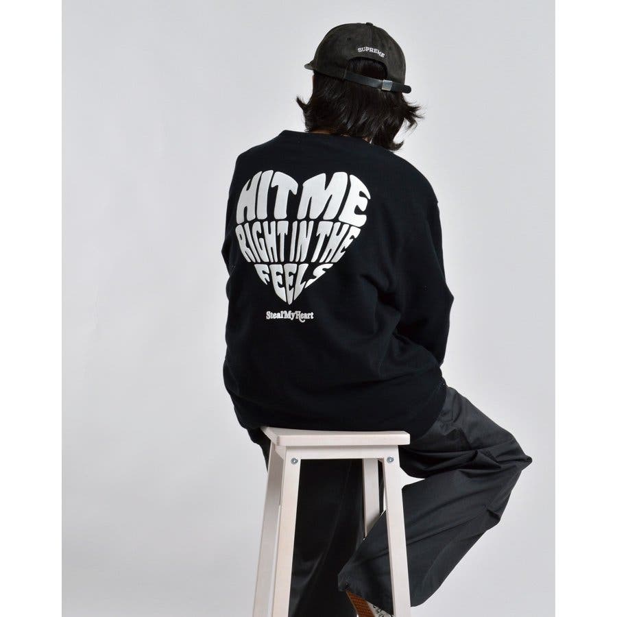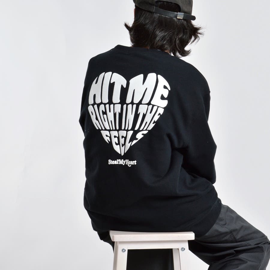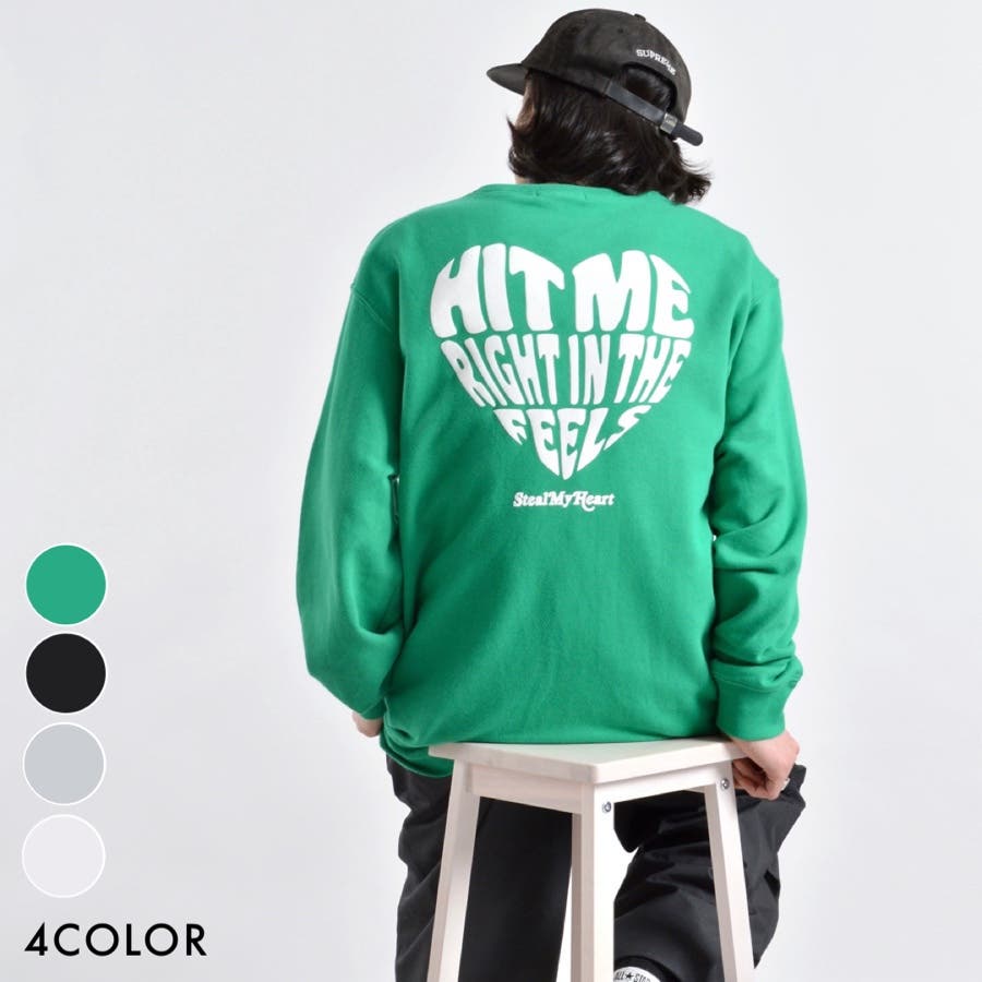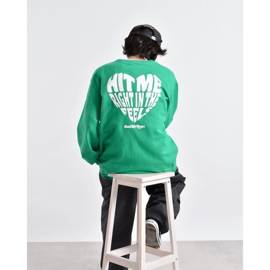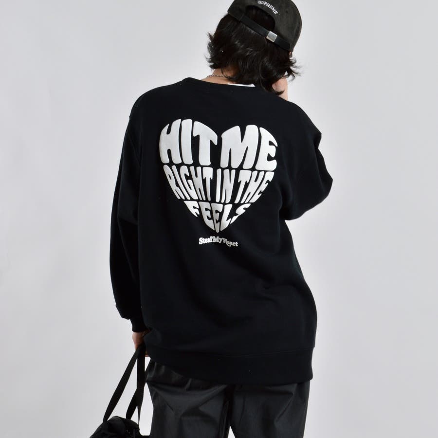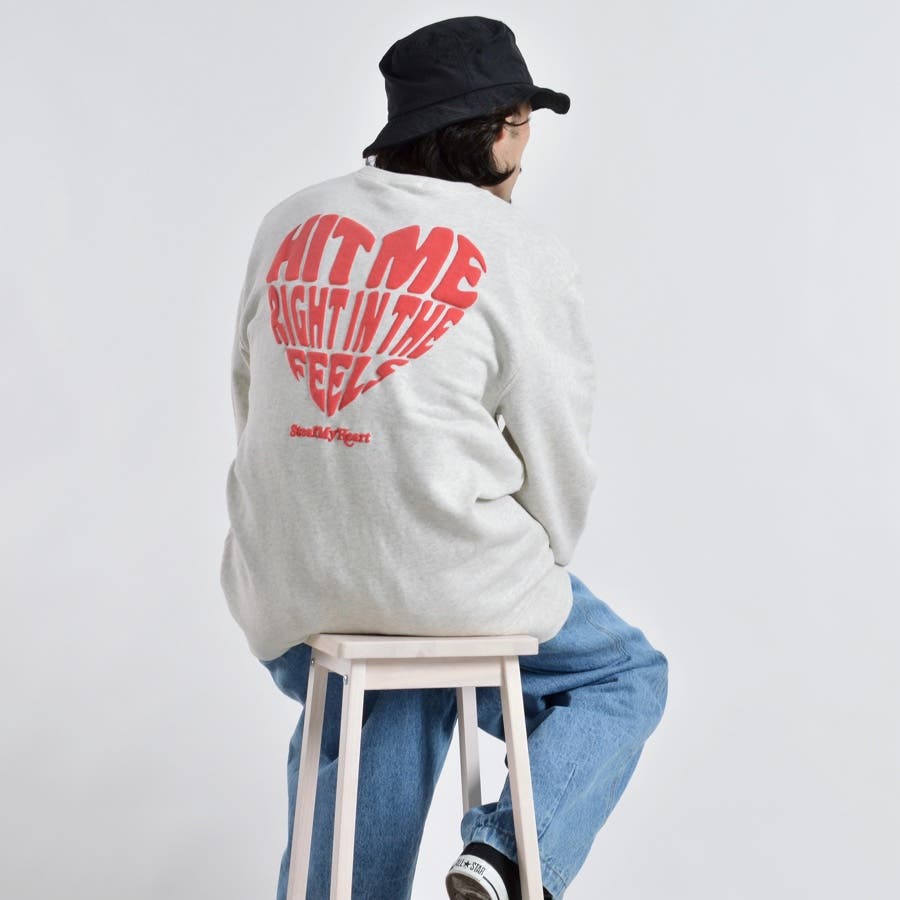 ・ハート型のオリジナルグラフィックプリントをバックに大きく配したクルーネックスウェット。