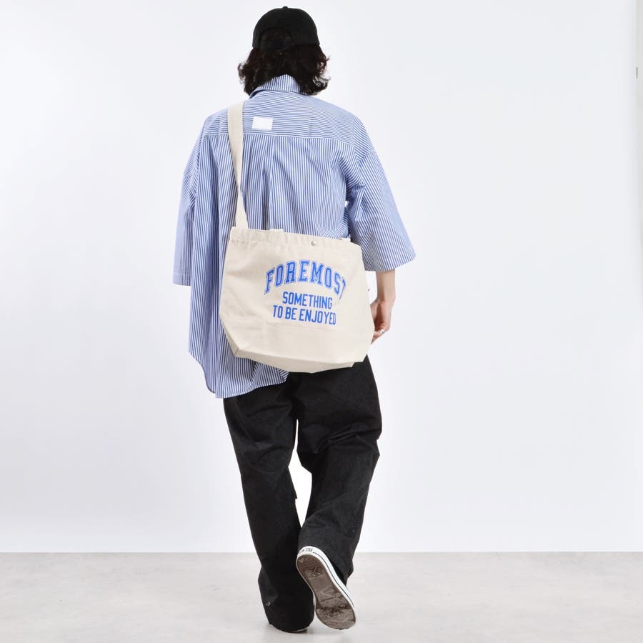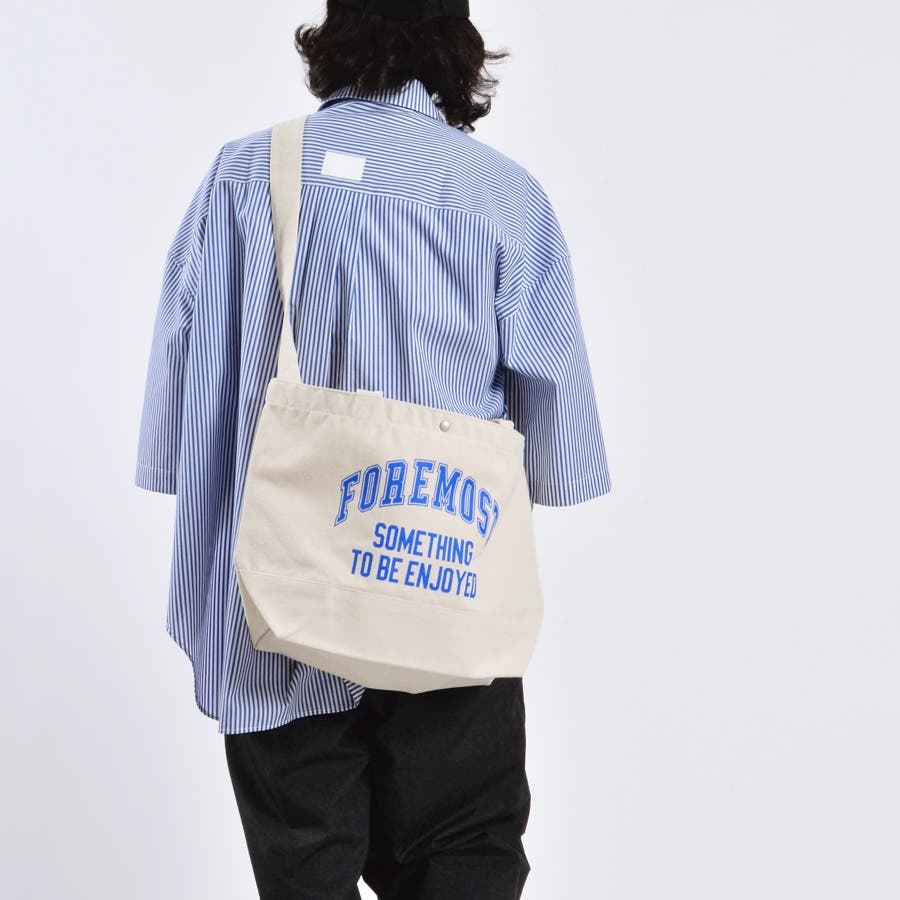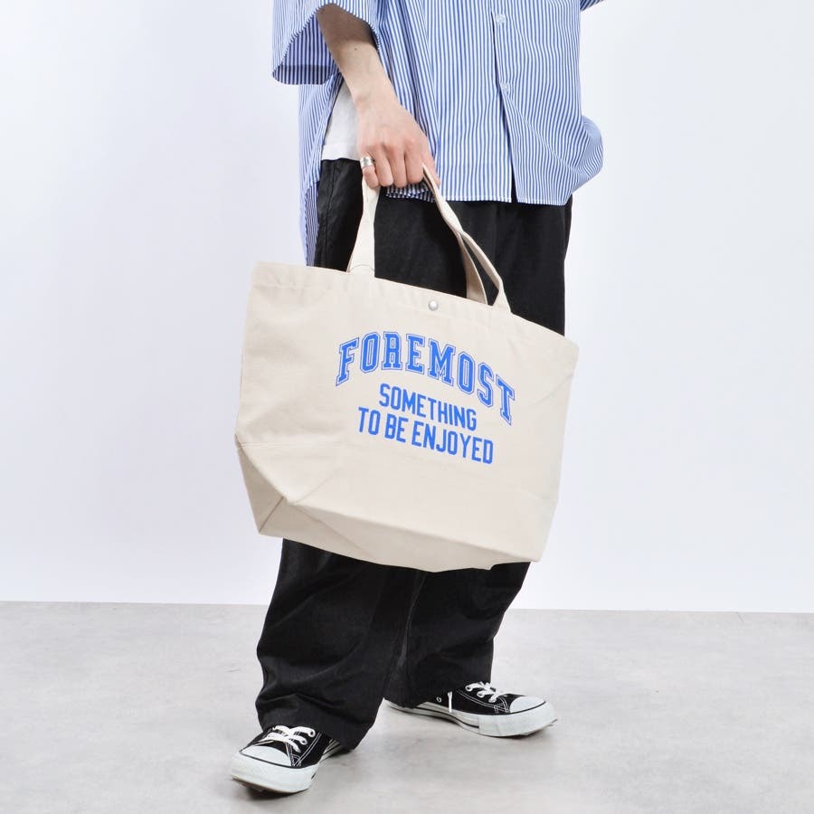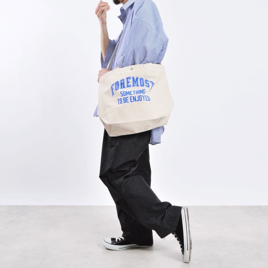 カレッジロゴのオリジナルラバープリントを配したキャンバス2WAYトートバッグ。