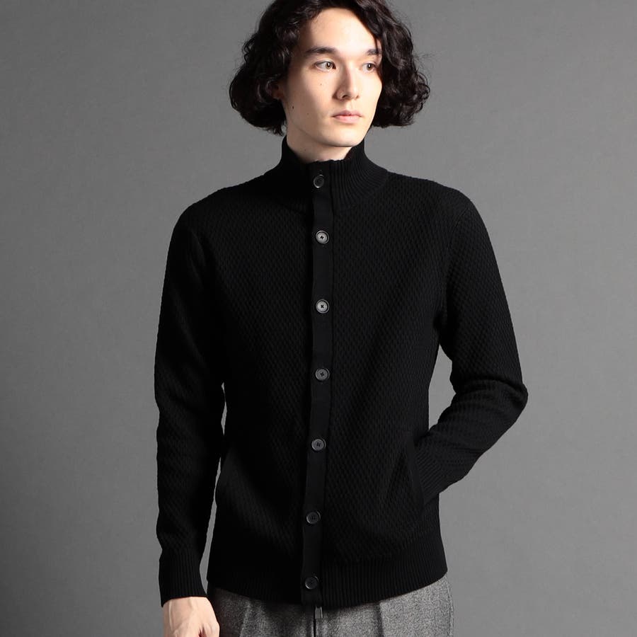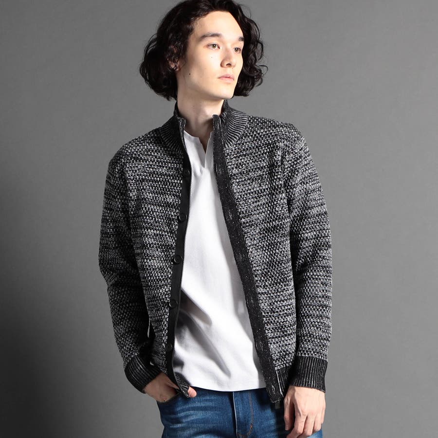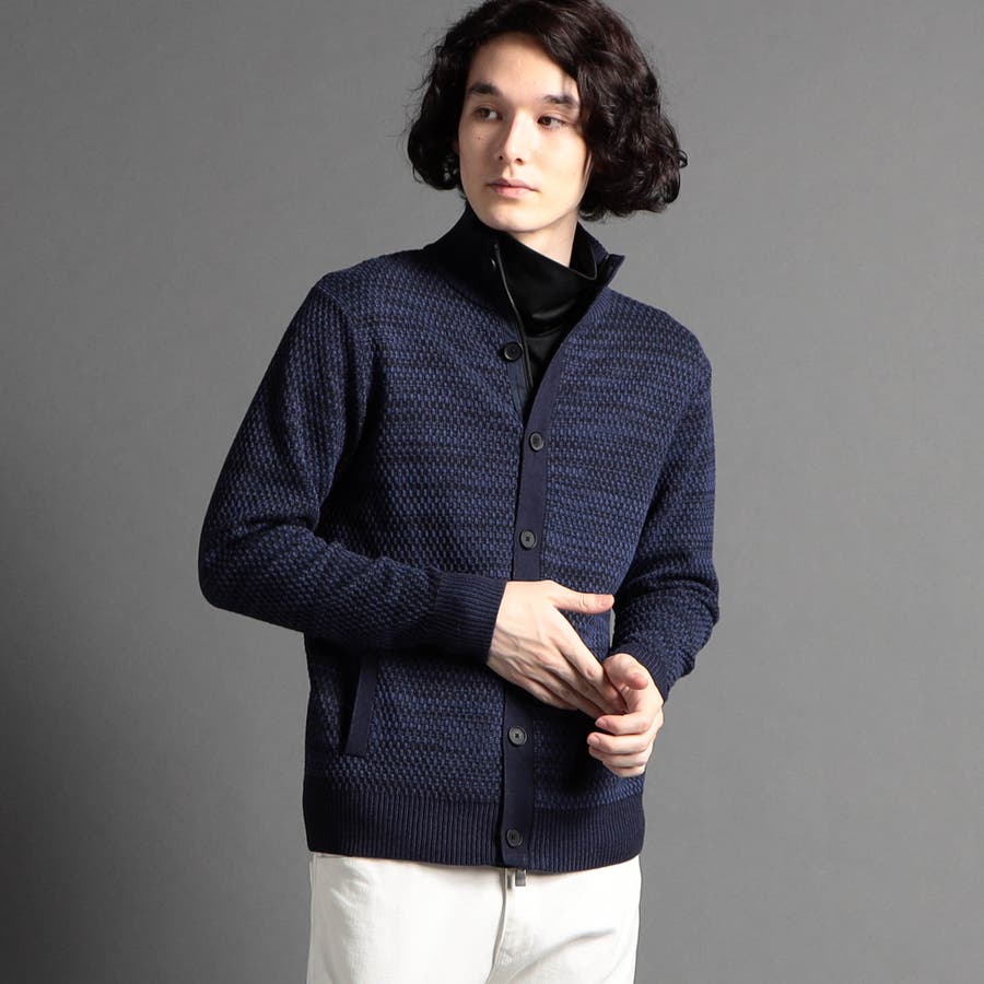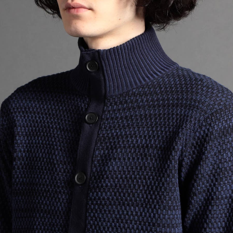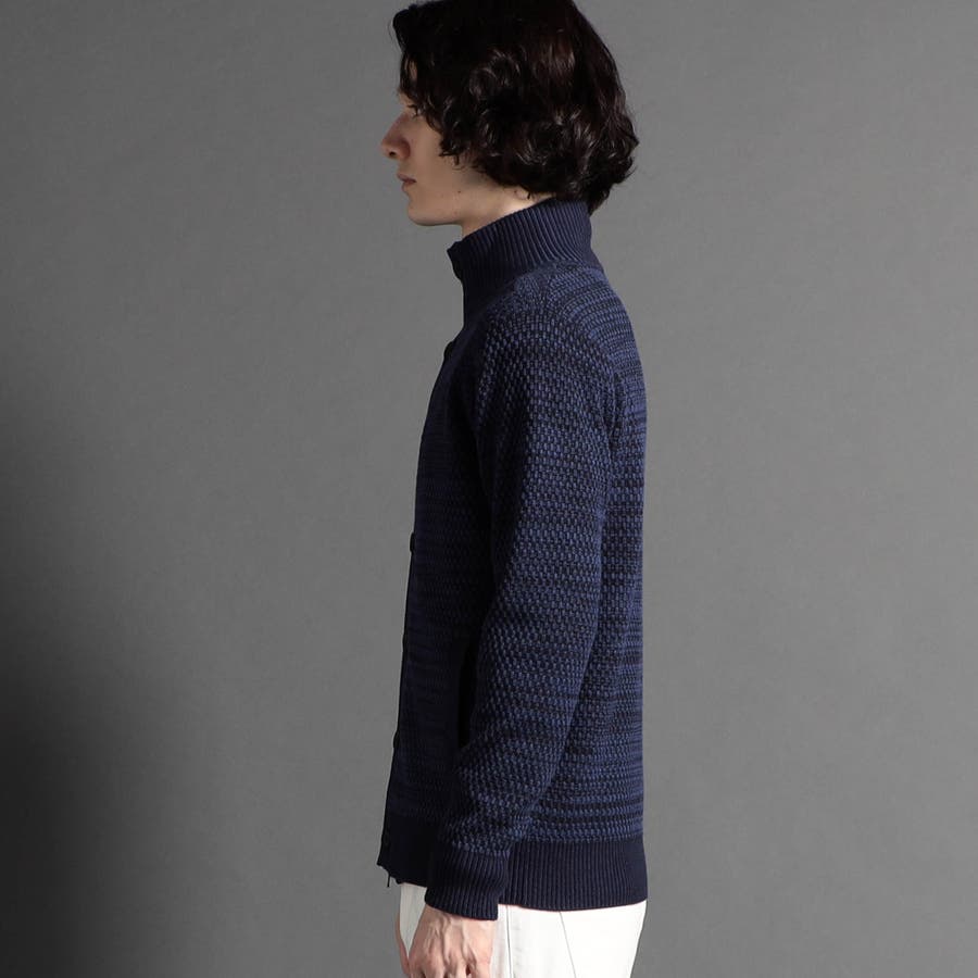 しっかりと立つ度詰めリブのスタンドカラーが特徴のニットブルゾン。