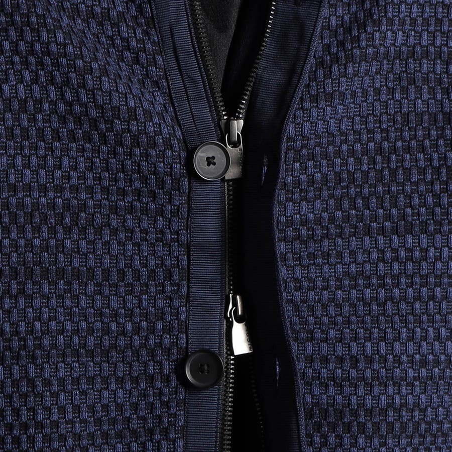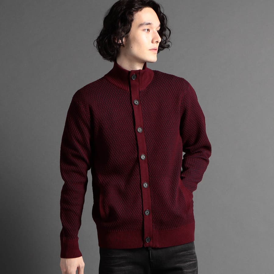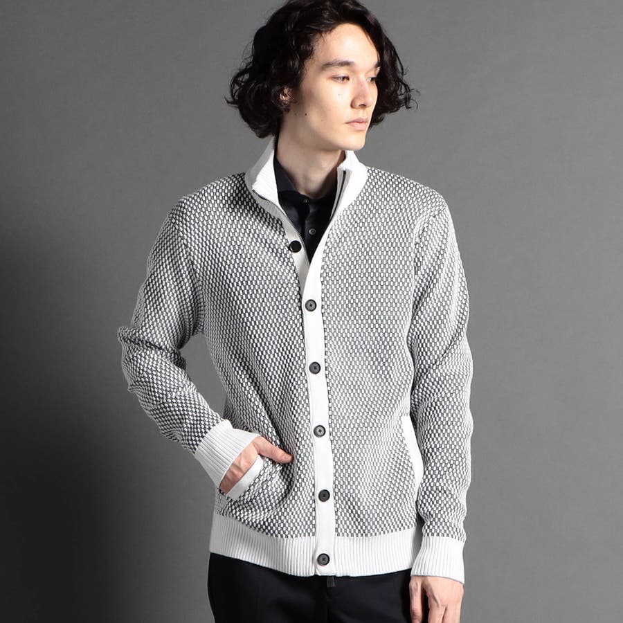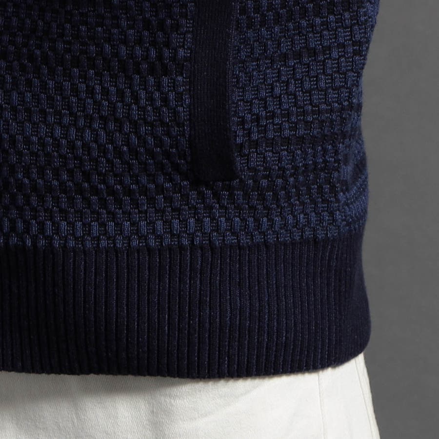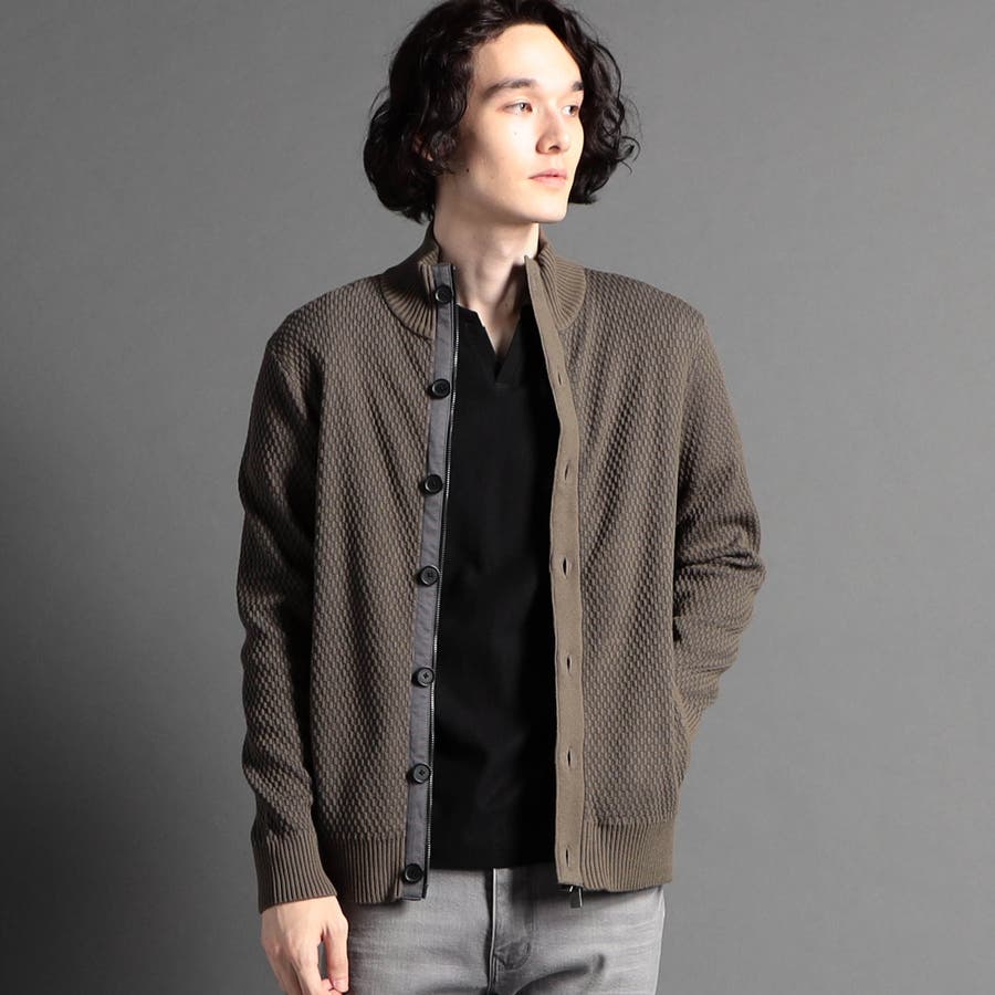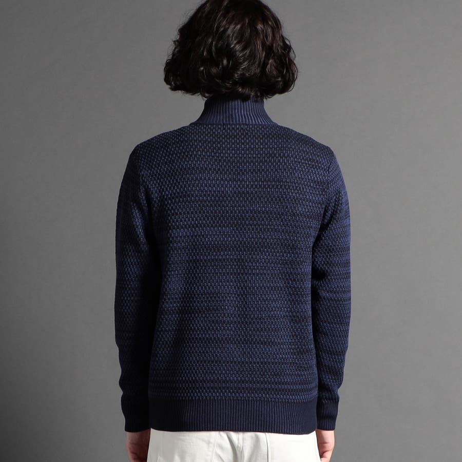 しっかりと立つ度詰めリブのスタンドカラーが特徴のニットブルゾン。