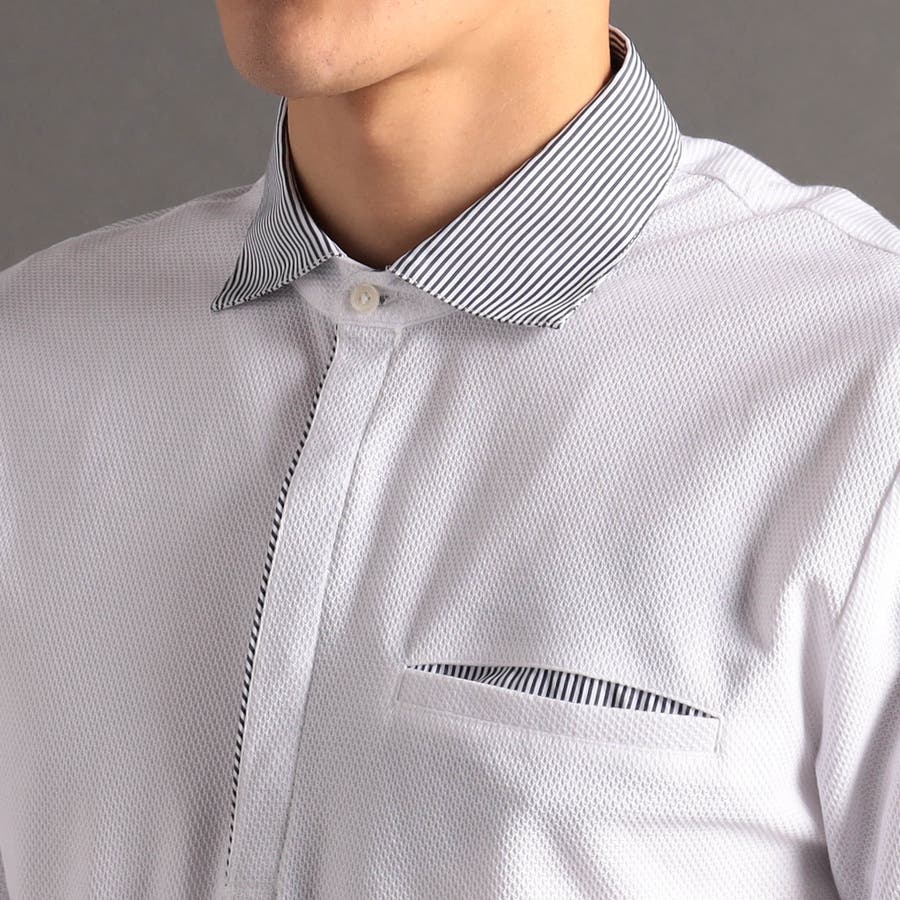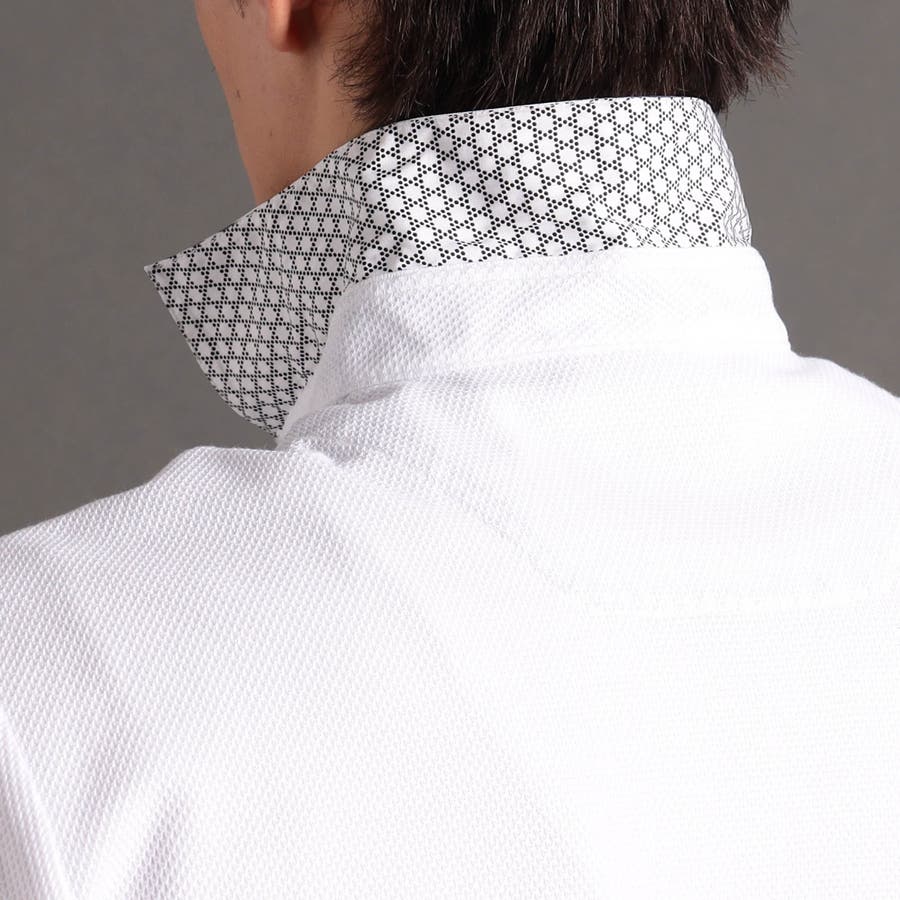 比翼デザインの前開き・袖口裏・胸ポケットから覗くストライプ柄、着用時には見えない襟裏・背当てのジオメトリック柄がさり気ないポイントになります。