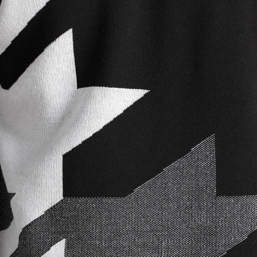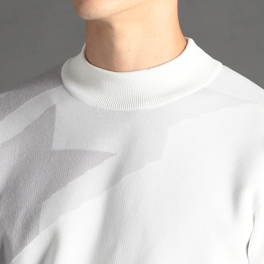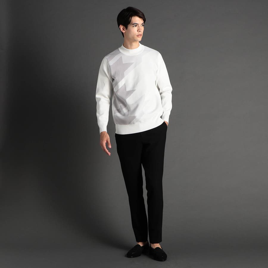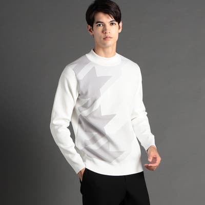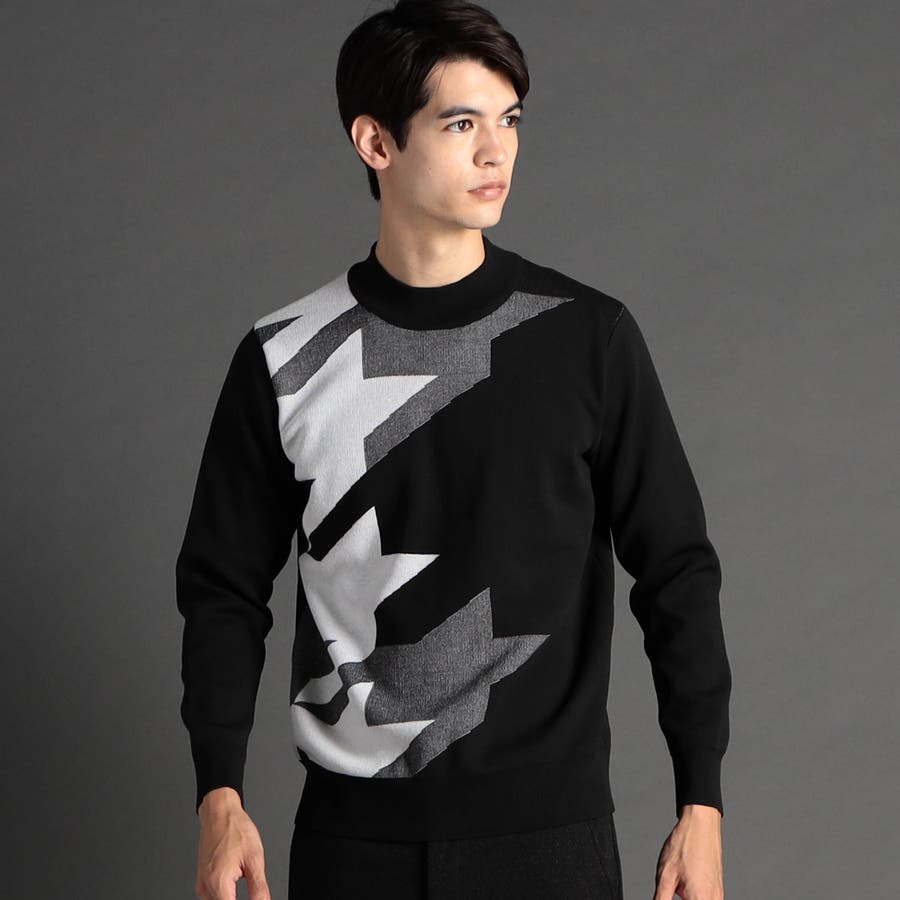 インパクトのあるハウンドトゥース柄が特徴のモックネックニット。