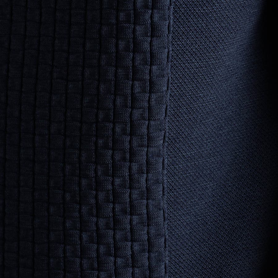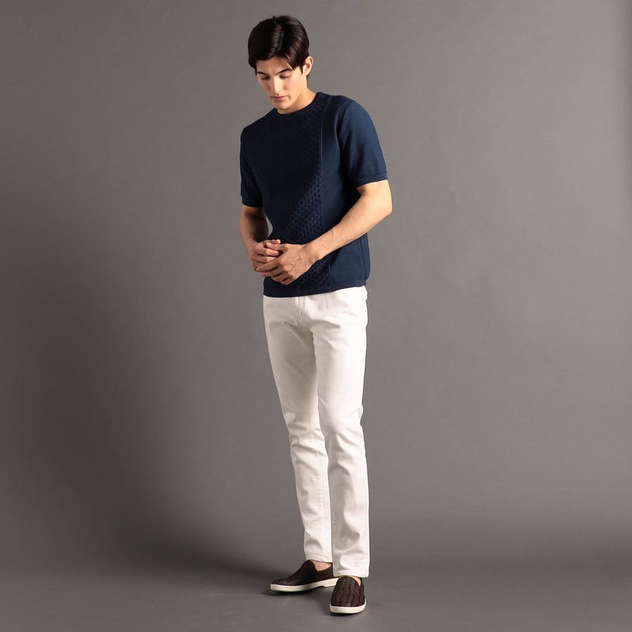爽やかなメッシュ組織のタックカノコ編みをベースに、フロントに存在感のあるバスケット柄を配置したアシンメトリーデザイン。