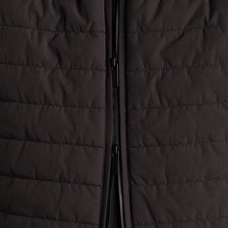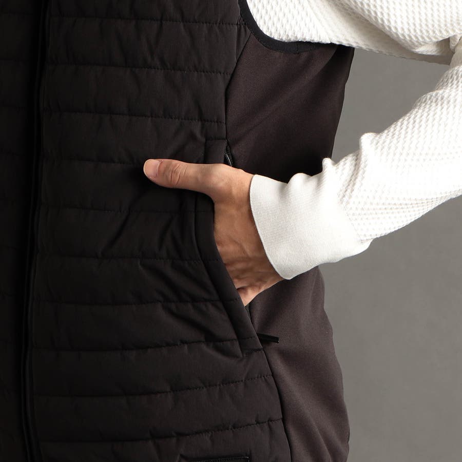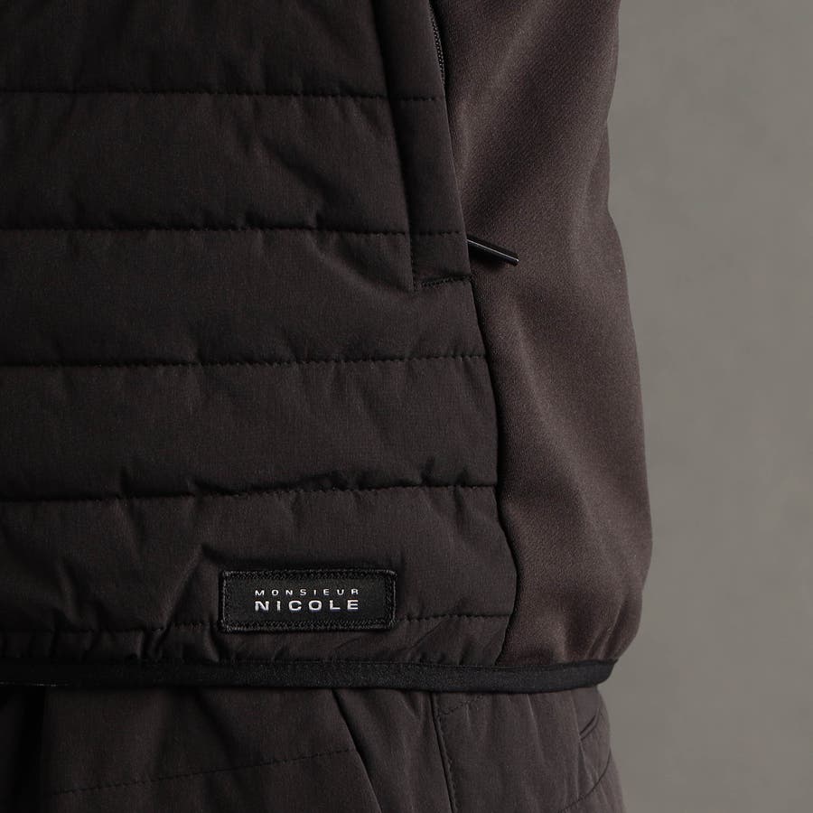 高めのスタンドカラー、細腹の切り替え、裾部分のMONSIEUR NICOLEロゴワッペンを装備したスポーティーなダウンベストです。