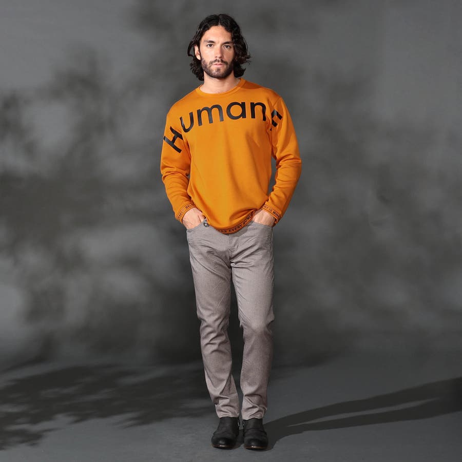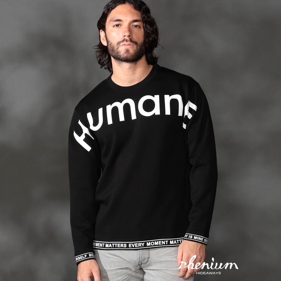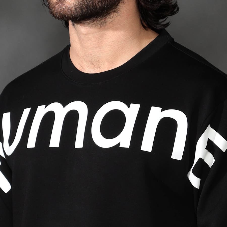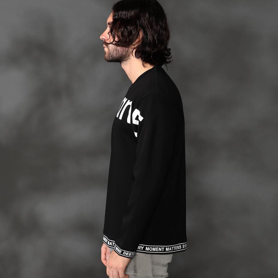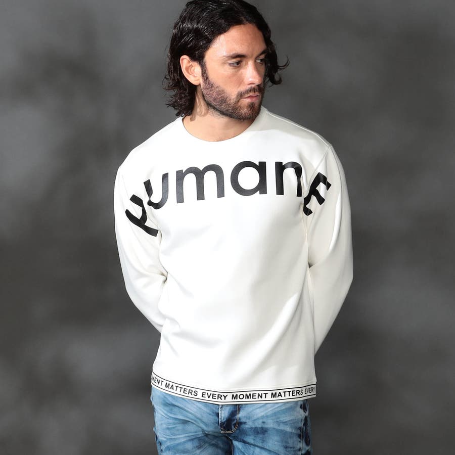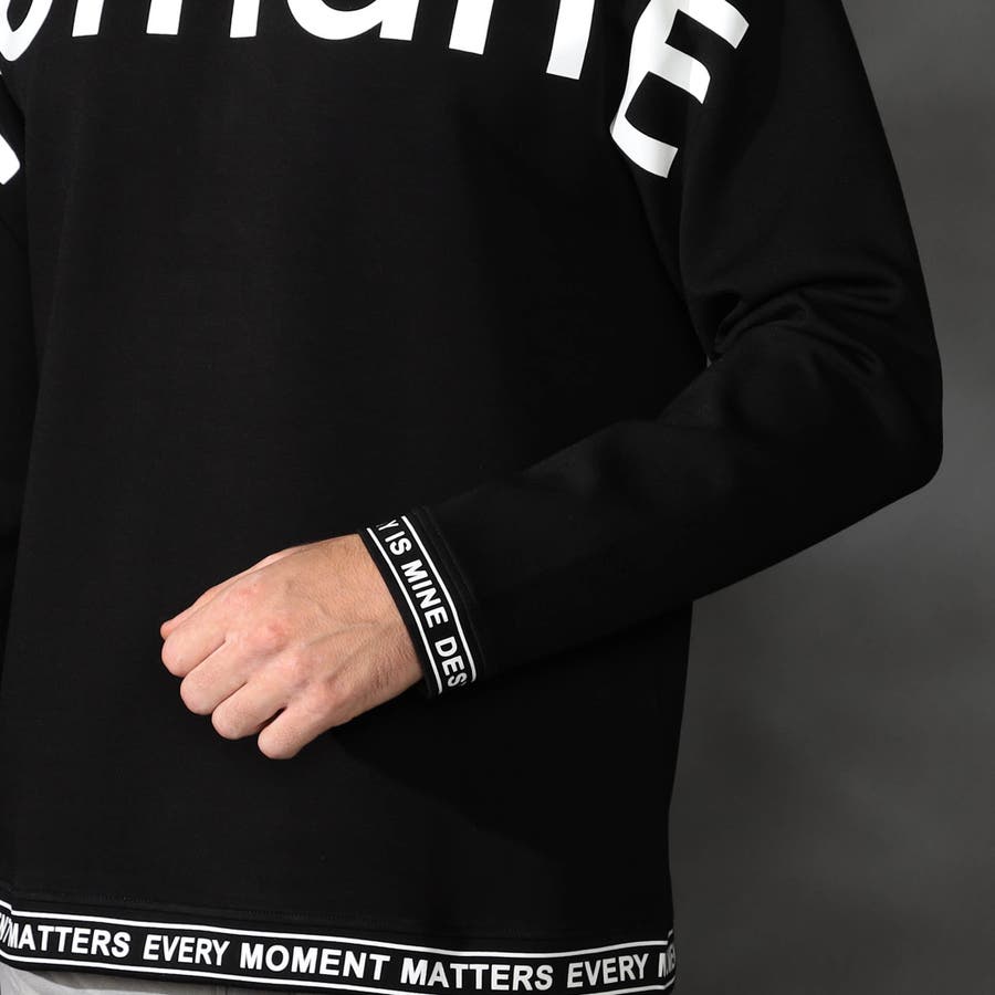 胸に配置したビッグロゴプリント、袖口、裾にライン入りのロゴプリントがアクセントになっています。