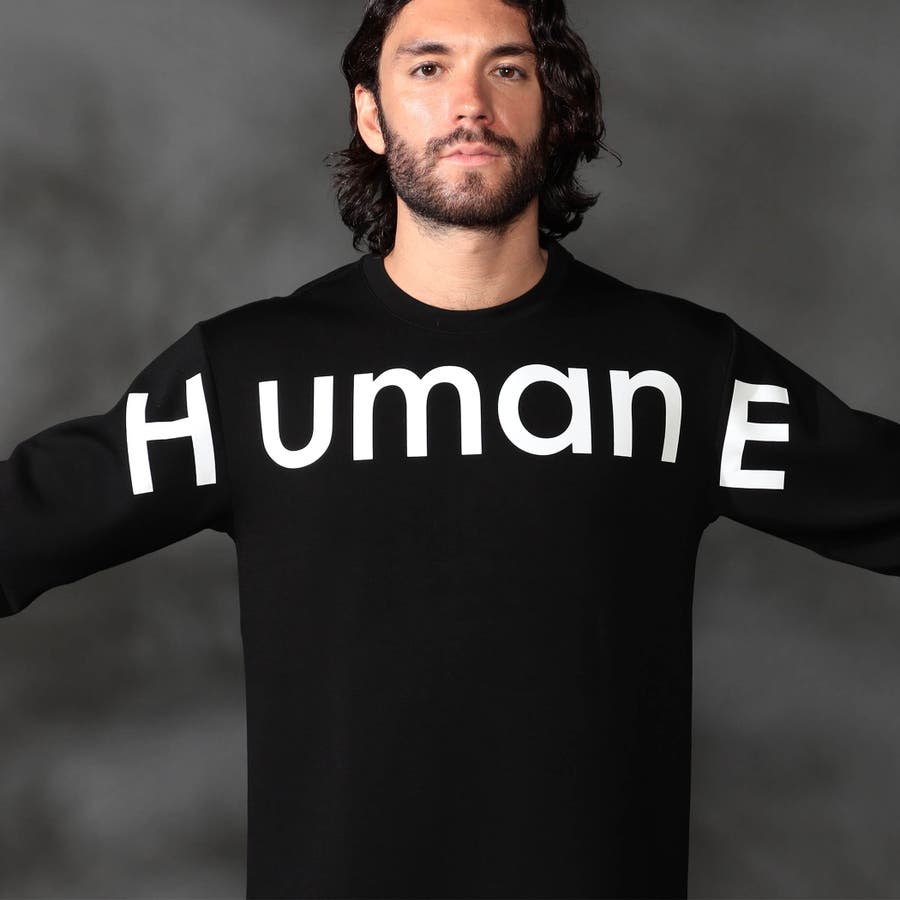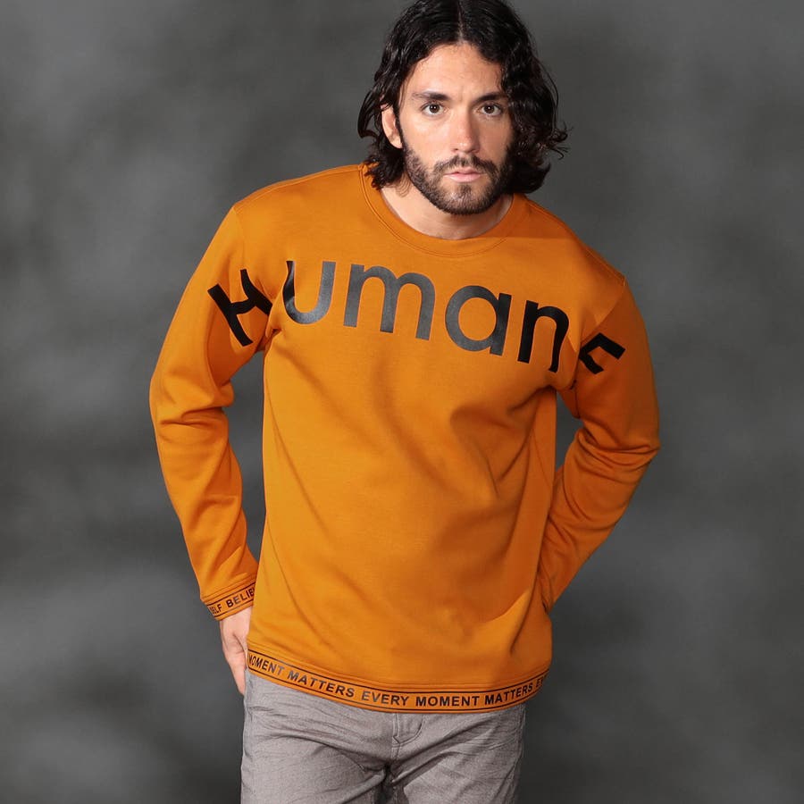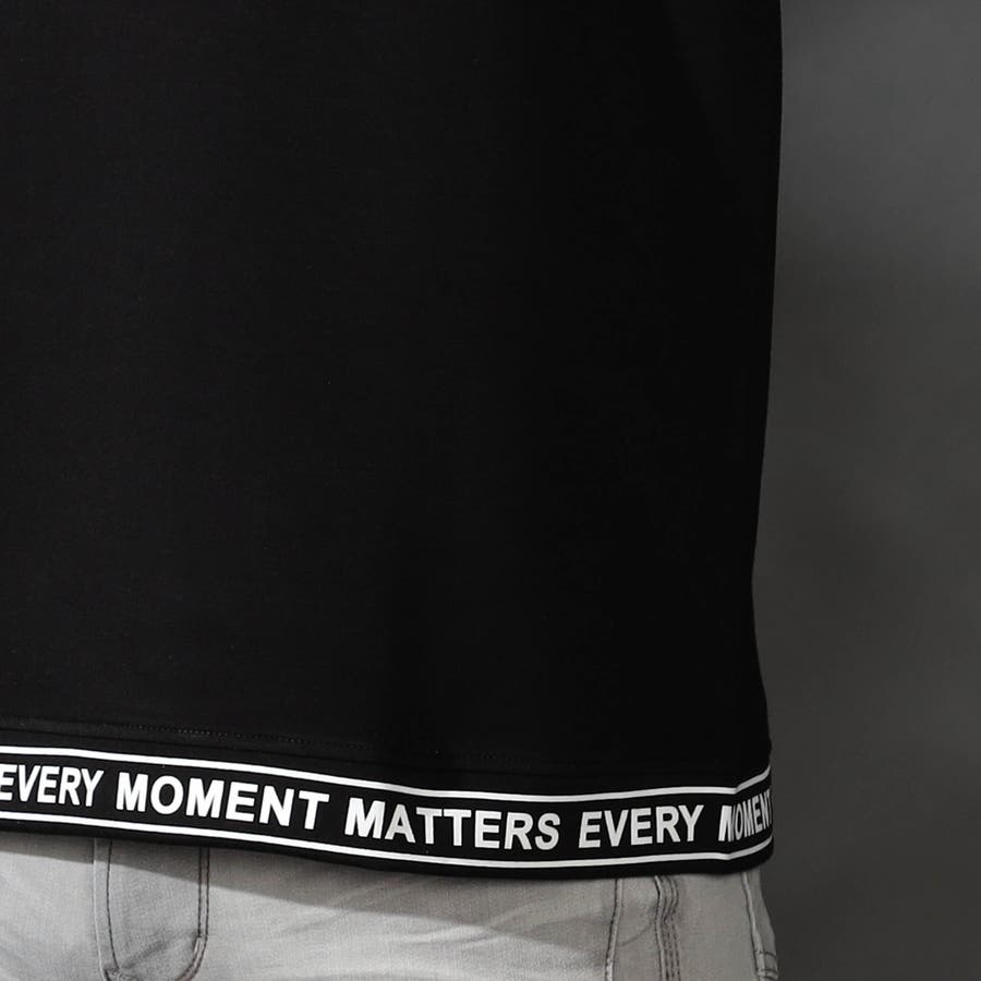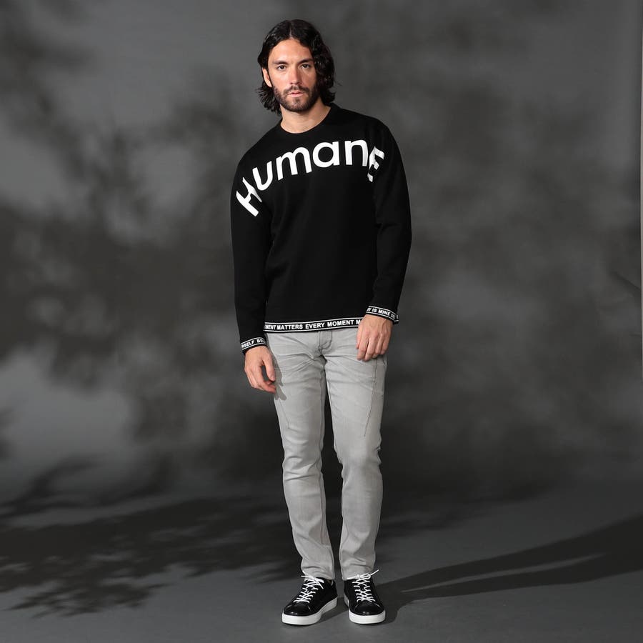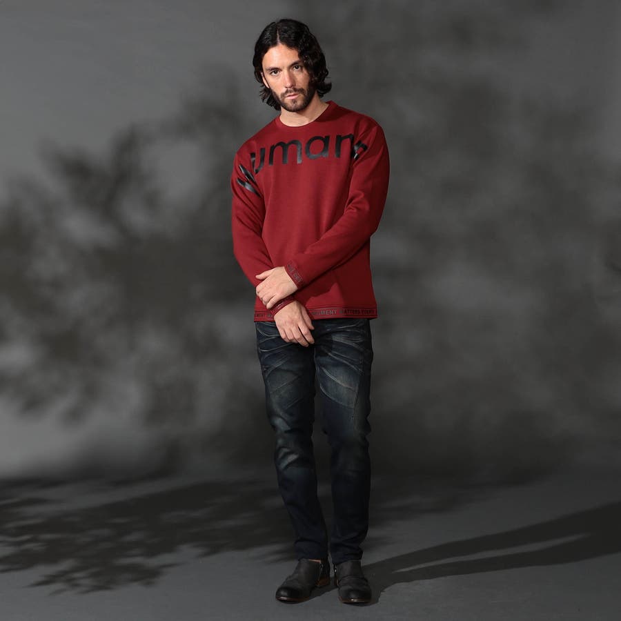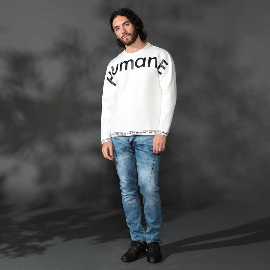胸に配置したビッグロゴプリント、袖口、裾にライン入りのロゴプリントがアクセントになっています。
