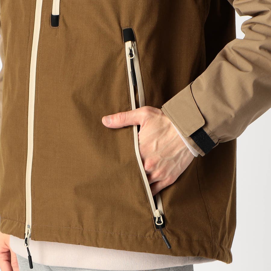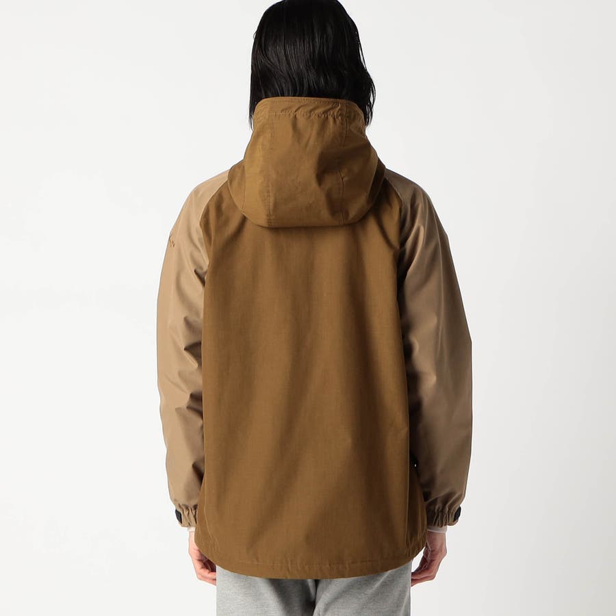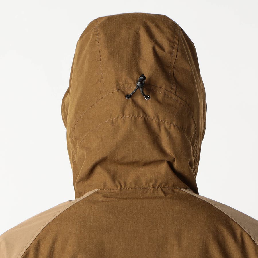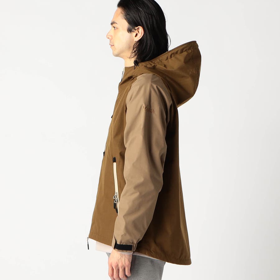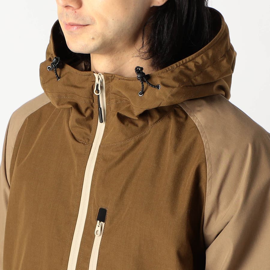 毎シーズン好調のNANGA別注オーロラダウンジャケットをベースに通年で着用出来るダウンが入っていないシェルブルゾンをNANGAの代名詞的な素材でもある難燃素材アラミド繊維を使用した”TAKIBI”素材を使って作成。フロント、ポケットのファスナーはYKK社製の止水ファスナーを使用、フードの廻りにはプラスチックワイヤーを入れる事でフードに立体感と安定感、防風性が出るようにしています。フードには3か所、裾には2か所コードストッパーでコードを絞って調整する事も出来るのでコーディネートに合わせてシルエットも調整する事も可能です。ブラックのネームがGrandPARKの別注だけの特別な配色になっています。裏地はNANGAの寝袋でも使用している40デニールのナイロンを使用。アラミド繊維が入っている事で他にはない独特の生地の色目でアウトドアだけではなく街着としてもコーディネートしやすくなっています。インナーダウンとのコーディネートで冬でも着用する事が出来ます。
