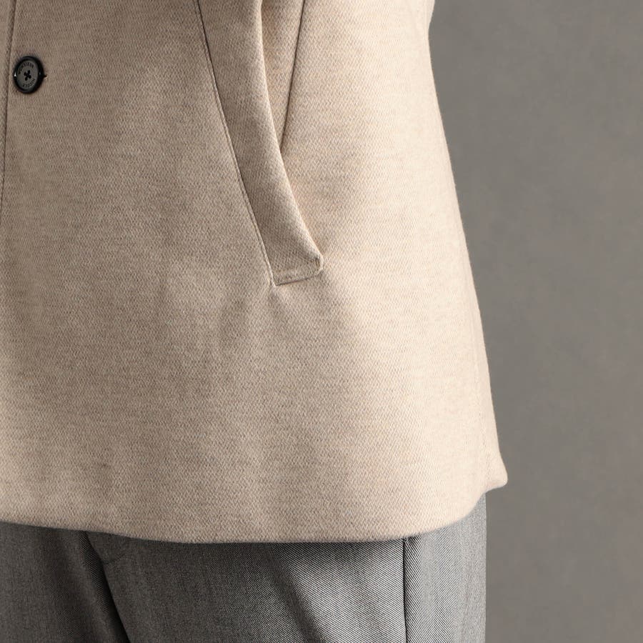 メランジジャカード素材にポリエステル・レーヨン天竺をボンディングして防寒性を高め、適度な張りを持たせたハイブリッドジャージ。