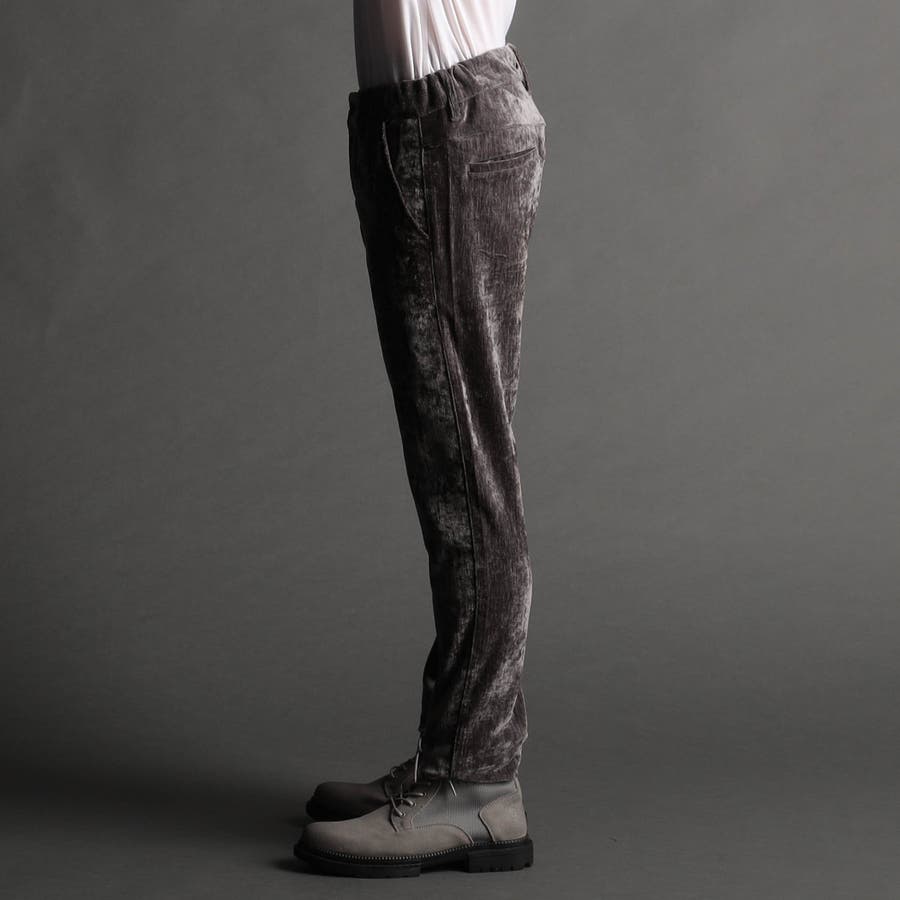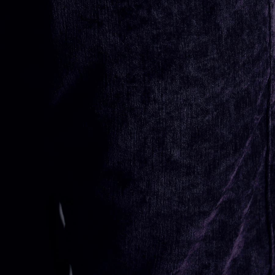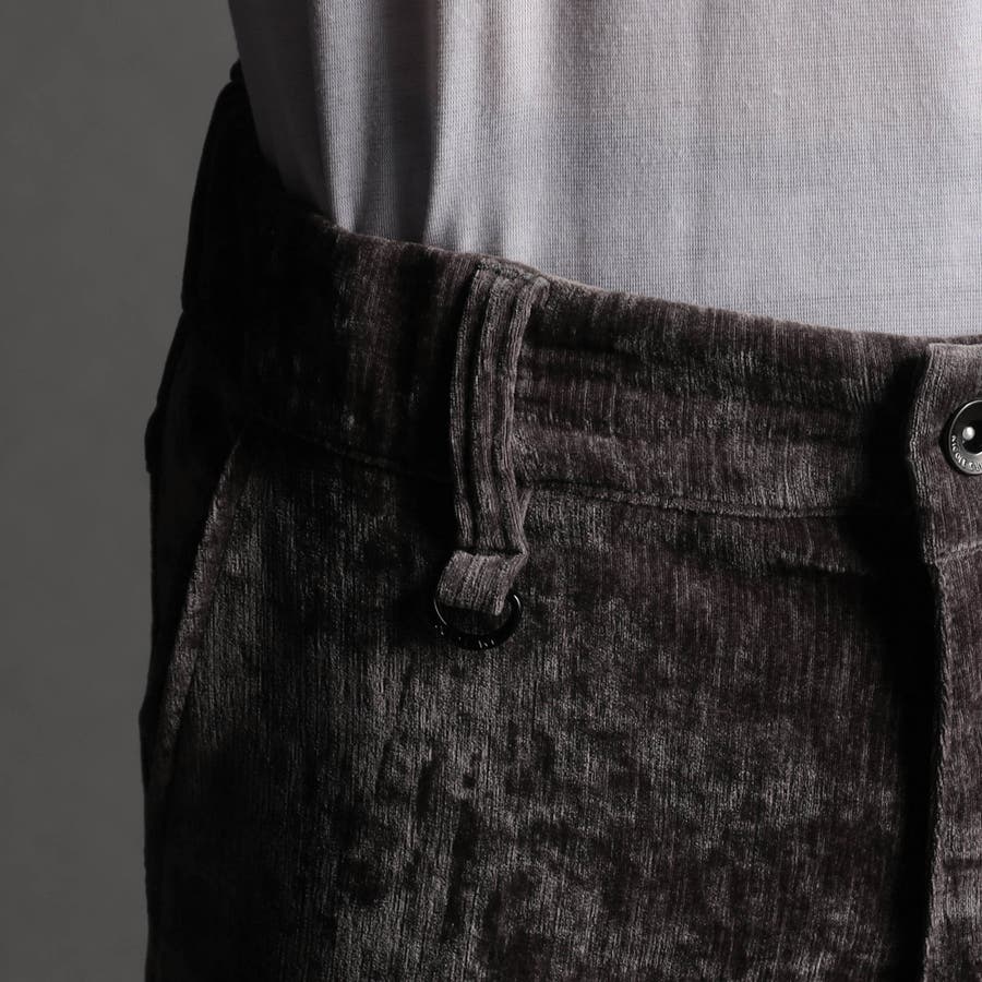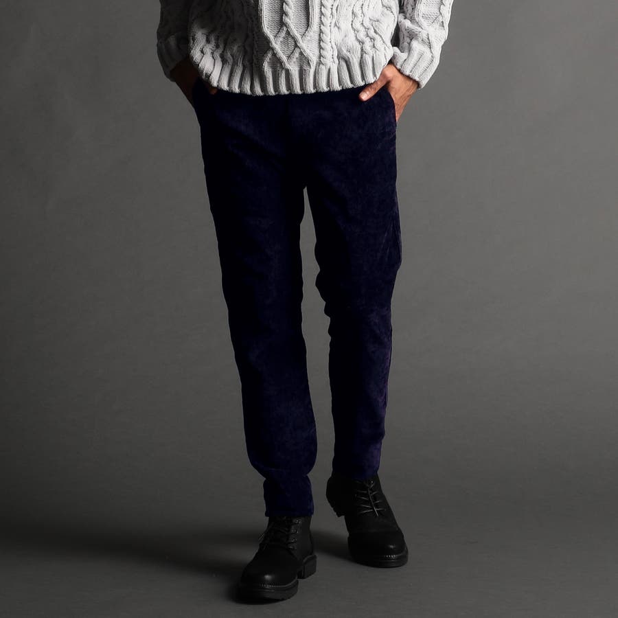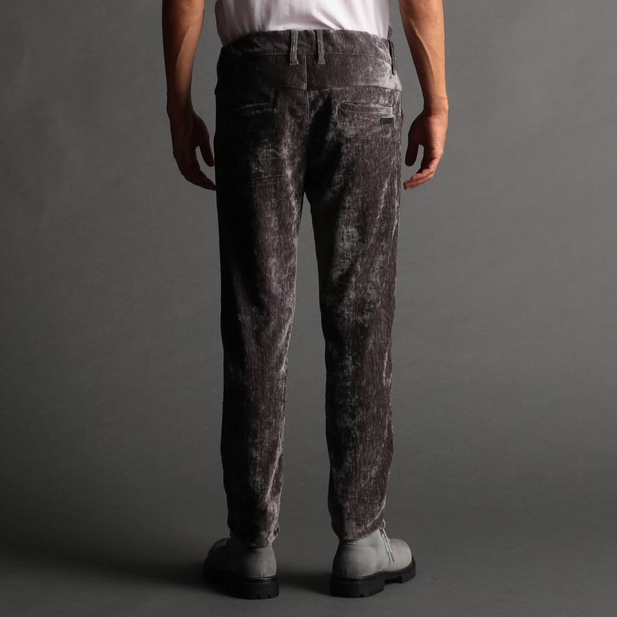 畝(ウネ)の細かい合繊コーデュロイ素材です。タテストレッチの生地をヨコ伸びする様に裁断して製品にしています。クラッシュベロアの様な光沢感と柔らかい風合い、裏側も起毛しているので肌触りがとても良く、ストレッチも効いていますので穿き心地も抜群です。