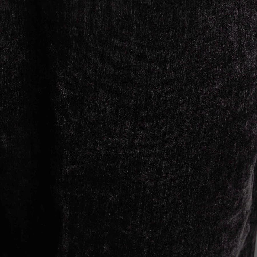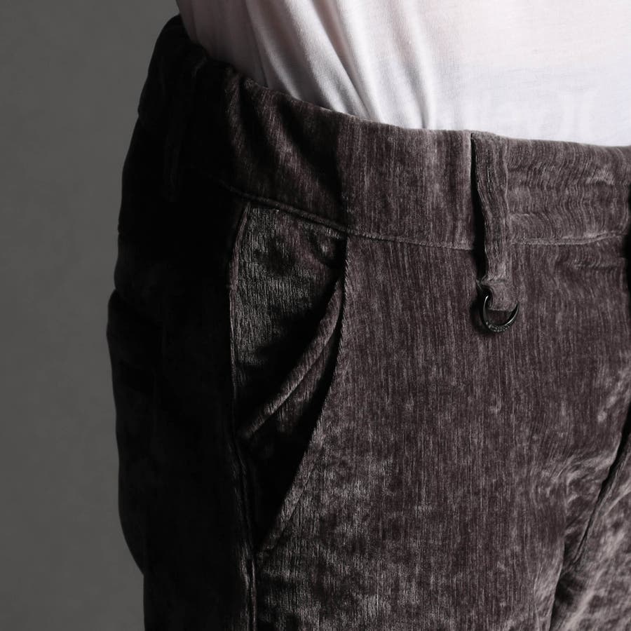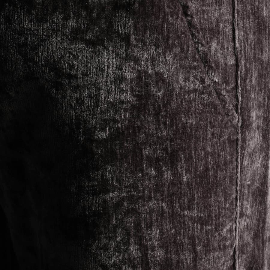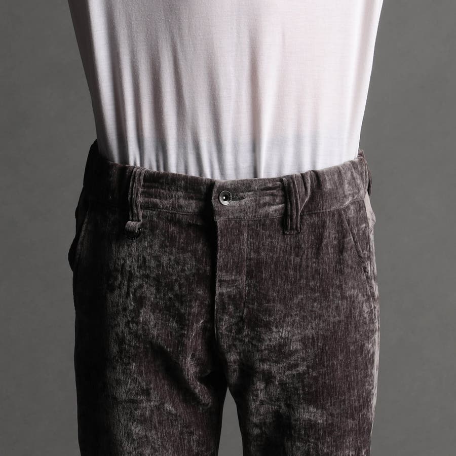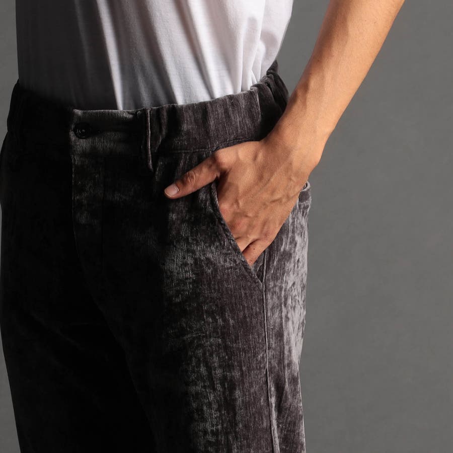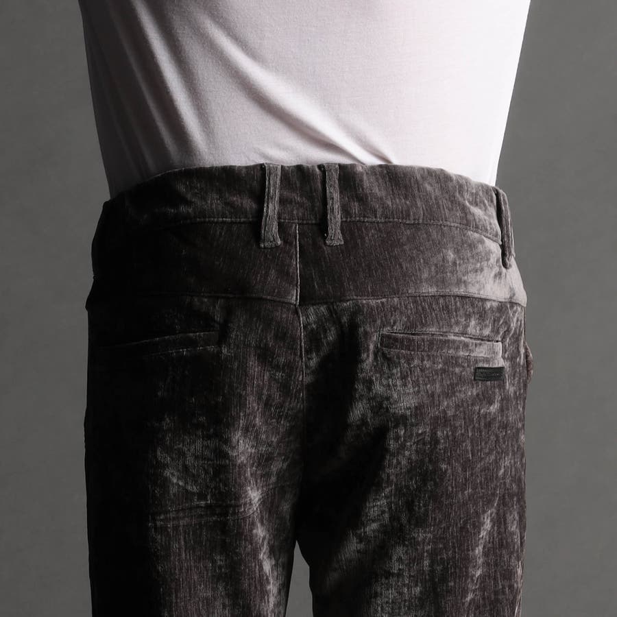 畝(ウネ)の細かい合繊コーデュロイ素材です。タテストレッチの生地をヨコ伸びする様に裁断して製品にしています。クラッシュベロアの様な光沢感と柔らかい風合い、裏側も起毛しているので肌触りがとても良く、ストレッチも効いていますので穿き心地も抜群です。