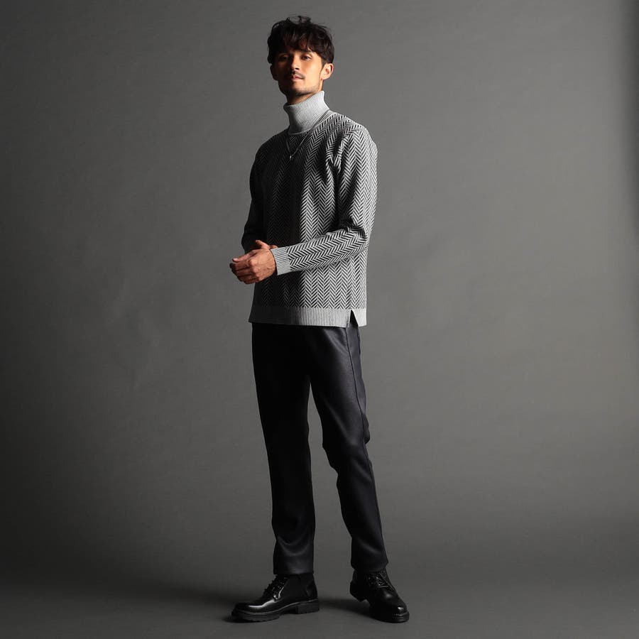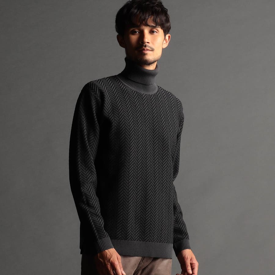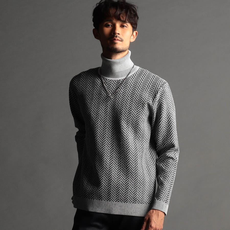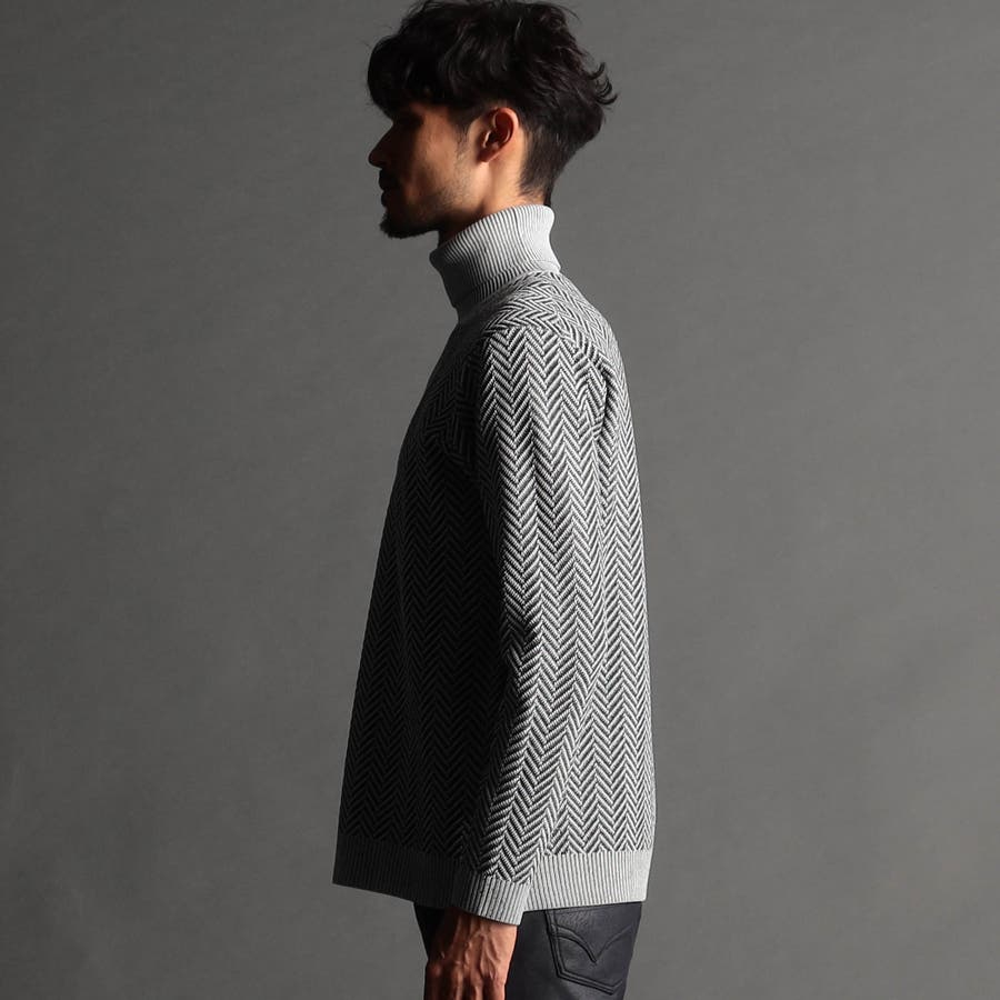 身頃部分の大き目なヘリンボン柄がインパクトのあるタートルネックニット。カフス、衿部分を総針リブにする事で全体の印象を引き締めています。