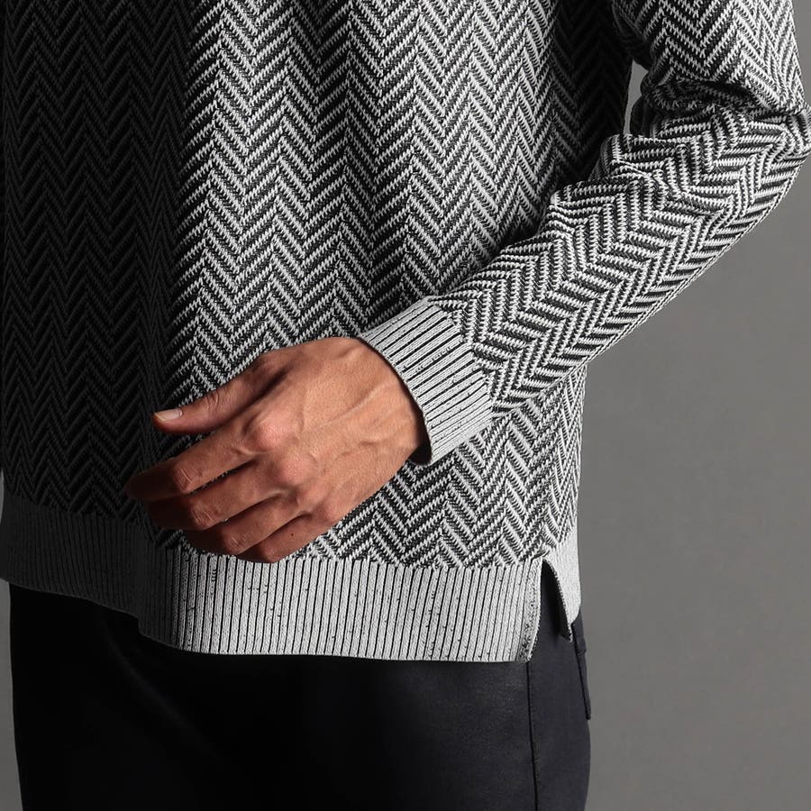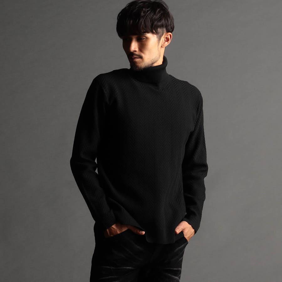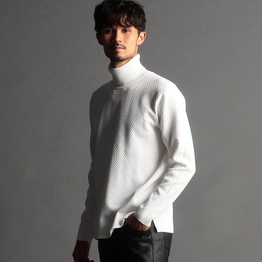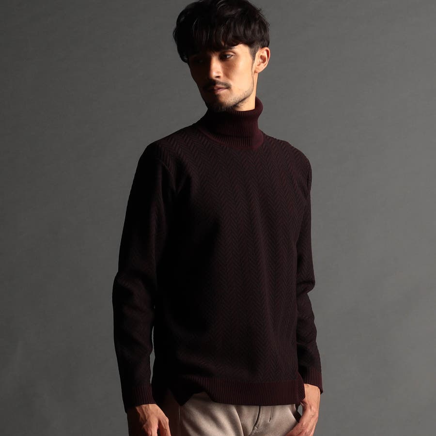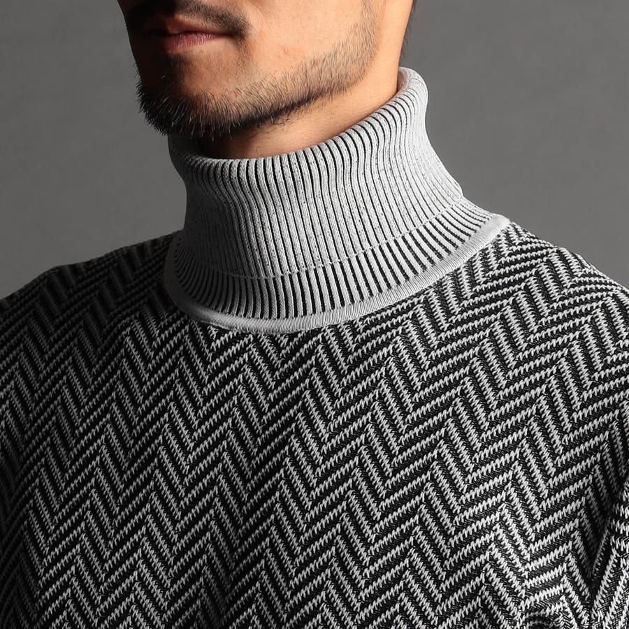 身頃部分の大き目なヘリンボン柄がインパクトのあるタートルネックニット。カフス、衿部分を総針リブにする事で全体の印象を引き締めています。