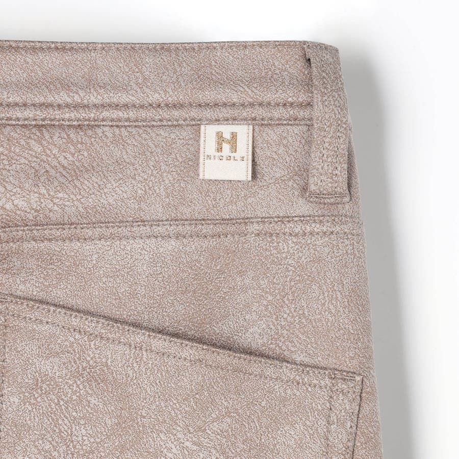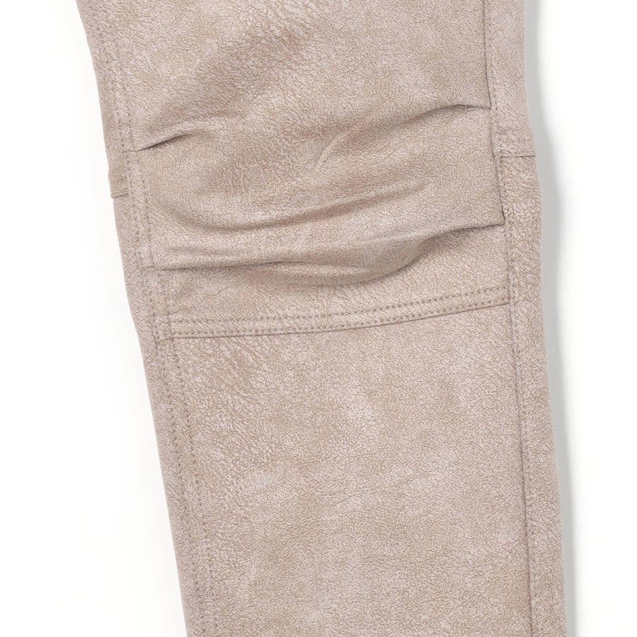 ポリエステルのマイクロファイバーで織られたカットソーポンチ素材をスウェード調に起毛し、更に細かいムラ柄のプリントを施しています。ジャージ素材ならではの横張り感・ストレッチ性はそのままに、マイクロファイバーを起毛したソフトな風合いに同色系のプリントを施す事でレザー調の質感を高めています。