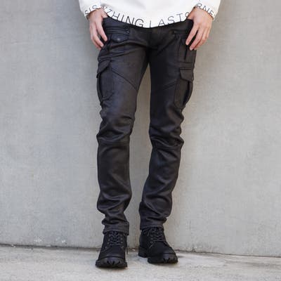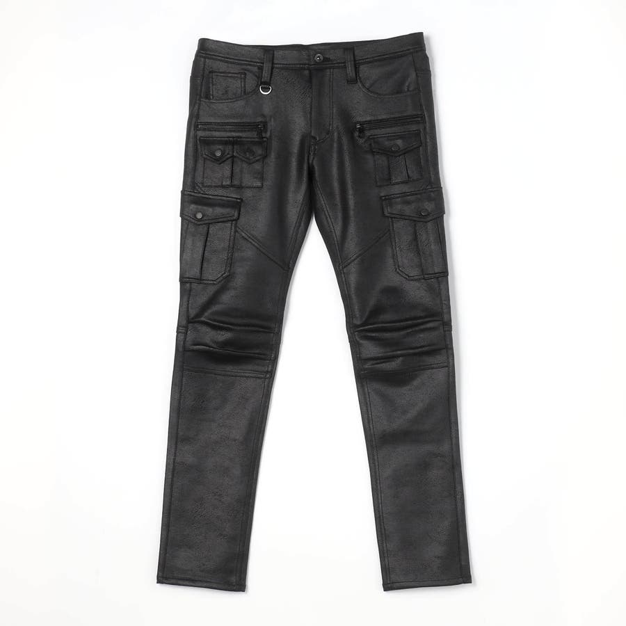 11ヶのポケットをバランスよく配したインパクトのある見た目のカーゴパンツ。脇のポケットを出来るだけ上にもって来ることで足長効果を狙っています。