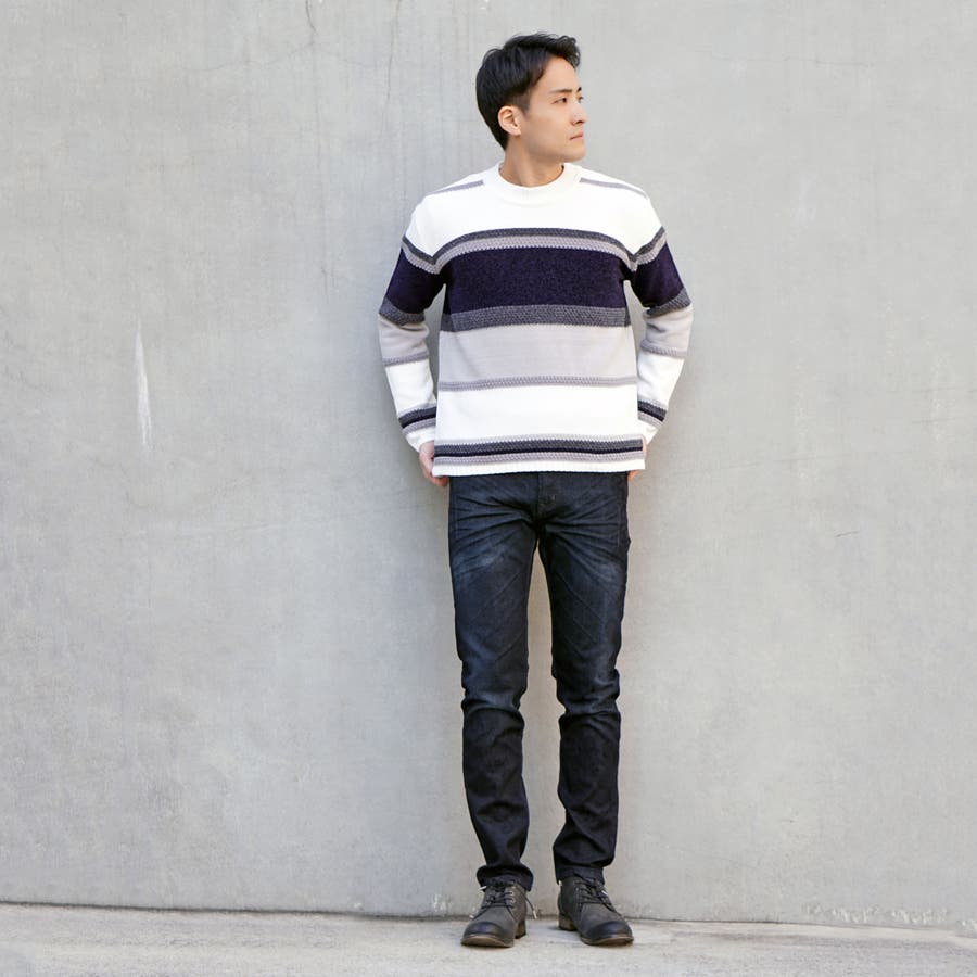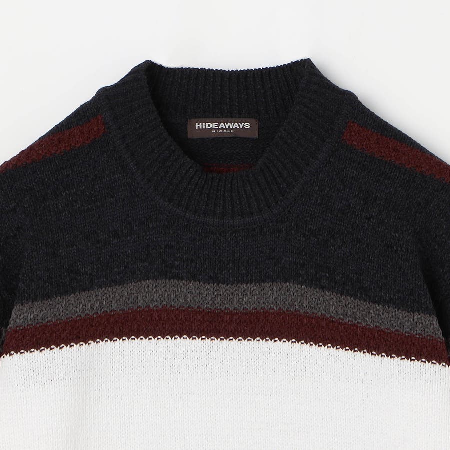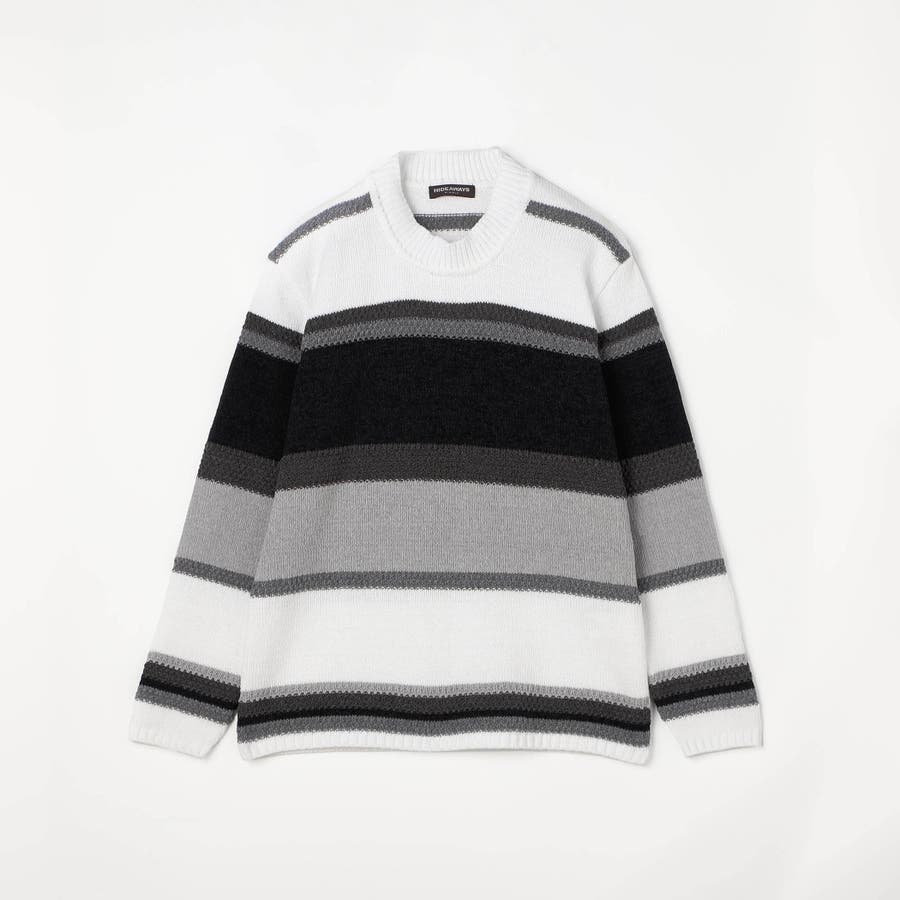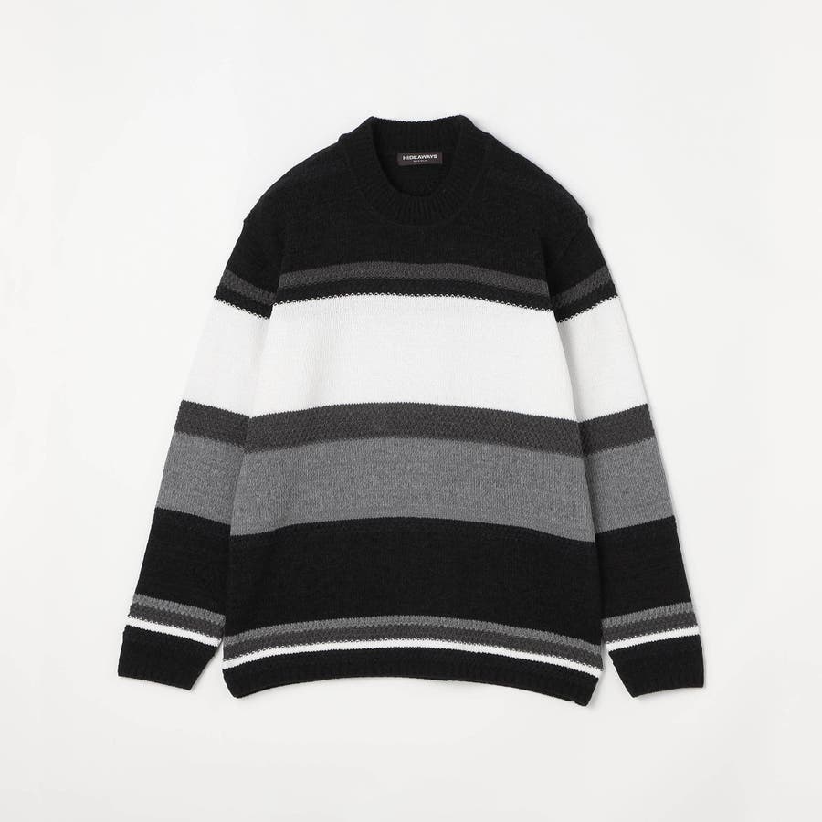 特徴的なパネルボ-ダ-柄が目を引くデザイン。洗練された編地配色切替で程良いカラ-アクセントがポイントになっています。モックネックなので使いやすく、暖かい雰囲気と柔らかな素材感のニットです。インナ-にも使いやすいのでダウンなどと合せてのカジュアルスタイルにも、ロングコ-トなどと合せたキレイ目スタイルにも相性が良い万能ニットです。
