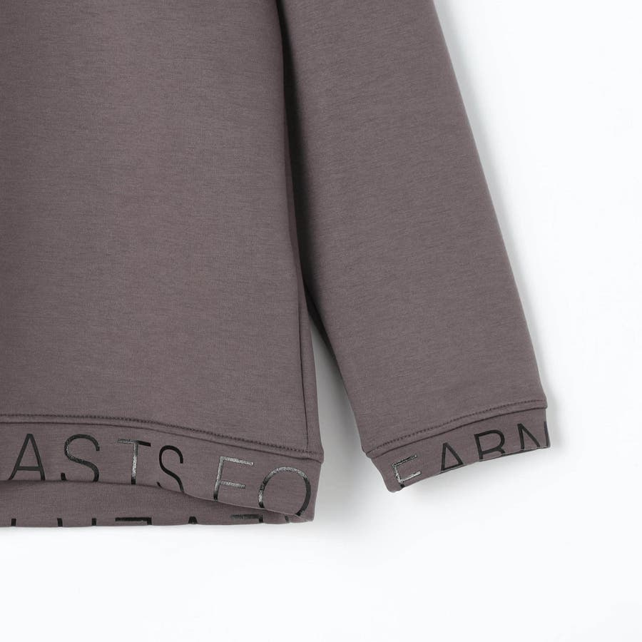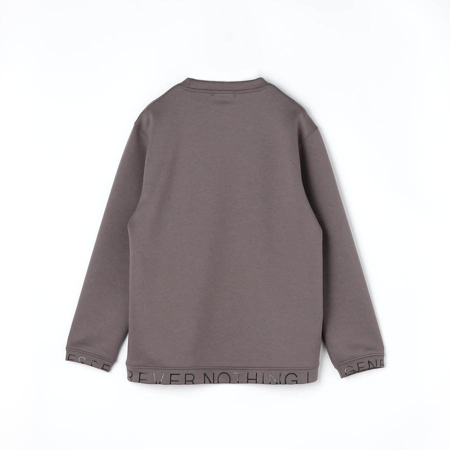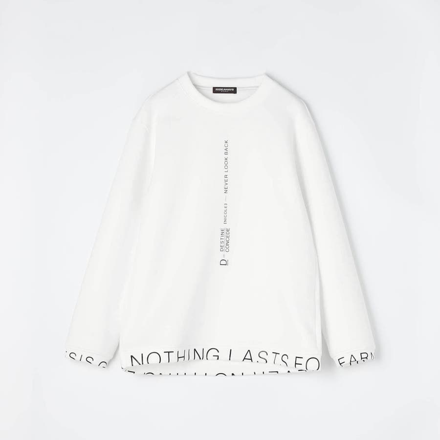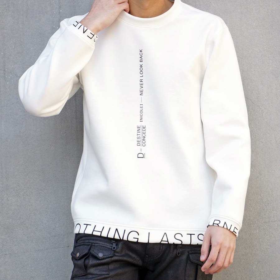 裾、袖口切り替えのプリントデザインで少しゆとり感を出した大人な雰囲気のスウェットになります。モックネック気味に少し首に沿わせた衿、ゆるめのシルエット、ロゴプリントがトレンド感溢れる一枚です。