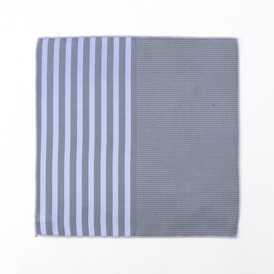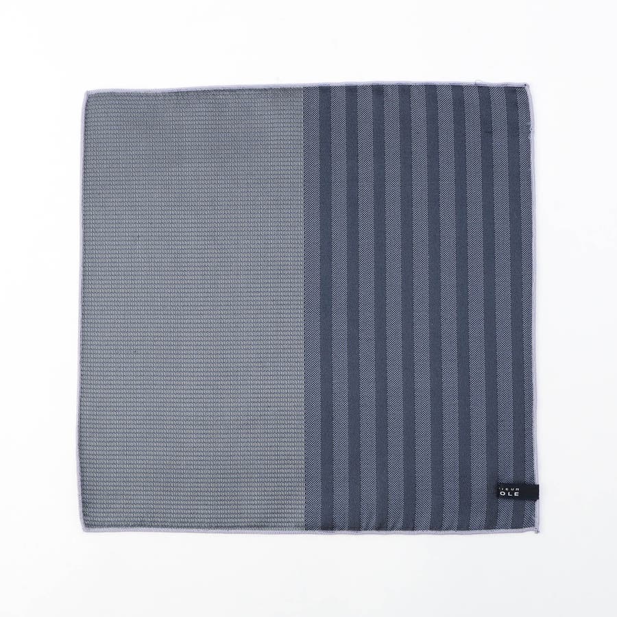 メランジストライプとピンドットを組み合わせ2面使える仕様が特徴のジャカードチーフ。