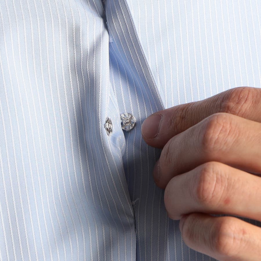 第1釦と第2釦の間にスナップ釦を付けているので、ノータイド時の胸元の開きをバランス良く演出します。