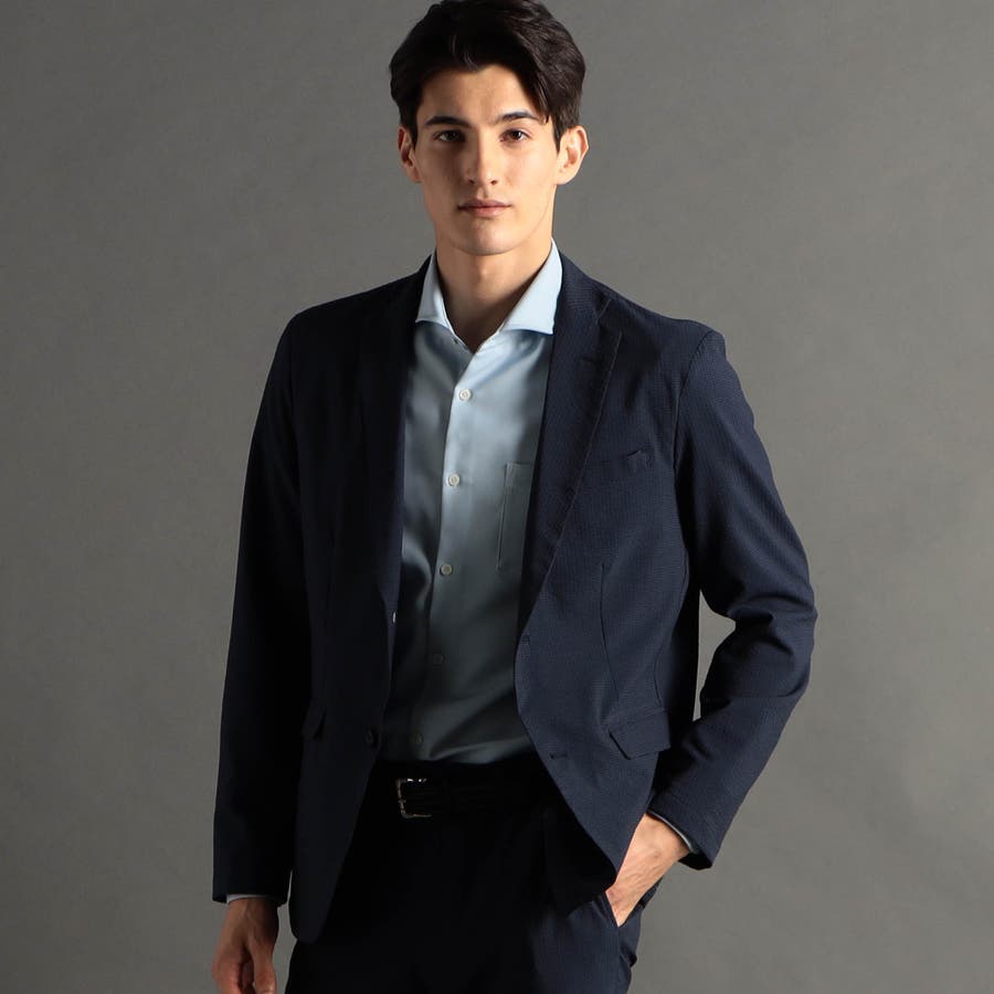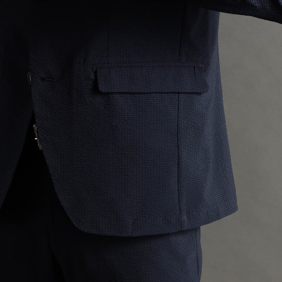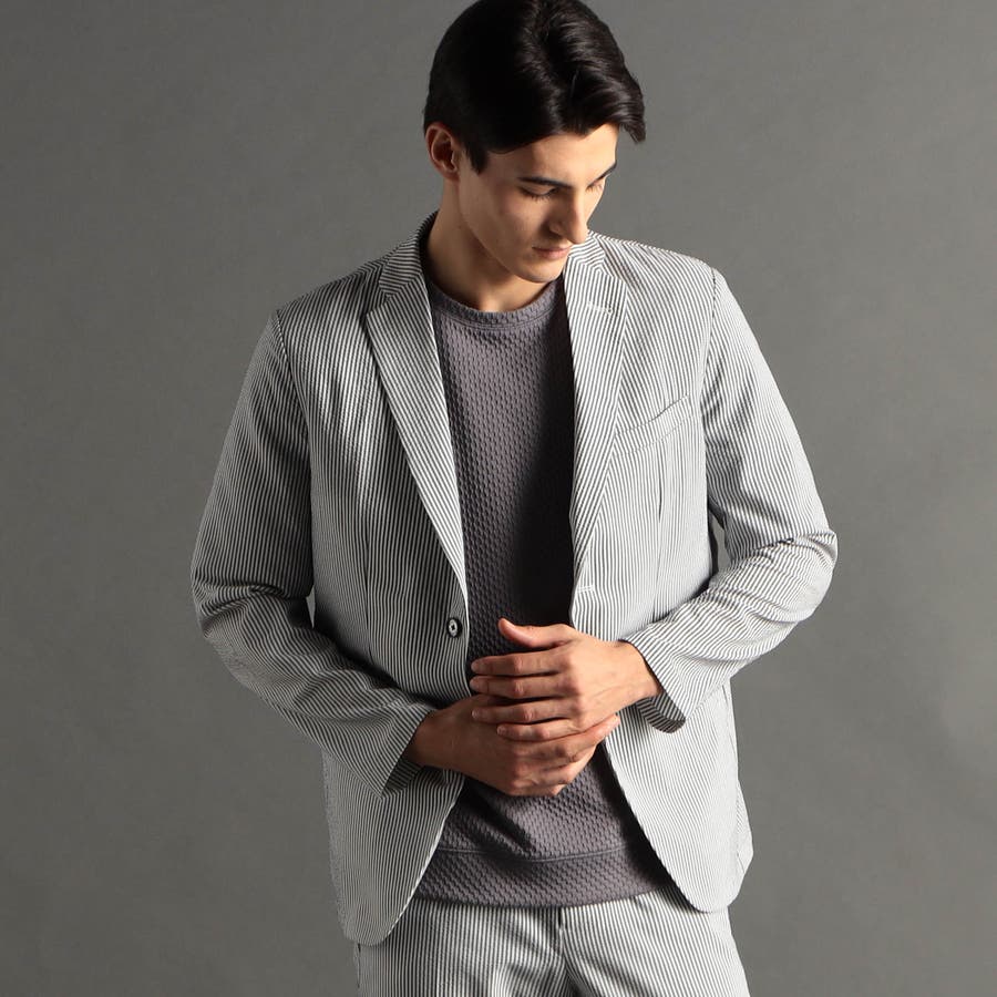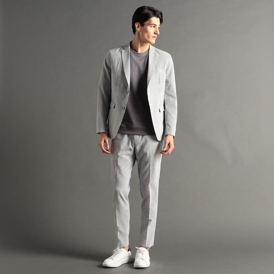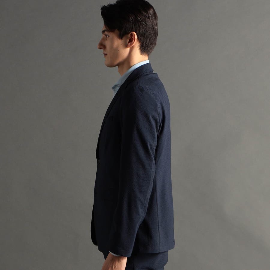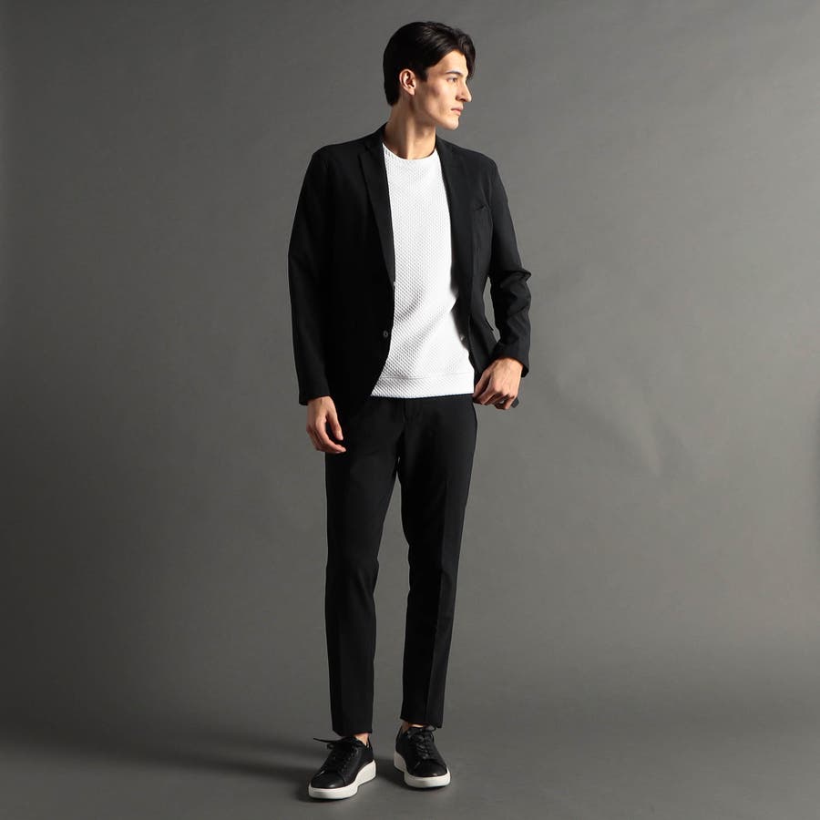 ミニマルなナローラペルに、ややスクエアラウンドしたフロントカットのベーシック二つボタンシングルジャケットです。ON/OFF兼用セットアップです。
